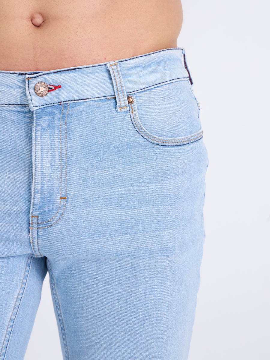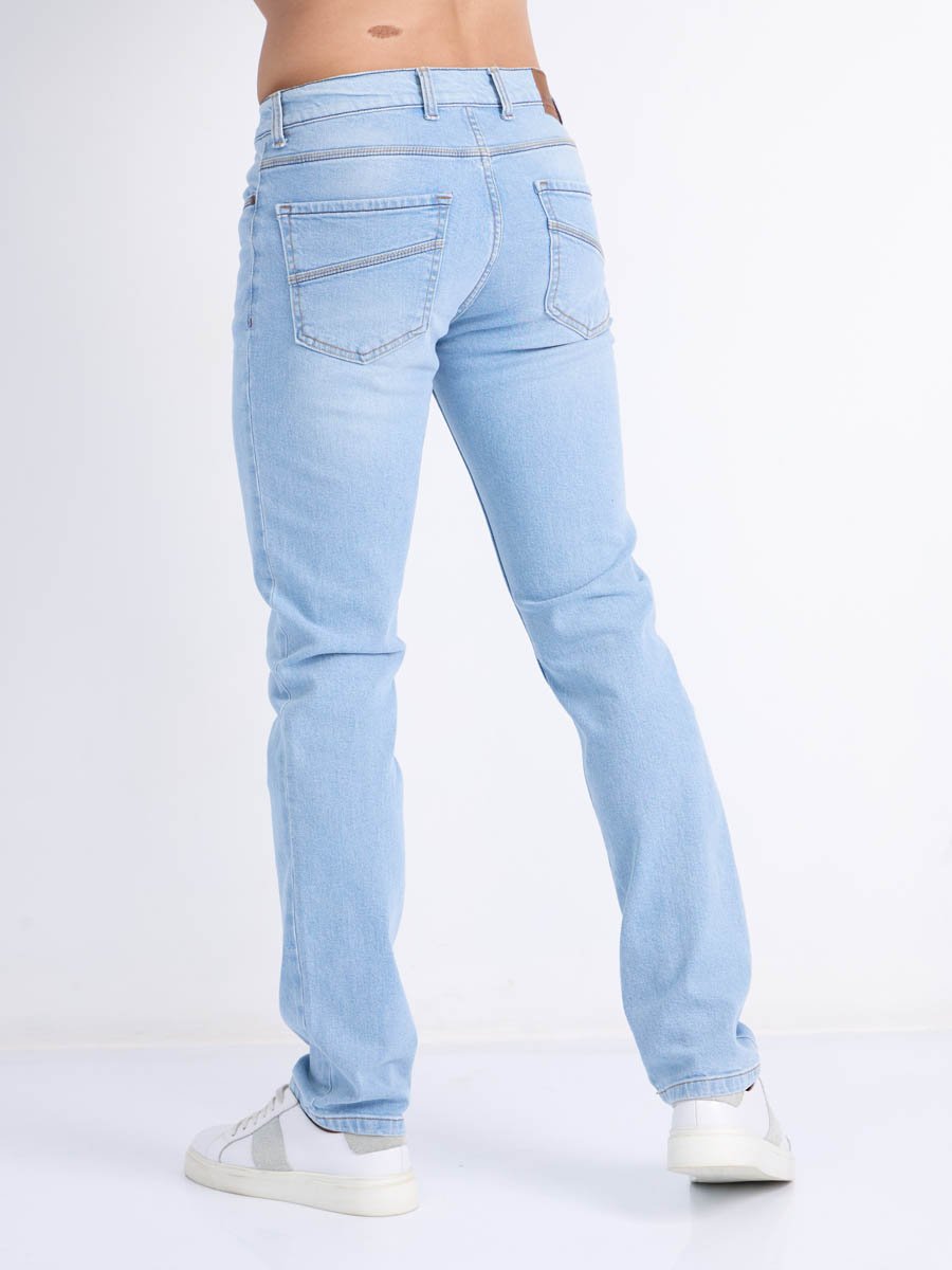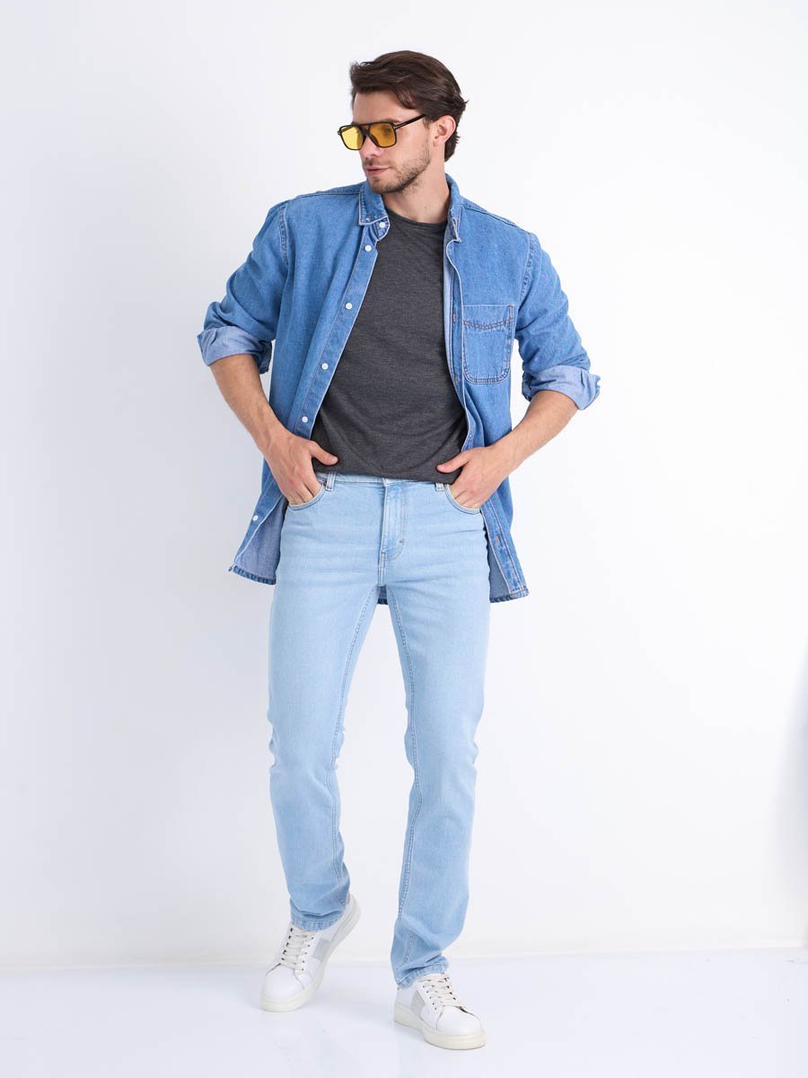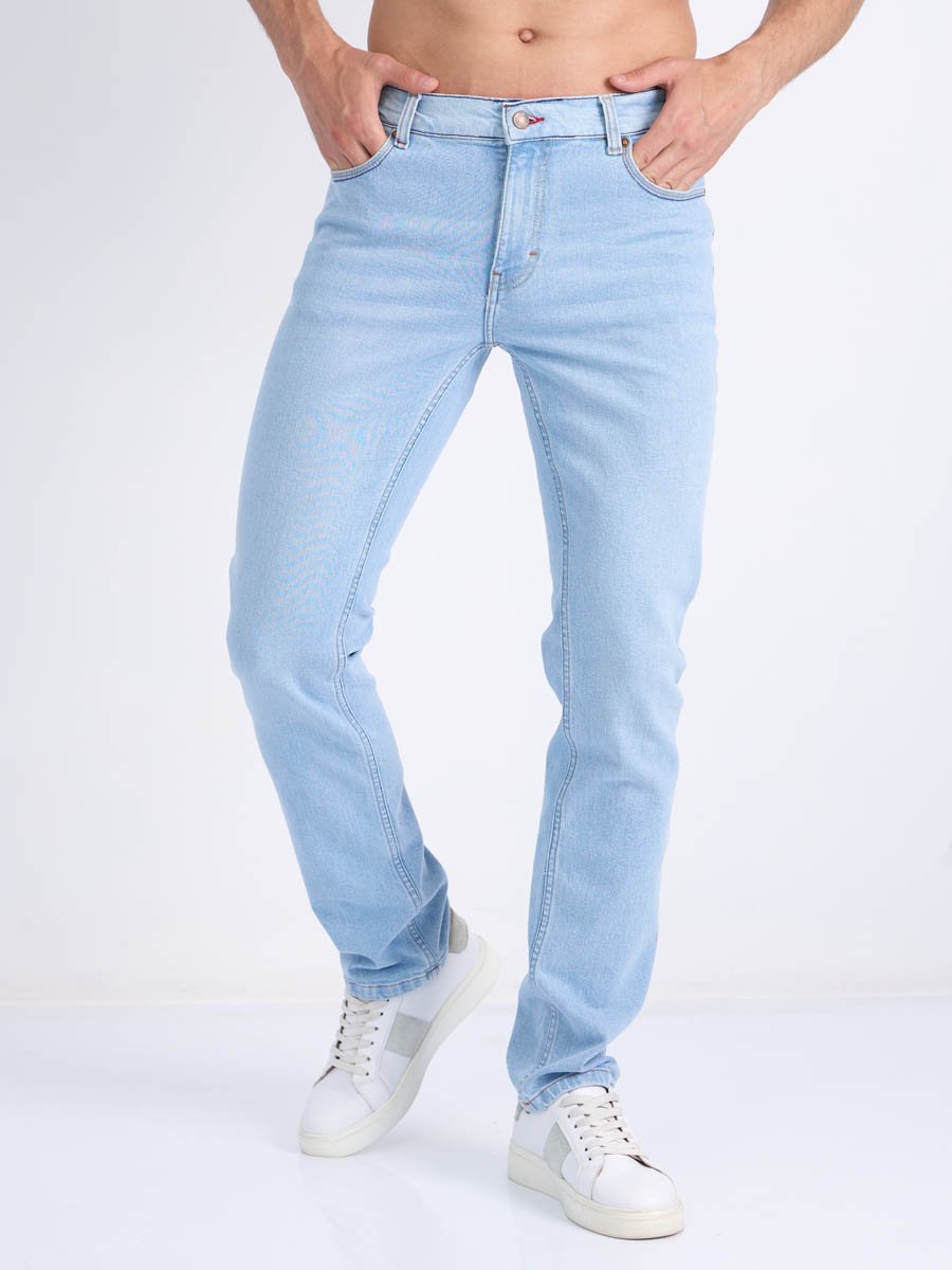 Мужские модные джинсы с пятью карманами. Посадка Slim fit (облегающие по бедру), средняя талия спереди, высокая сзади.. Застежка на молнии. Немного зауженные к низу. Выполнены из слабоэластичной ткани denim comfort stretch.Классическая светлая стирка "stone wash"с отбеливанием.