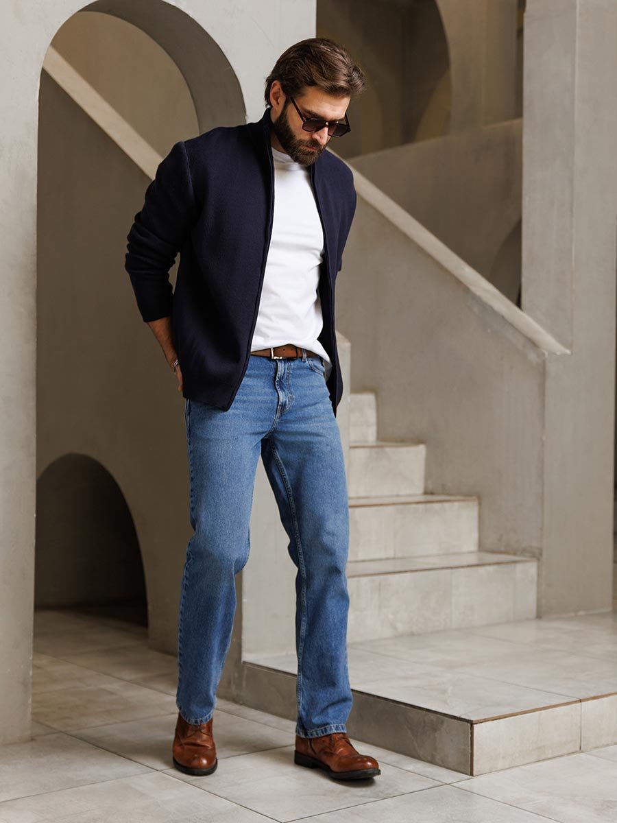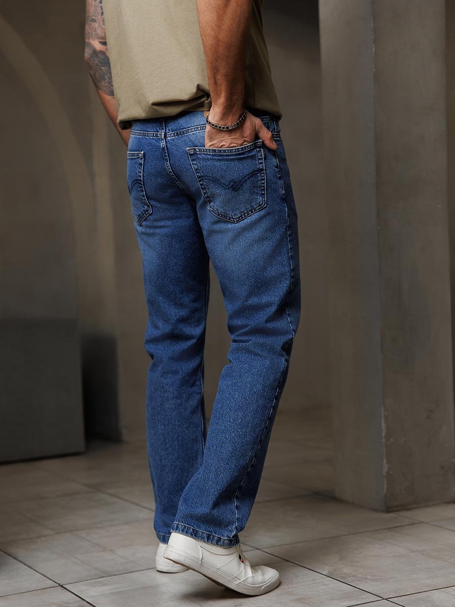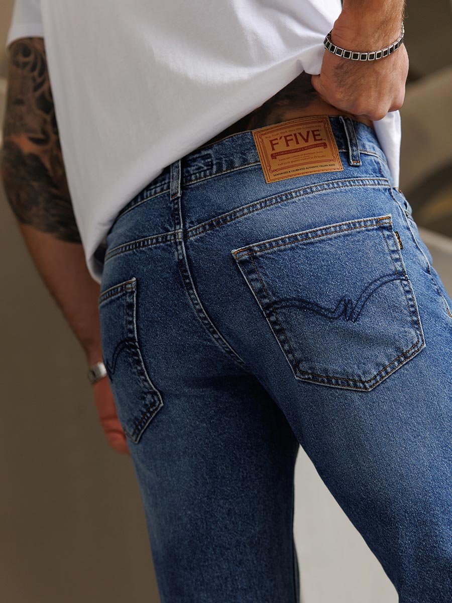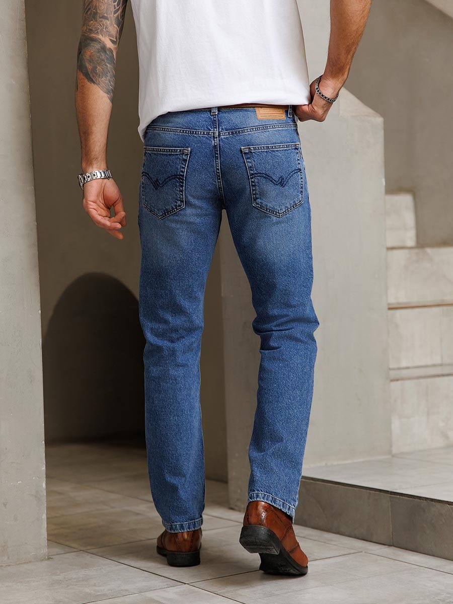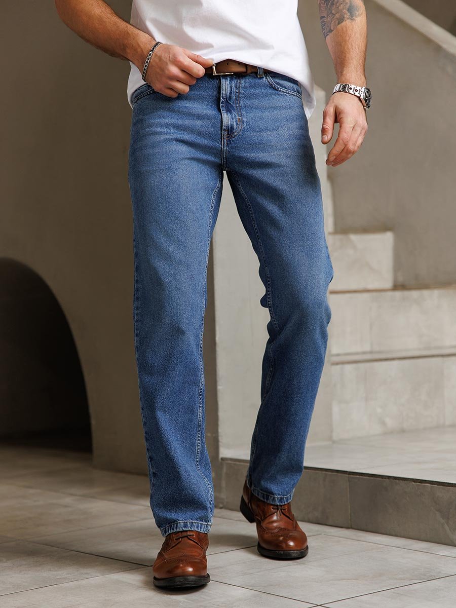 Мужские классические джинсы с пятью карманами. Посадка Regular fit (полуоблегающие по бедру), высокая талия. Застежка на молнии. Немного зауженные к низу. Выполнены из толстой ткани denim с переплетением BROKEN TWILL (broken twill -ломаная саржа - см фото). Средняя стирка с потёртостями и "усами" спереди и потёртостями сзади.