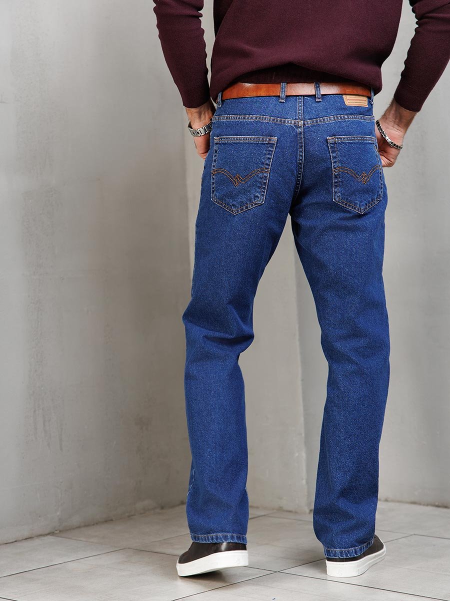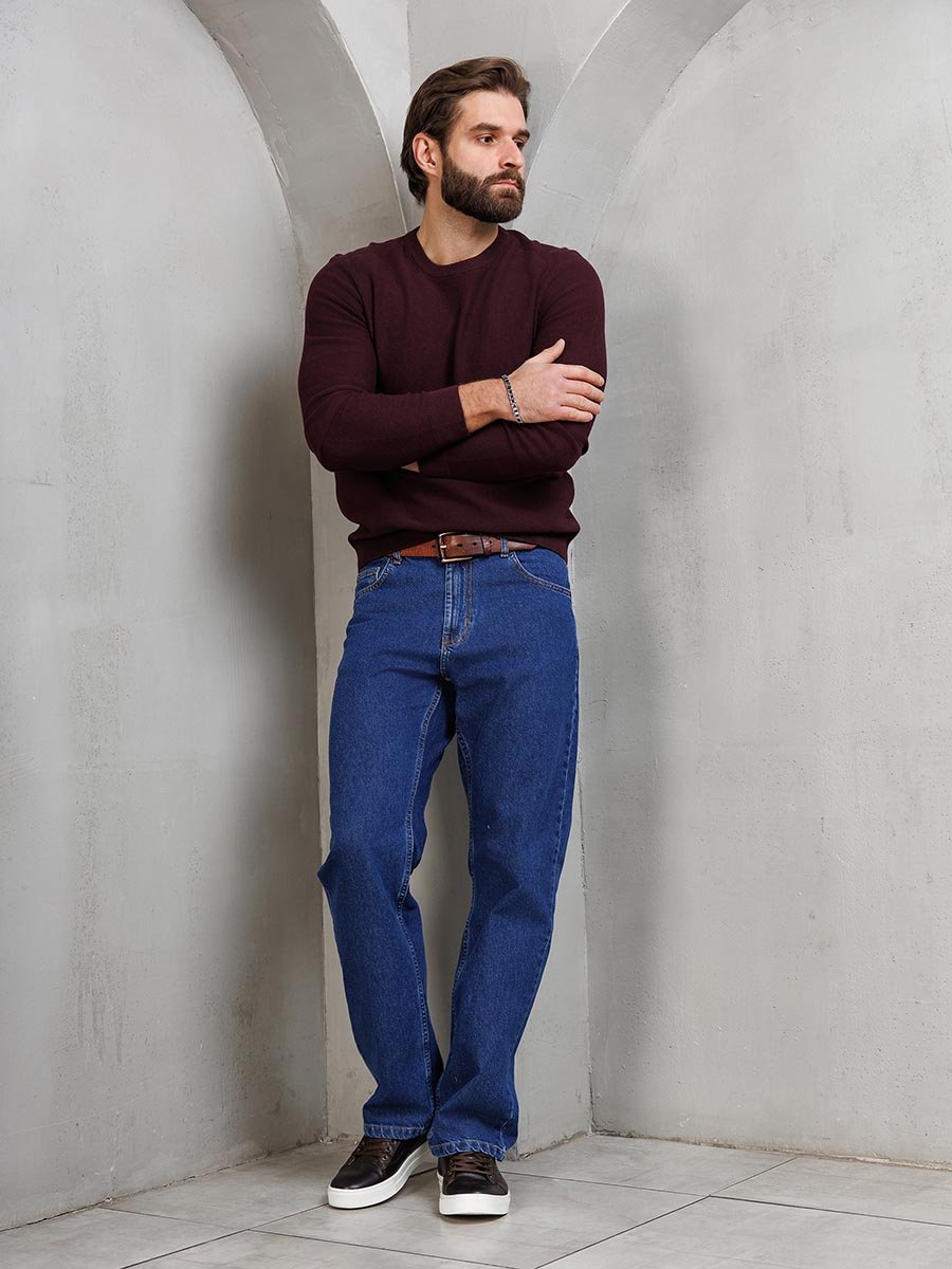 Мужские классические джинсы с пятью карманами. Посадка Comfort fit (свободные по бедру), широкие в колене и по низу, высокая талия. Застежка на молнии. Выполнены из ткани denim. Классическая темная стирка..