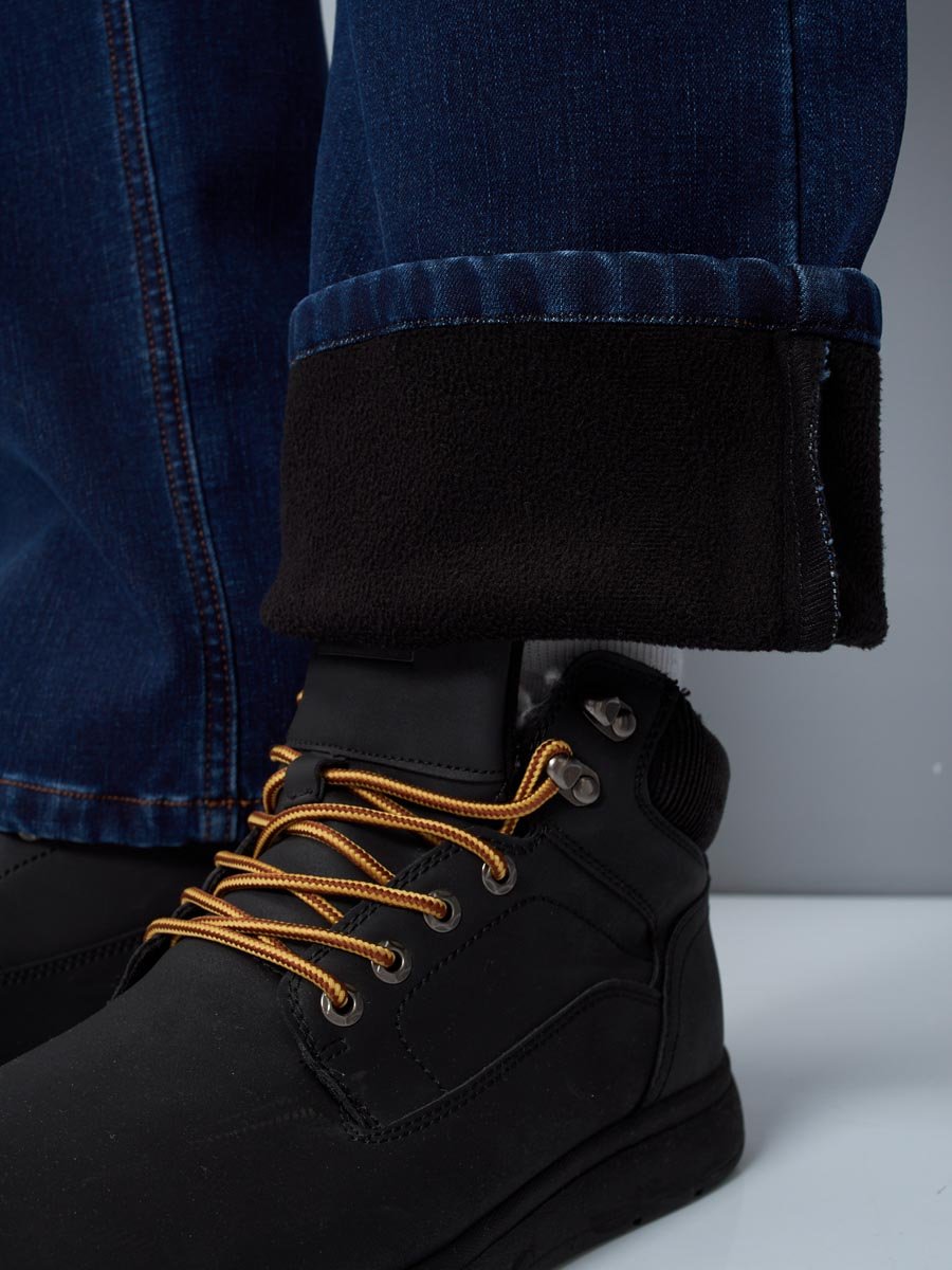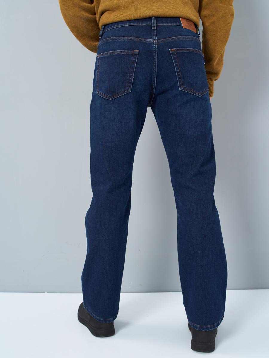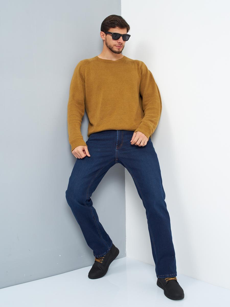 Мужские классические джинсы с пятью карманами. Посадка Regular fit (полуоблегающие по бедру), высокая талия, немного заужены к низу. Застежка на молнии. Выполнены из слабоэластичной утепленной ткани denim comfort stretch, к изнаночной ткани прикреплена дополнительная трикотажная ткань (флис) с мягким, шелковистым и приятным на ощупь ворсом. Темная стирка с потёртостями и слабовыраженными "усами" спереди и потёртостями сзади. Параметры указаны для размера 32. Длина шагового шва для роста 32 - 80 см., для роста 34 - 85 см, для роста 36 - 90 см.