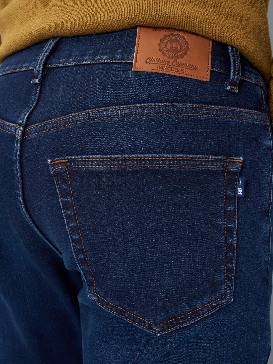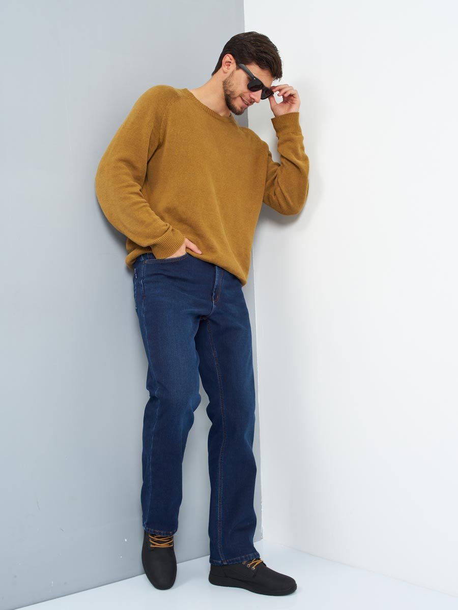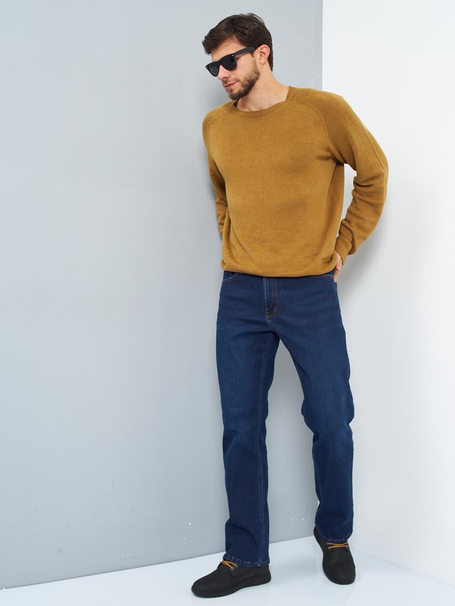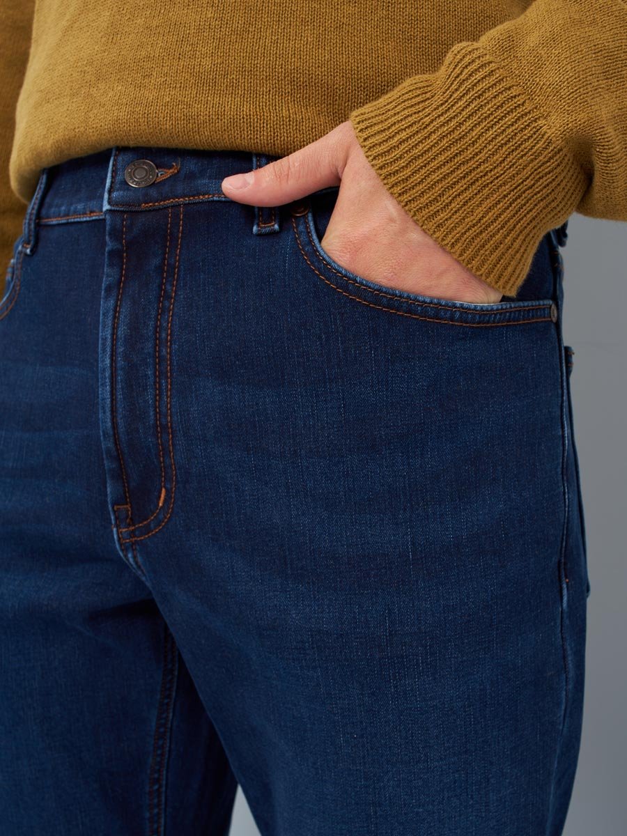 Мужские классические джинсы с пятью карманами. Посадка Regular fit (полуоблегающие по бедру), высокая талия, немного заужены к низу. Застежка на молнии. Выполнены из слабоэластичной утепленной ткани denim comfort stretch, к изнаночной ткани прикреплена дополнительная трикотажная ткань (флис) с мягким, шелковистым и приятным на ощупь ворсом. Темная стирка с потёртостями и слабовыраженными "усами" спереди и потёртостями сзади. Параметры указаны для размера 32. Длина шагового шва для роста 32 - 80 см., для роста 34 - 85 см, для роста 36 - 90 см.