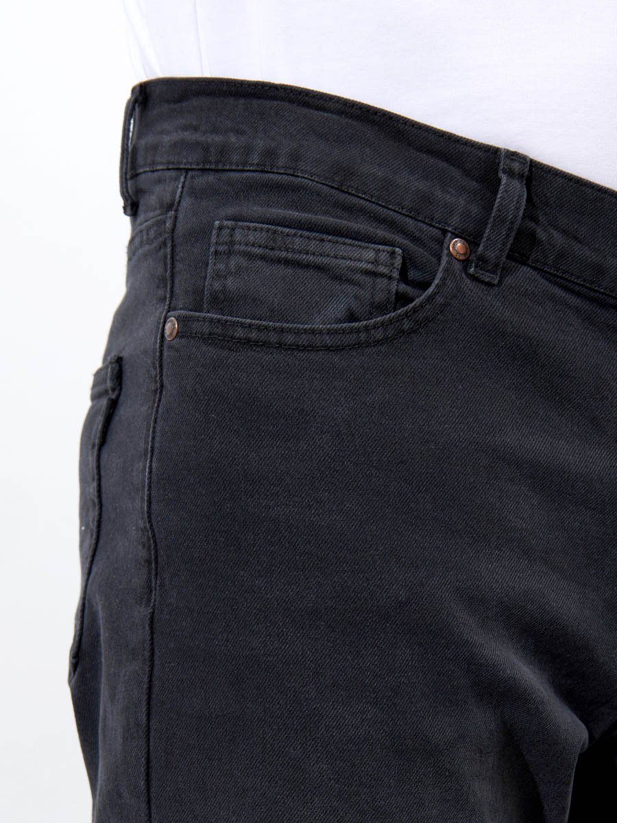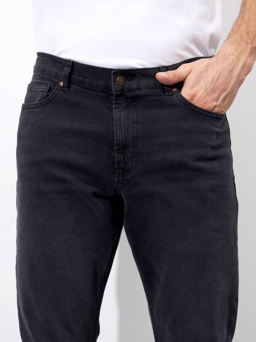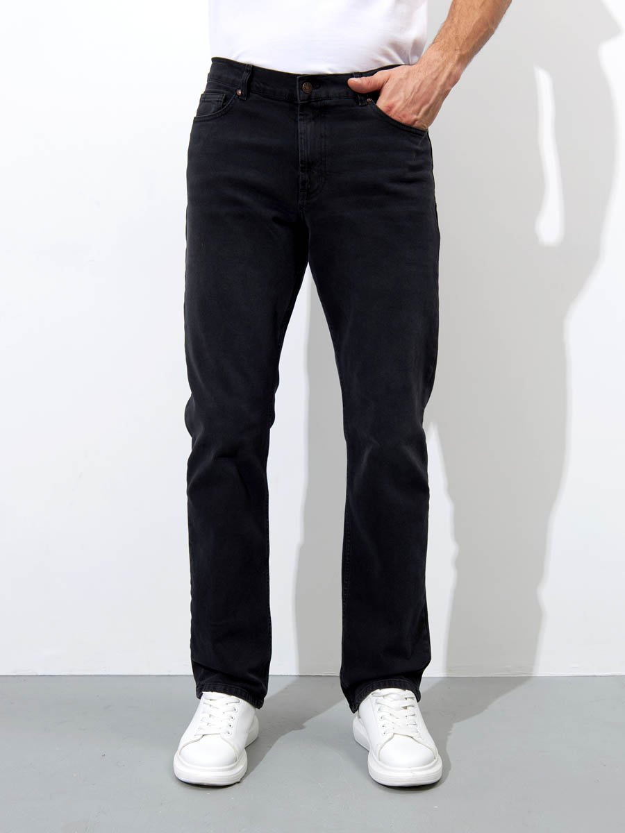 Мужские классические джинсы с пятью карманами. Посадка Regular fit (полуоблегающие по бедру), средняя высота талии. Застежка на молнии. Немного зауженные к низу. Выполнены из слабоэластичной ткани denim comfort stretch, цвет ткани Black/Black (лицевая и изнаночная стороны ткани черные). Темная стирка со слабовыраженными потёртостями спереди и сзади.
