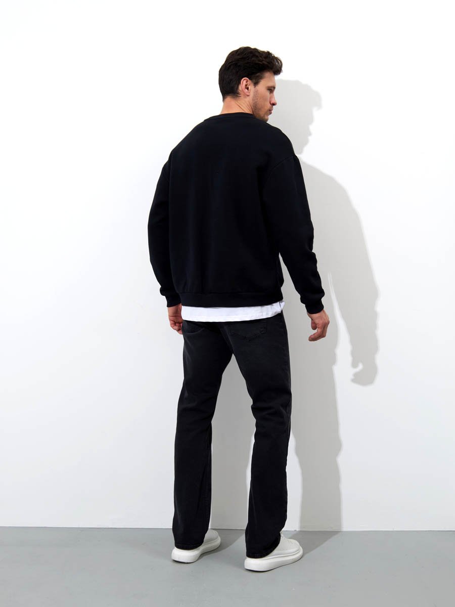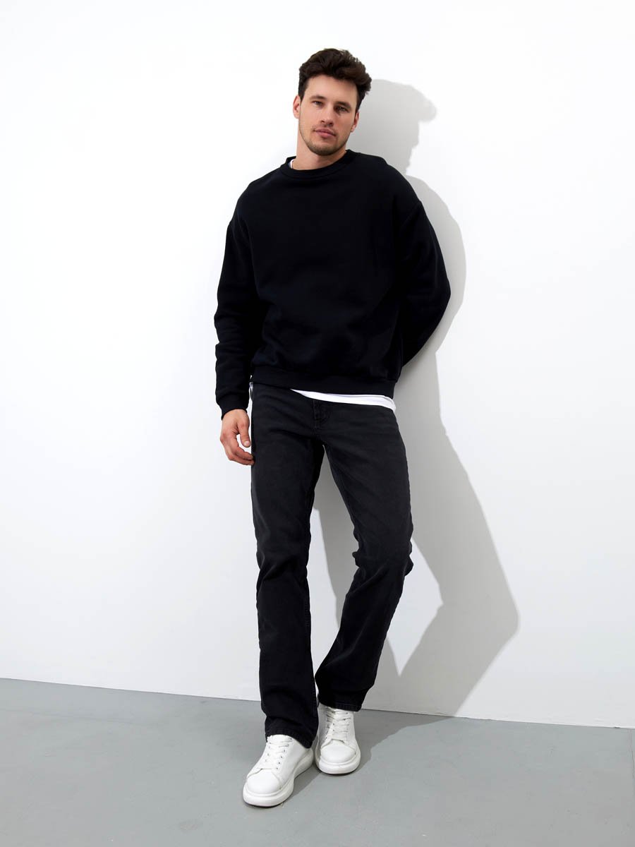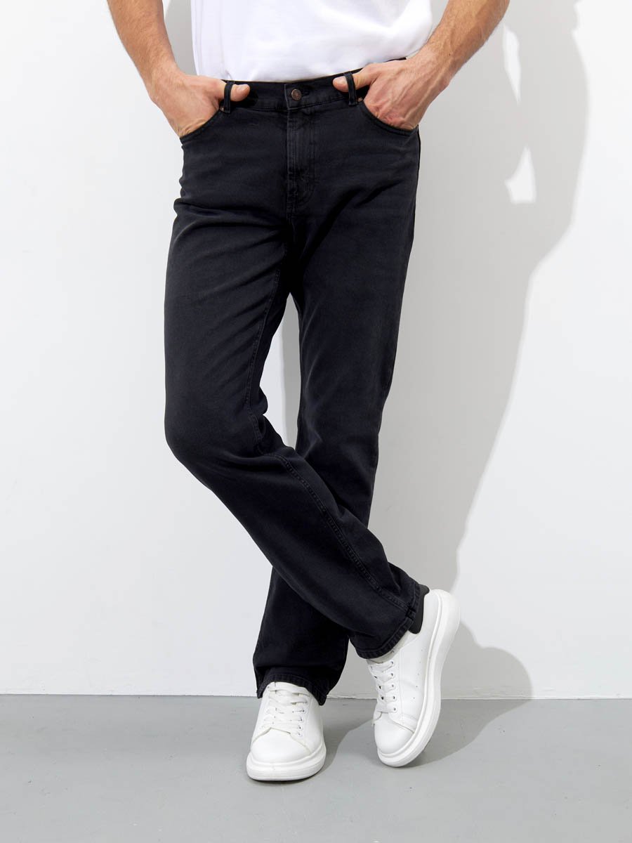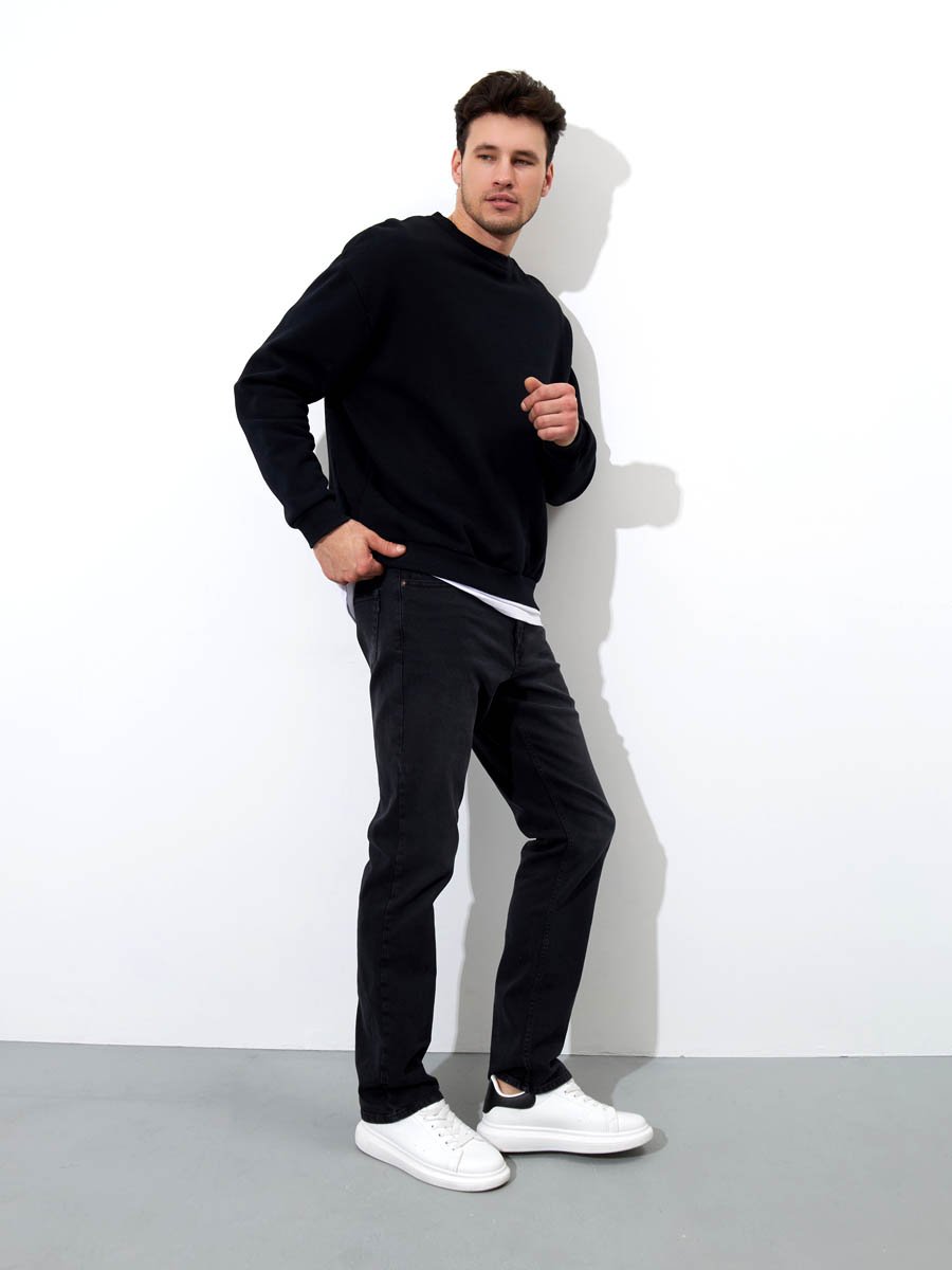Мужские классические джинсы с пятью карманами. Посадка Regular fit (полуоблегающие по бедру), средняя высота талии. Застежка на молнии. Немного зауженные к низу. Выполнены из слабоэластичной ткани denim comfort stretch, цвет ткани Black/Black (лицевая и изнаночная стороны ткани черные). Темная стирка со слабовыраженными потёртостями спереди и сзади.