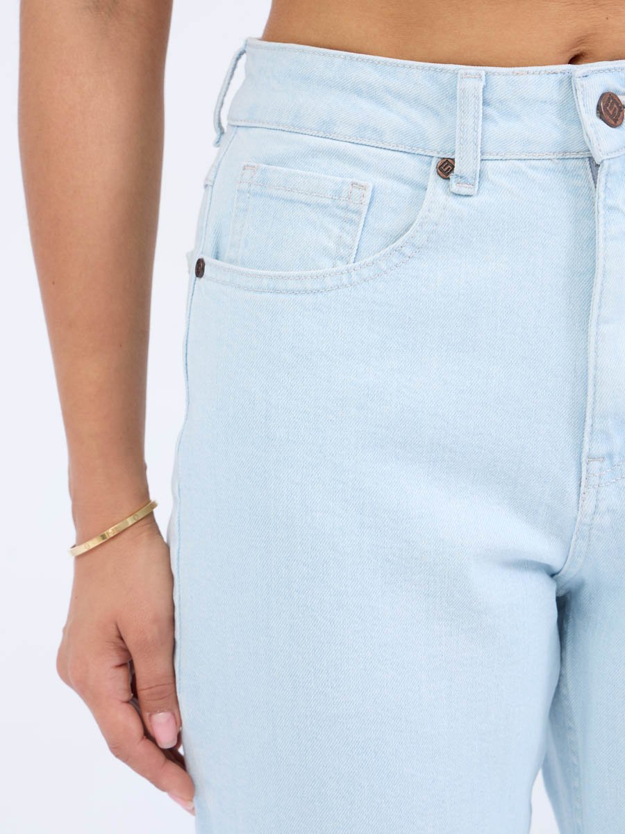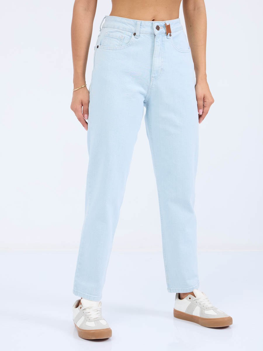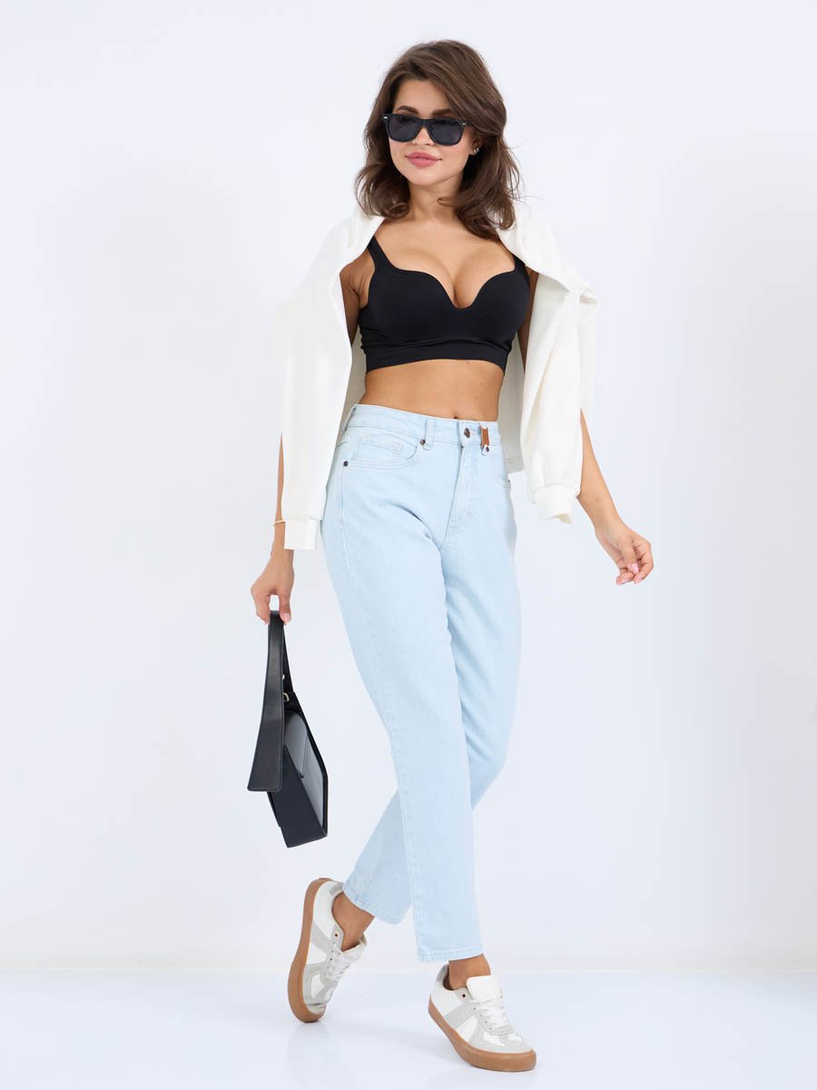 Женские модные джинсы с пятью карманами. Посадка Mom fit (высокая талия), свободные в бедре и зауженные к низу, укороченной длины. Застежка на молнию. Выполнены из слабоэластичной ткани denim comfort stretch. Классическая светлая стирка "stone wash"с отбеливанием.