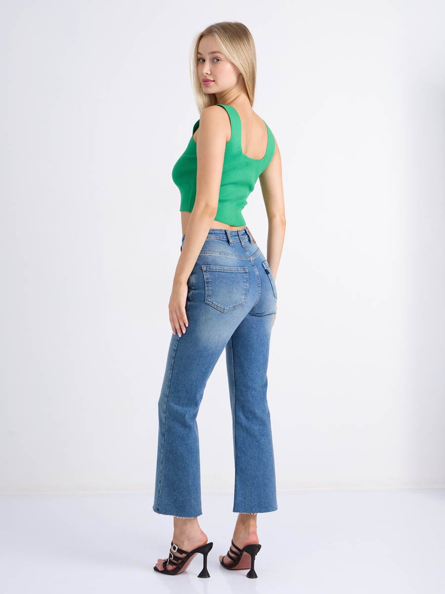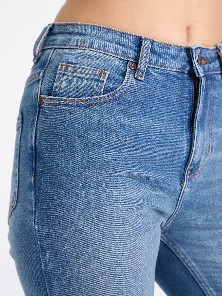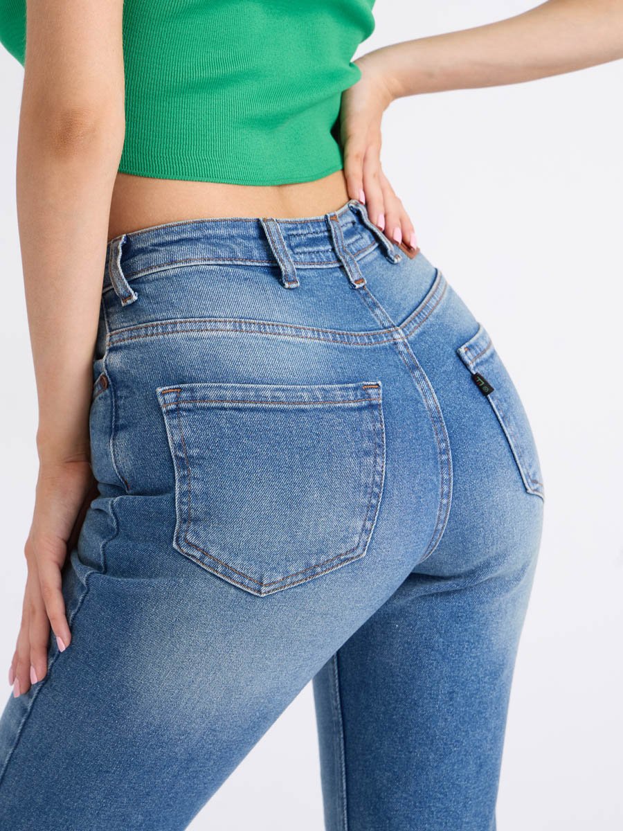 Женские джинсы с пятью карманами. Посадка Flare fit (полуоблегающие по бедру и расклешенные от колена), высокая талия, укороченной длдины. Для улучшения посадки по талии сделан подкройной пояс из 2-х частей. Застежка на молнии. Выполнены из слабоэластичной ткани denim stretch. Средняя стирка с потёртостями и "усами" спереди и потёртостями сзади.Джинсы дополнительно чуть-чуть подкрашены в желтый цвет для получения эффекта "GET DIRTY", т.е. эффекта запачканных джинсов.
