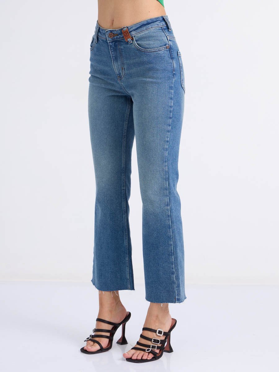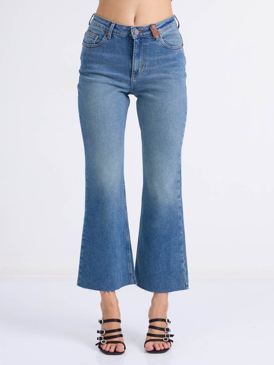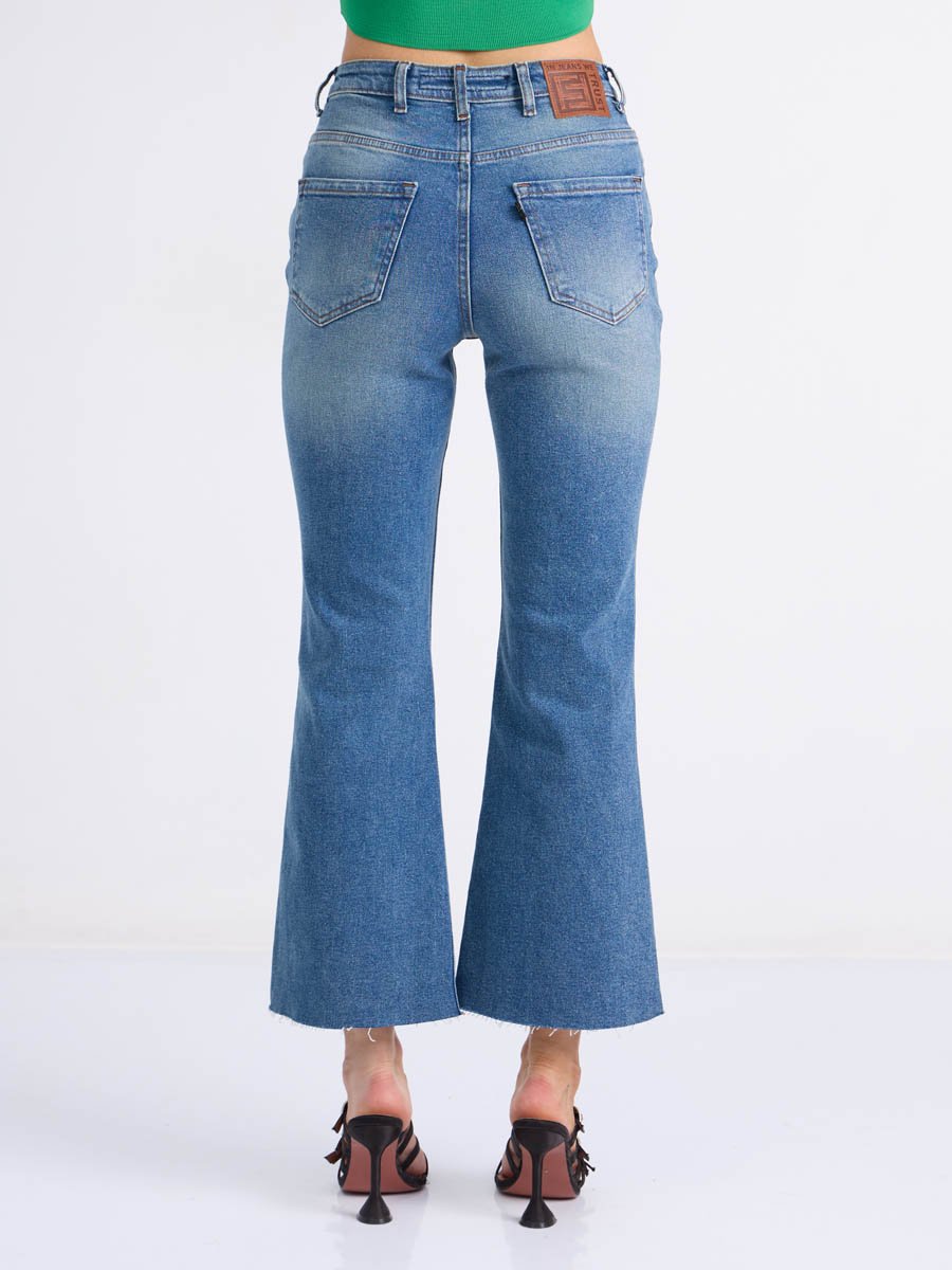 Женские джинсы с пятью карманами. Посадка Flare fit (полуоблегающие по бедру и расклешенные от колена), высокая талия, укороченной длдины. Для улучшения посадки по талии сделан подкройной пояс из 2-х частей. Застежка на молнии. Выполнены из слабоэластичной ткани denim stretch. Средняя стирка с потёртостями и "усами" спереди и потёртостями сзади.Джинсы дополнительно чуть-чуть подкрашены в желтый цвет для получения эффекта "GET DIRTY", т.е. эффекта запачканных джинсов.