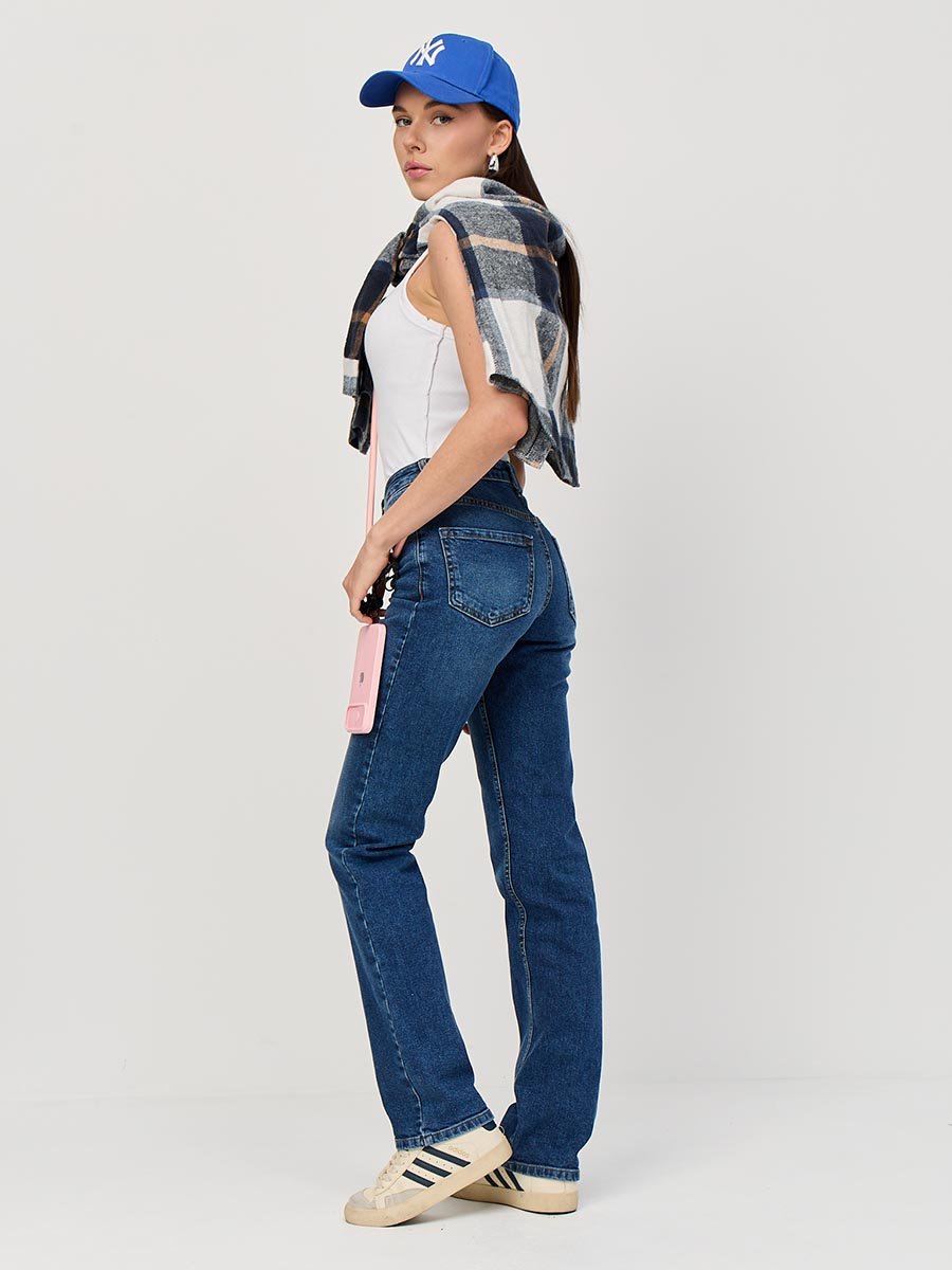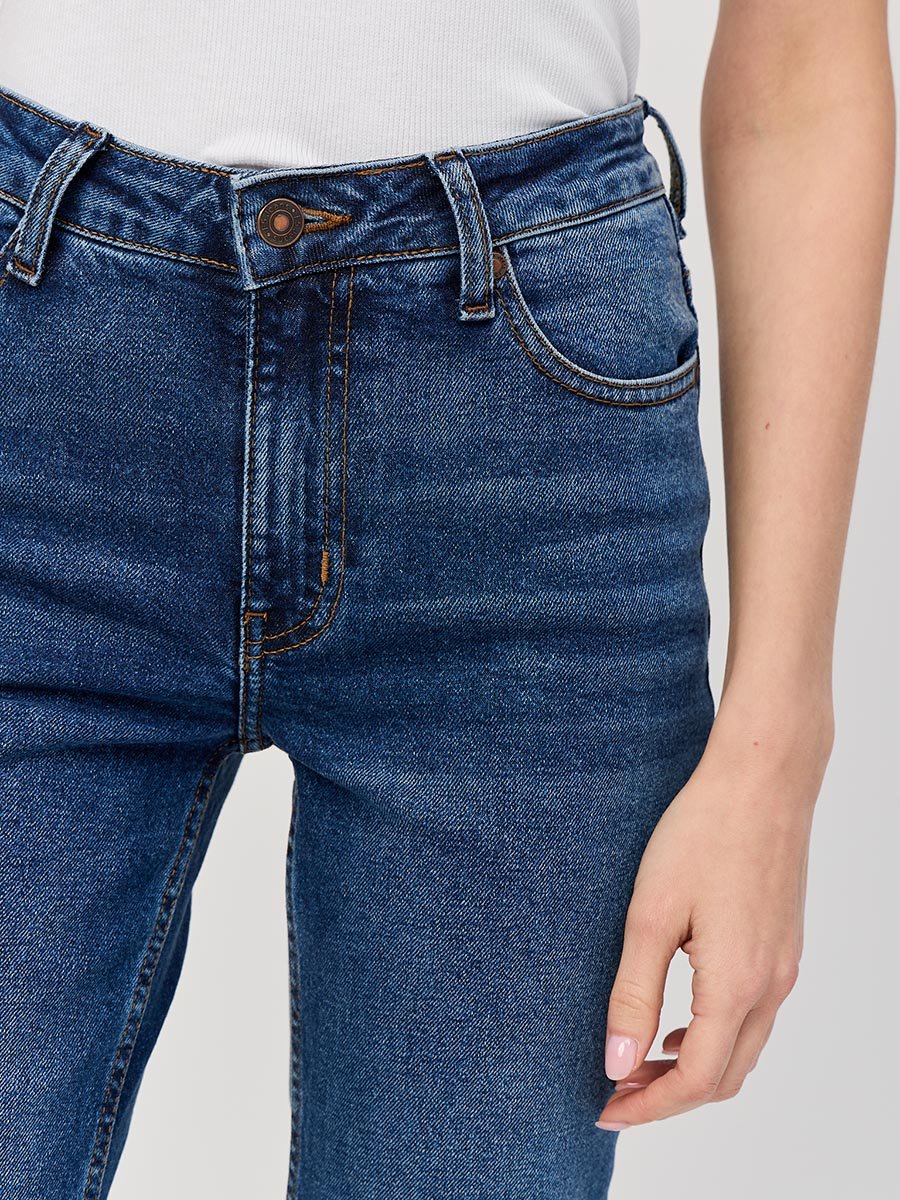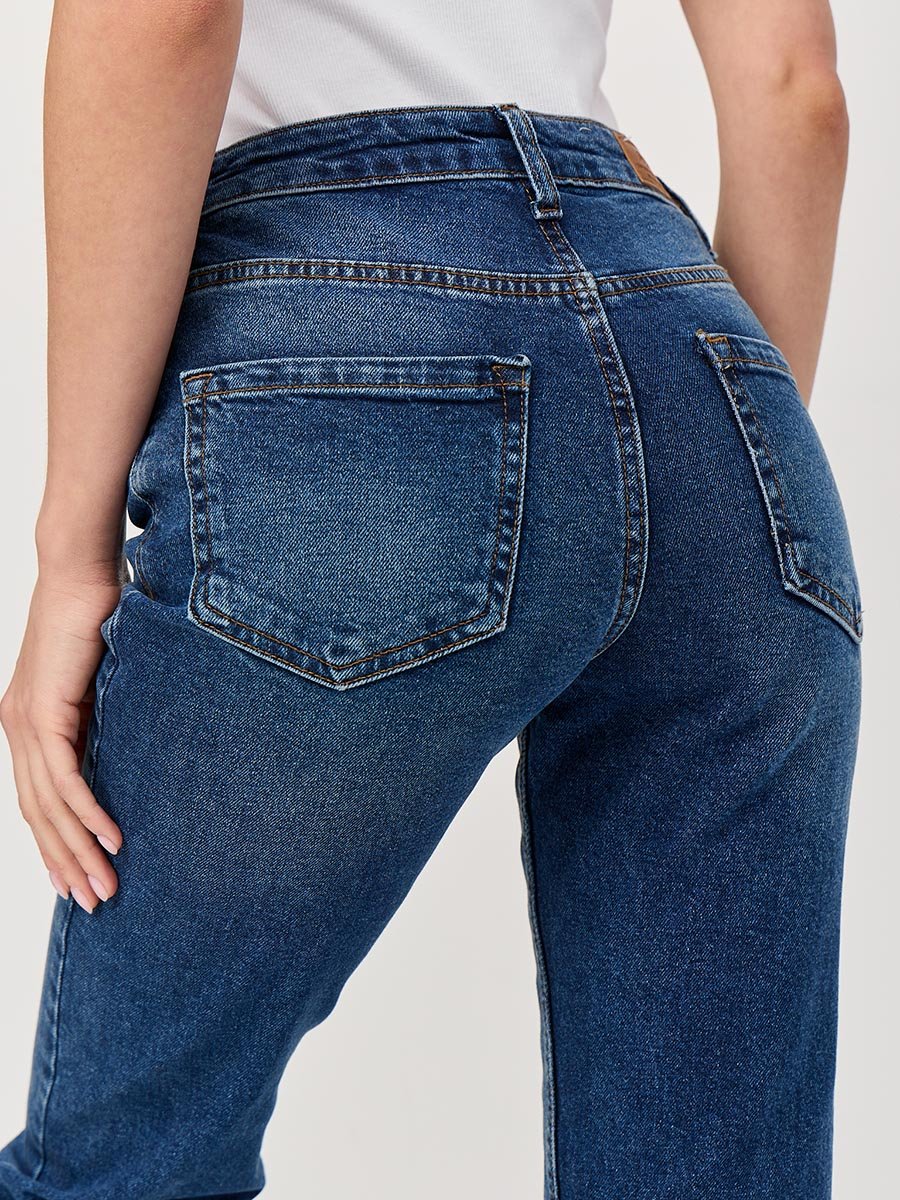 Женские классические джинсы с пятью карманами. Посадка Regular fit (полуоблегающие по бедру). Для улучшения посадки по талии сделан подкройной пояс из 2-х частей. Средняя высота талии спереди и высокая сзади. Застежка на молнии. Немного зауженные к низу. Выполнены из слабоэластичной ткани denim comfort stretch. Средняя стирка с потёртостями и "усами" спереди и потёртостями сзади.