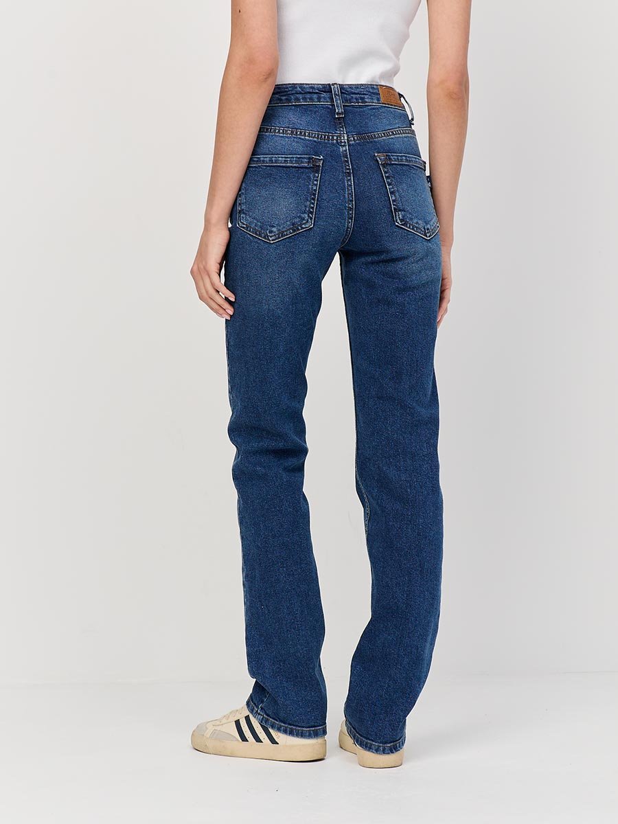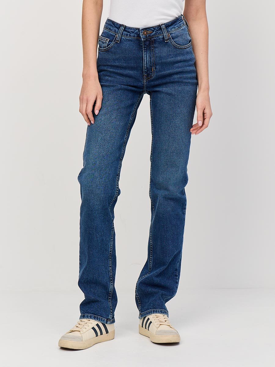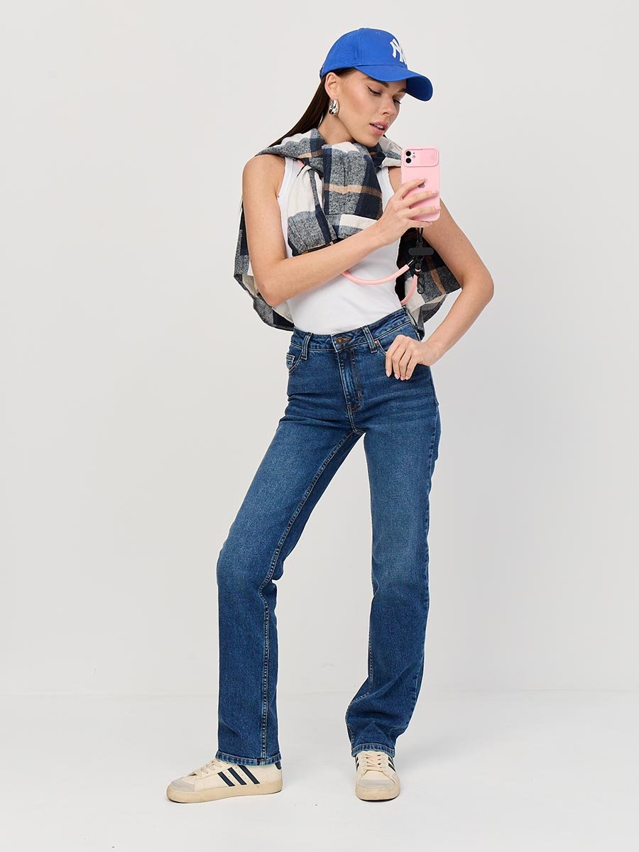 Женские классические джинсы с пятью карманами. Посадка Regular fit (полуоблегающие по бедру). Для улучшения посадки по талии сделан подкройной пояс из 2-х частей. Средняя высота талии спереди и высокая сзади. Застежка на молнии. Немного зауженные к низу. Выполнены из слабоэластичной ткани denim comfort stretch. Средняя стирка с потёртостями и "усами" спереди и потёртостями сзади.