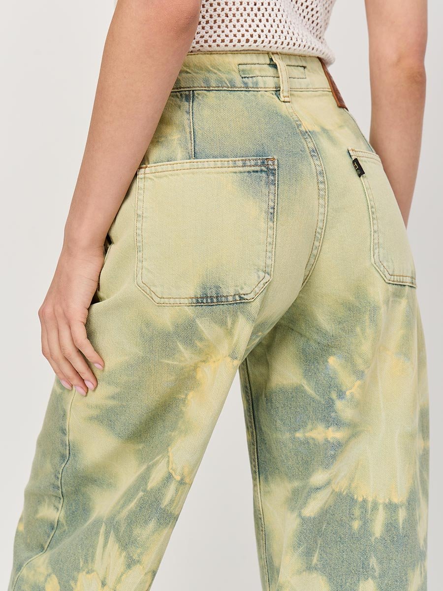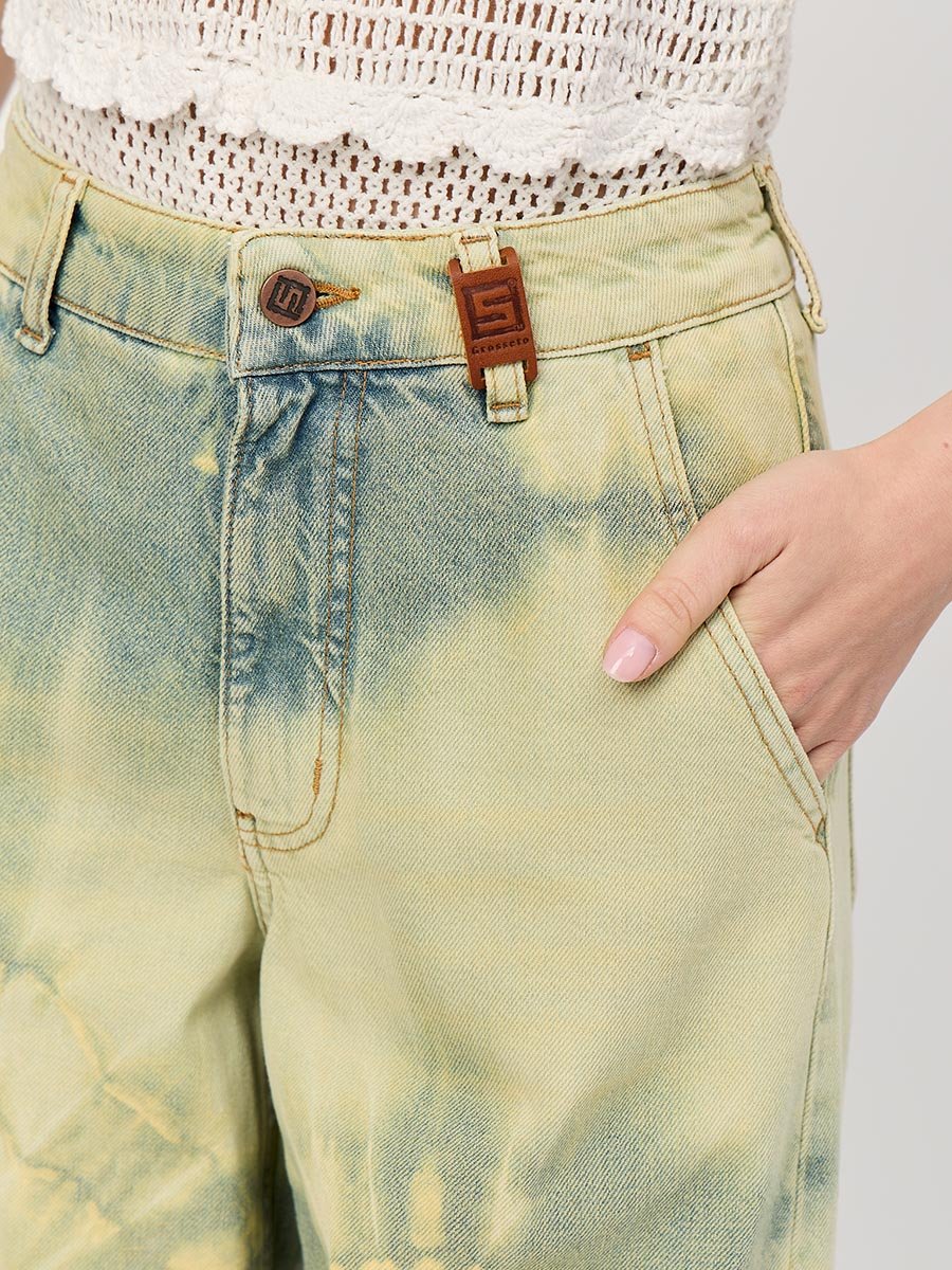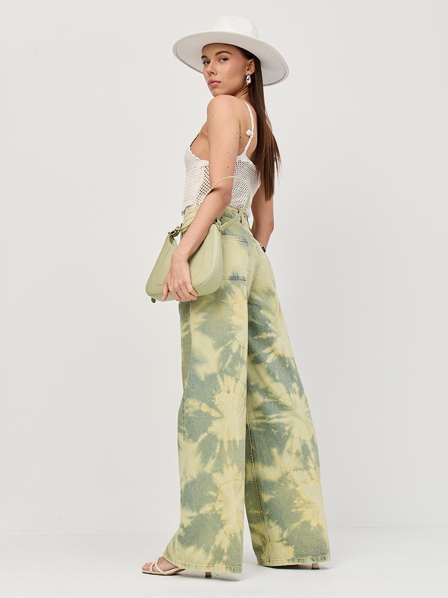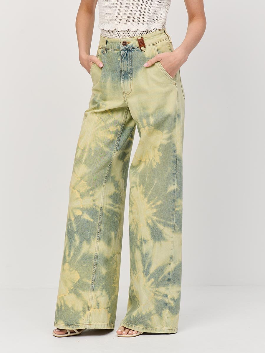 Это широкие джинсы с высокой посадкой идеально подходят для создания расслабленного, непринужденного образа. Также подходят как для повседневного ношения, так и для особых, но неформальных случаев. Изготовленные из мягкого традиционного денима, они обеспечивают полное сочетание удобства и практичности. Высокая талия с вытачками сзади для улучшения посадки пояса, карманы "хулиганы", свободные штанины сильно расширяющиеся к низу, позволяют получить утонченный силуэт и подчеркнуть особенности женской фигуры наилучшим образом и в тоже время обеспечить свободу движений. Эти джинсы с уникальным эффектом стирки по технологии "Тай-дай (Tie-dye)", т.е.способом стирки путем скручивания, складывания и заматывания изделия с целью получения уникальных хаотичных и размытых узоров и последующим эффектом подкрашивания "GET DIRTY", т.е. эффектом запачканных джинсов.