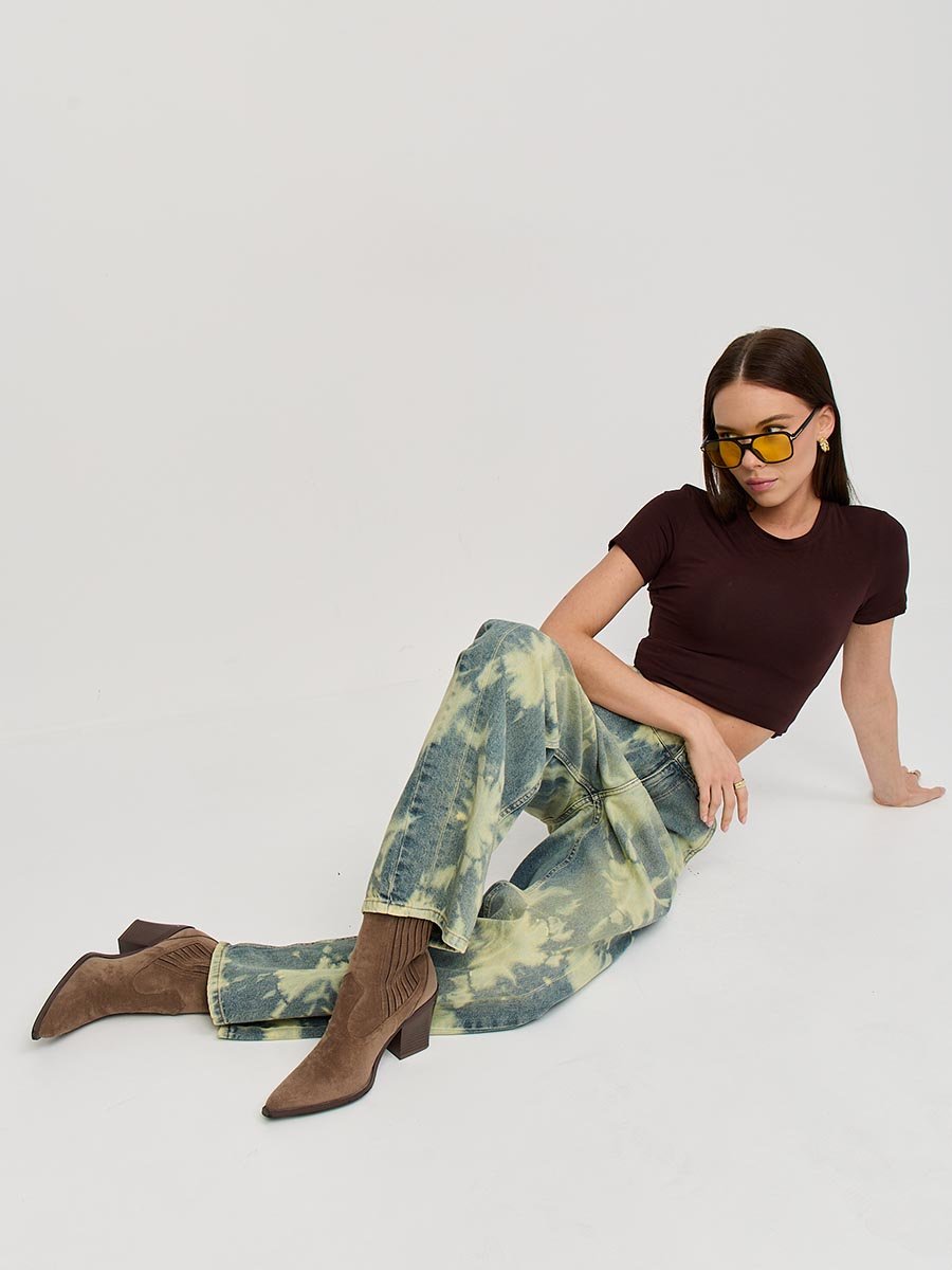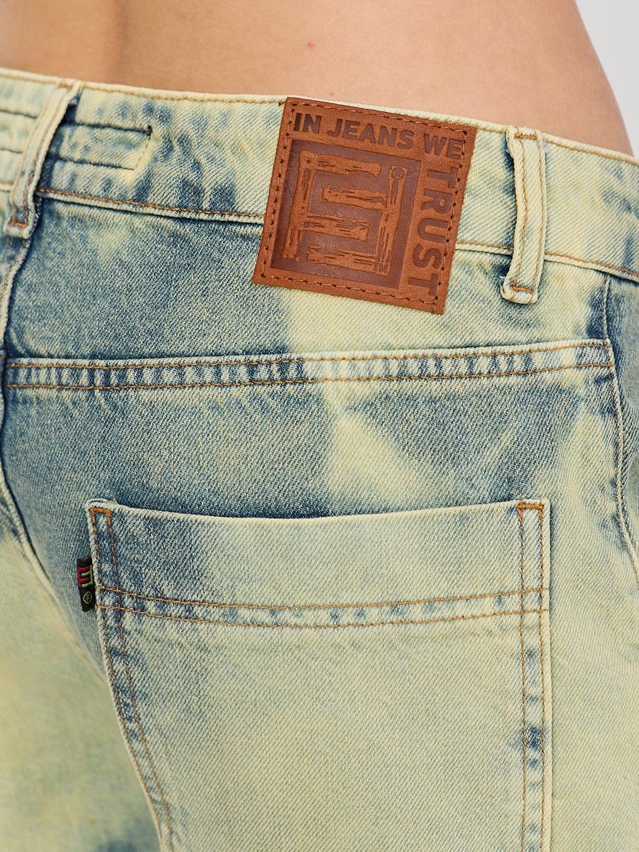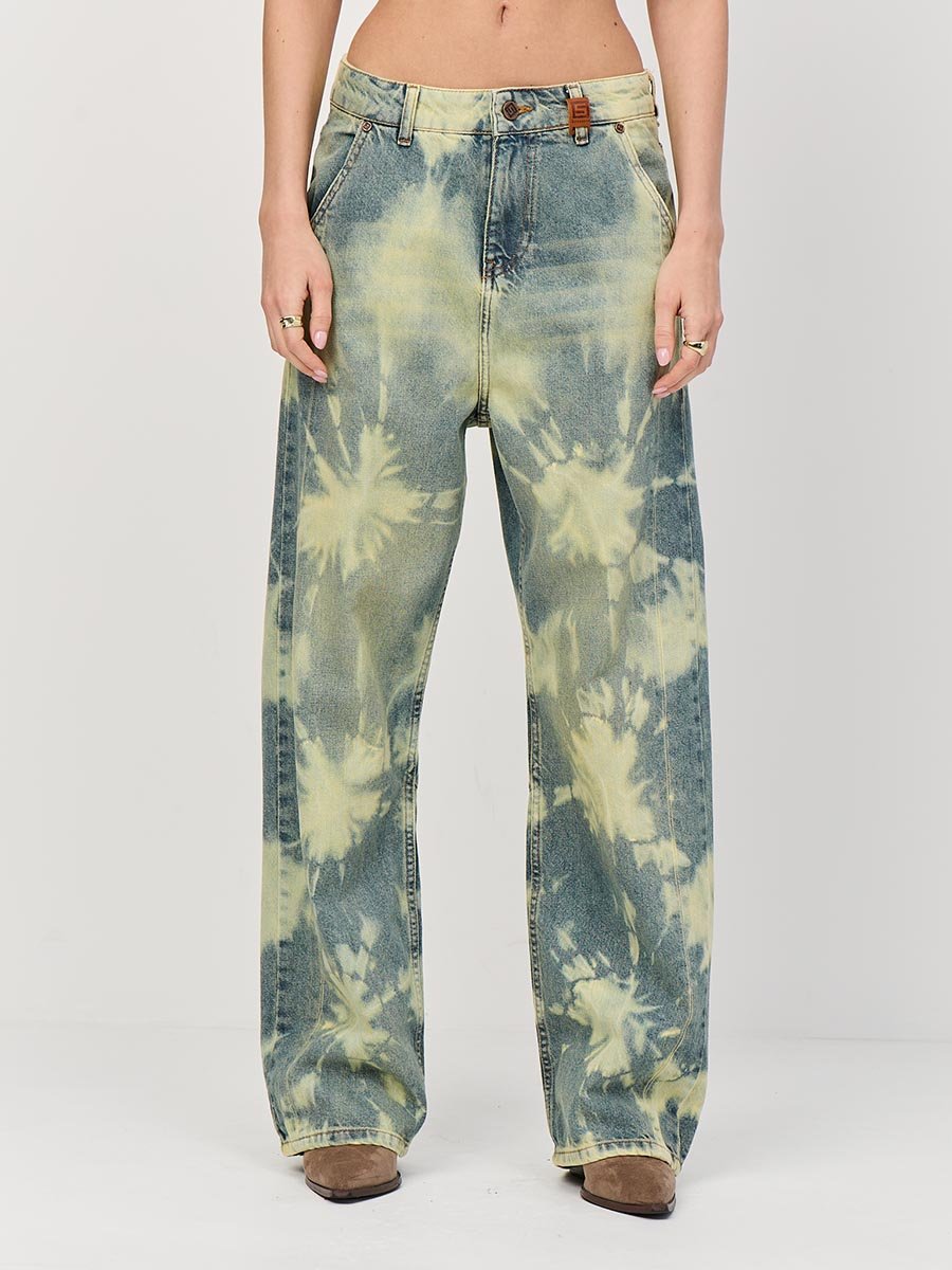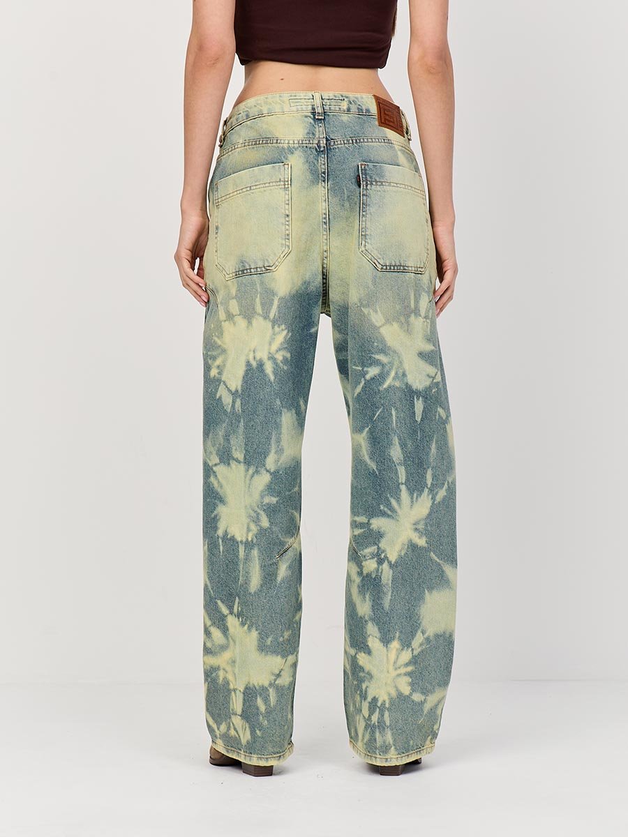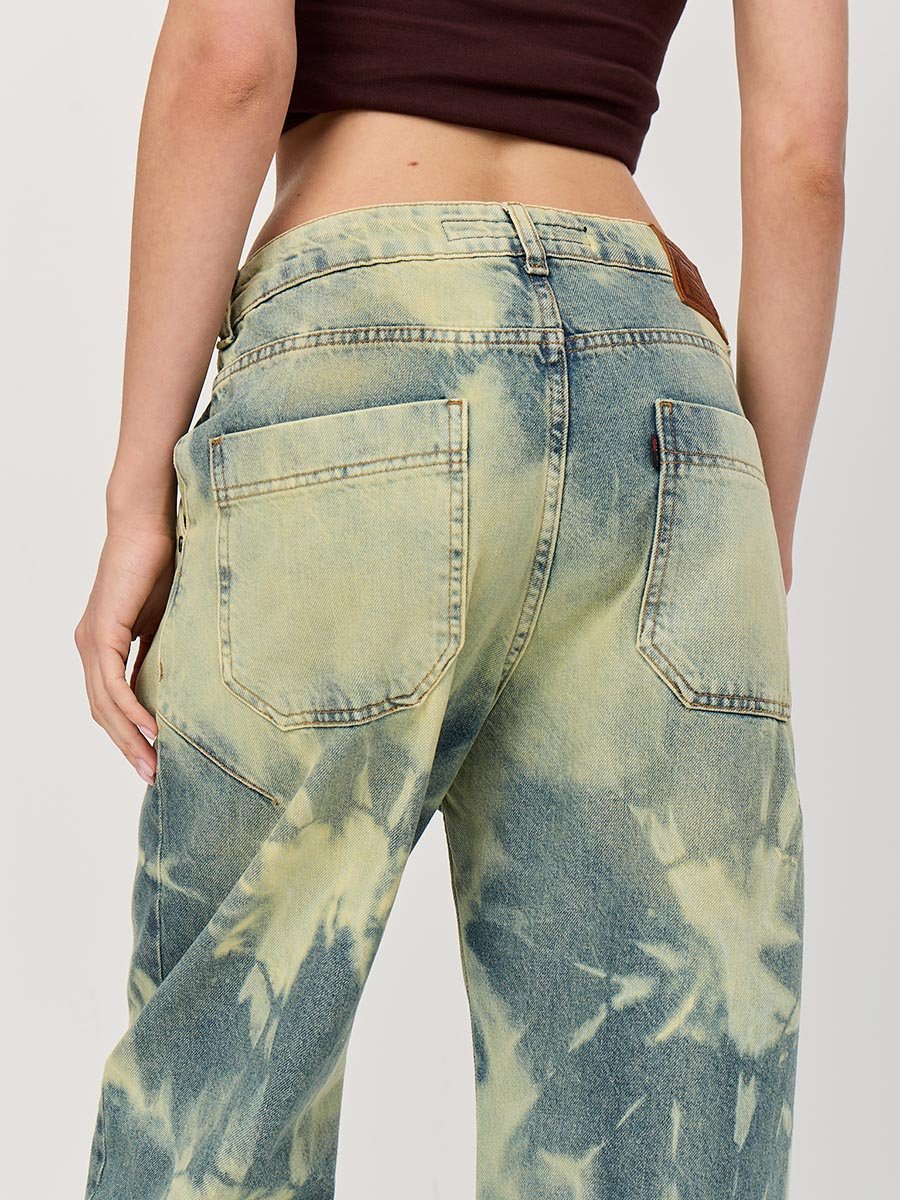 Эти джинсы с уникальным эффектом стирки по технологии "Тай-дай (Tie-dye)", т.е.способом стирки путем скручивания, складывания и заматывания изделия с целью получения уникальных хаотичных и размытых узоров и последующим эффектом подкрашивания "GET DIRTY", т.е. эффектом запачканных джинсов.
