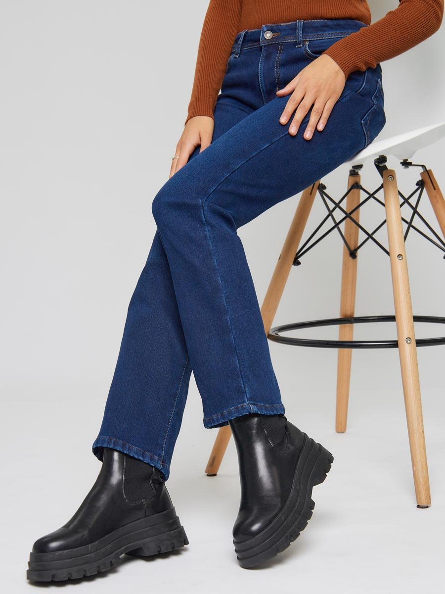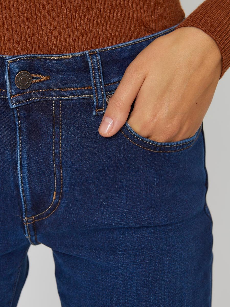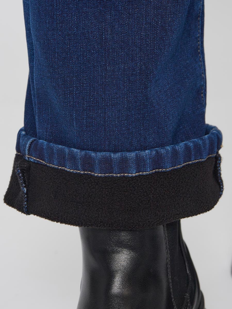 Женские классические утепленные джинсы с посадкой Regular fit (полуоблегающие по бедру), прямые к низу от колена. Высокая талия. Для улучшения посадки по талии сделан подкройной пояс из 2-х частей. Выполнены из утепленной слабоэластичной ткани Blue denim comfort stretch, к изнаночной ткани прикреплена дополнительная трикотажная ткань (флис) с мягким, шелковистым и приятным на ощупь ворсом.Темная стирка спотёртостями спереди и сзади. Параметры указаны для размера 28. Длина внутреннего шва для роста 32 - 80 см., для роста 34 - 85 см