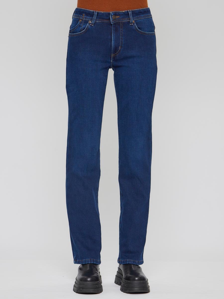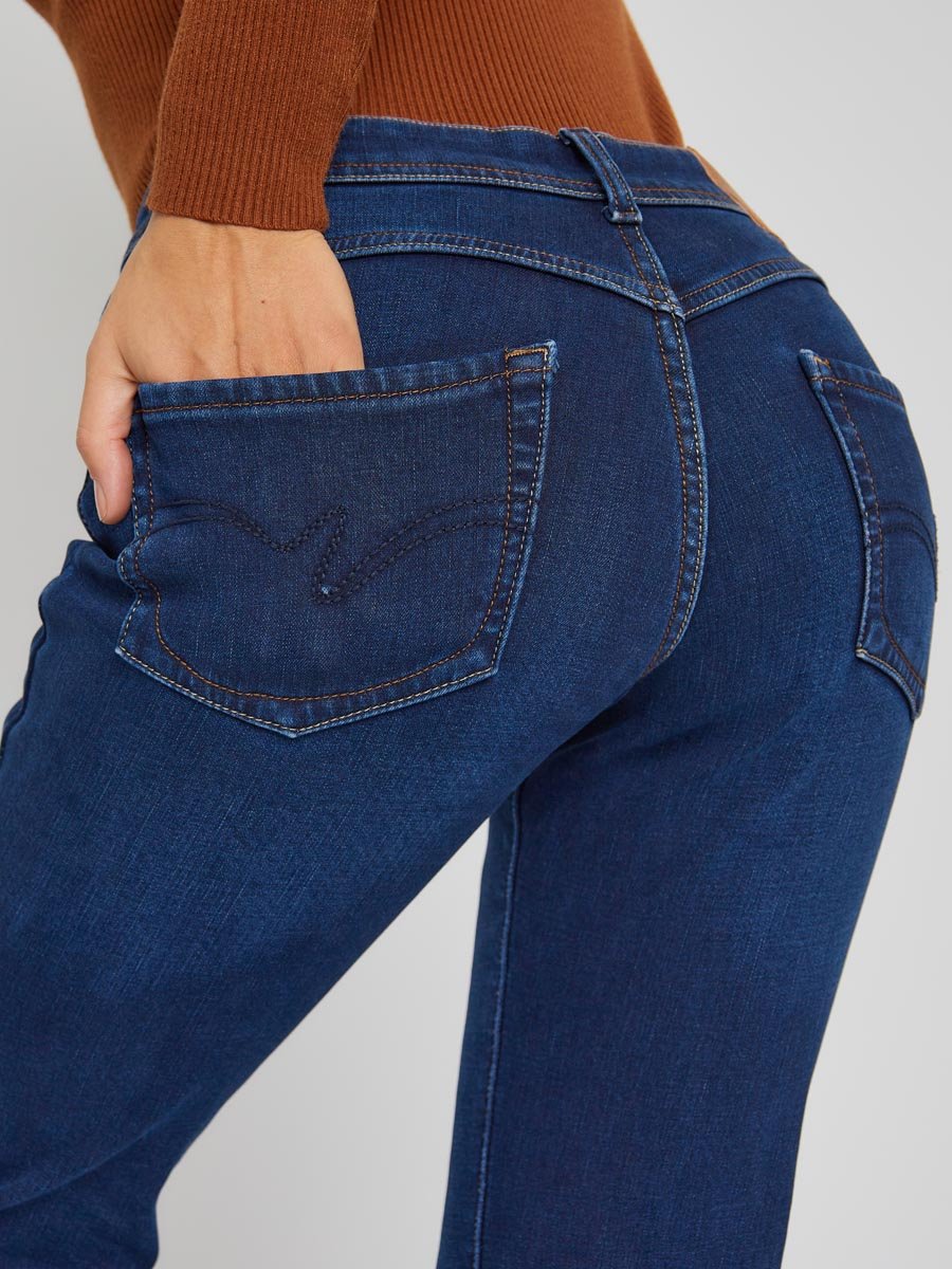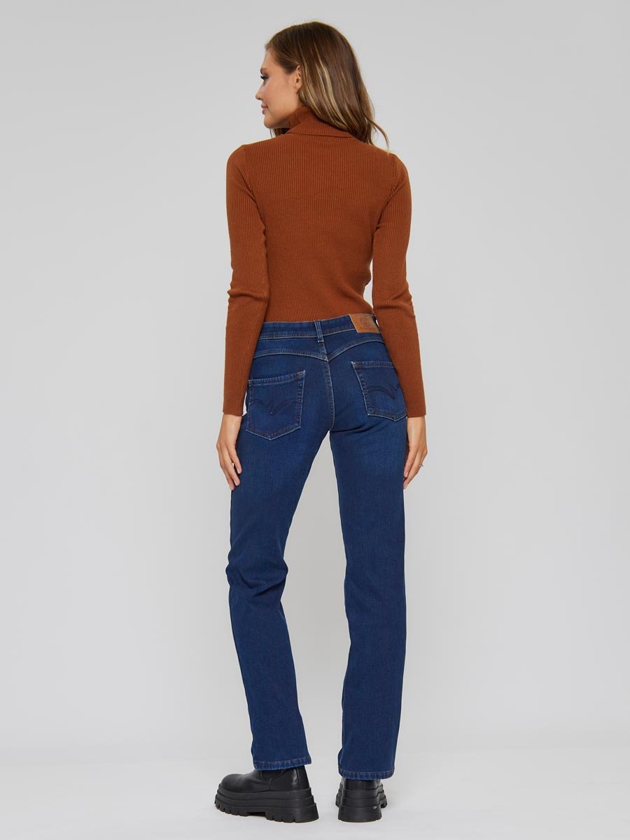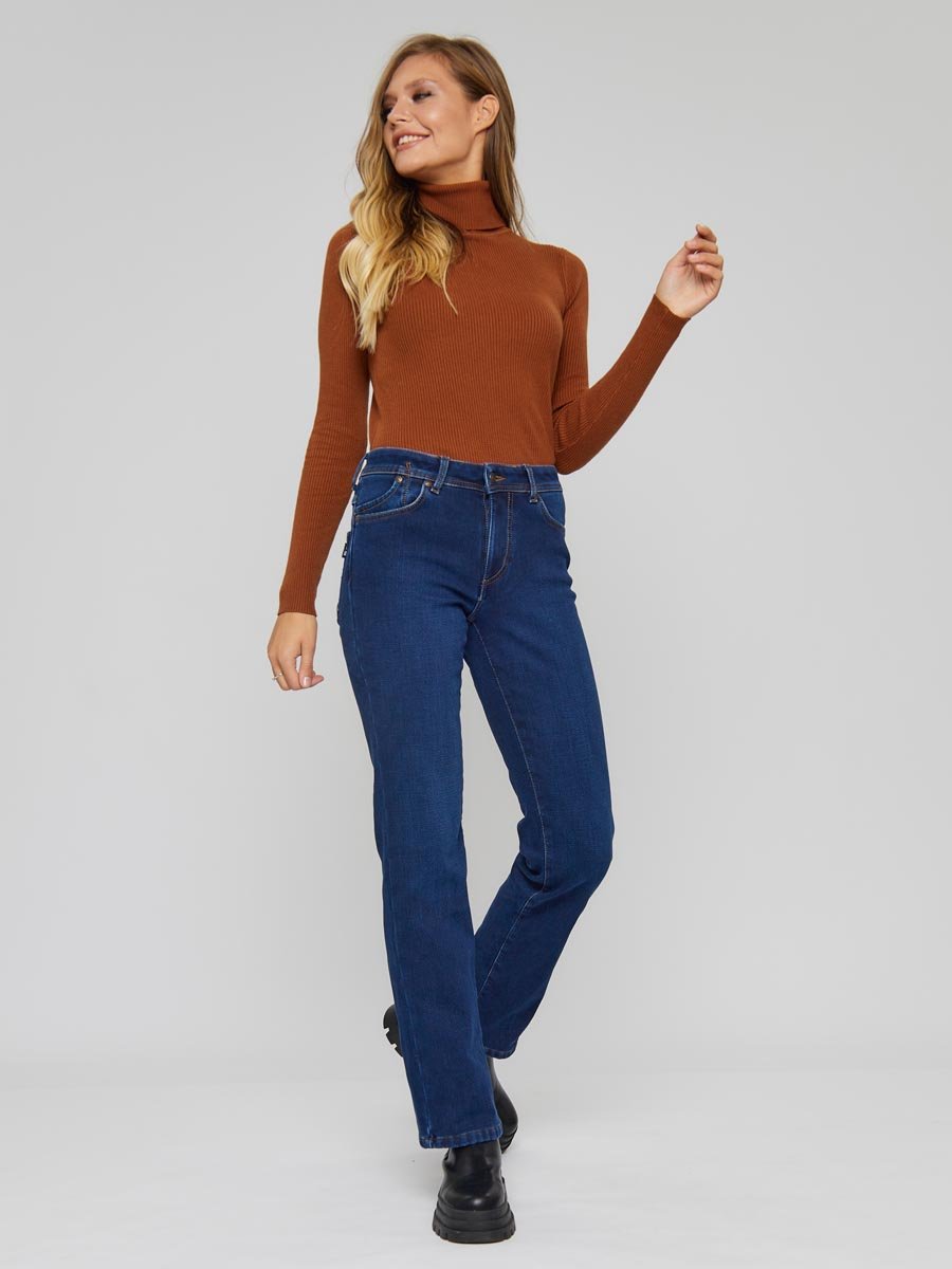 Женские классические утепленные джинсы с посадкой Regular fit (полуоблегающие по бедру), прямые к низу от колена. Высокая талия. Для улучшения посадки по талии сделан подкройной пояс из 2-х частей. Выполнены из утепленной слабоэластичной ткани Blue denim comfort stretch, к изнаночной ткани прикреплена дополнительная трикотажная ткань (флис) с мягким, шелковистым и приятным на ощупь ворсом.Темная стирка спотёртостями спереди и сзади. Параметры указаны для размера 28. Длина внутреннего шва для роста 32 - 80 см., для роста 34 - 85 см