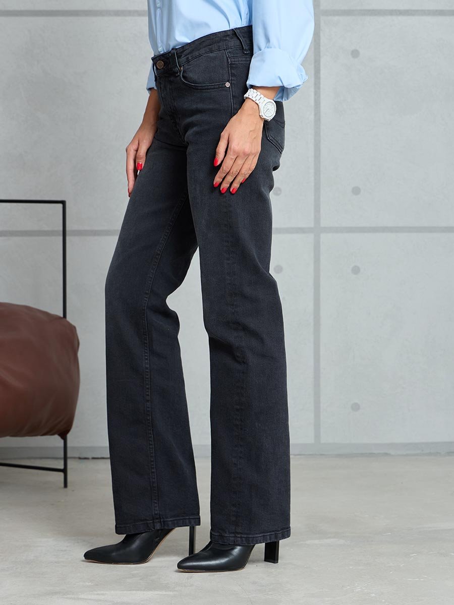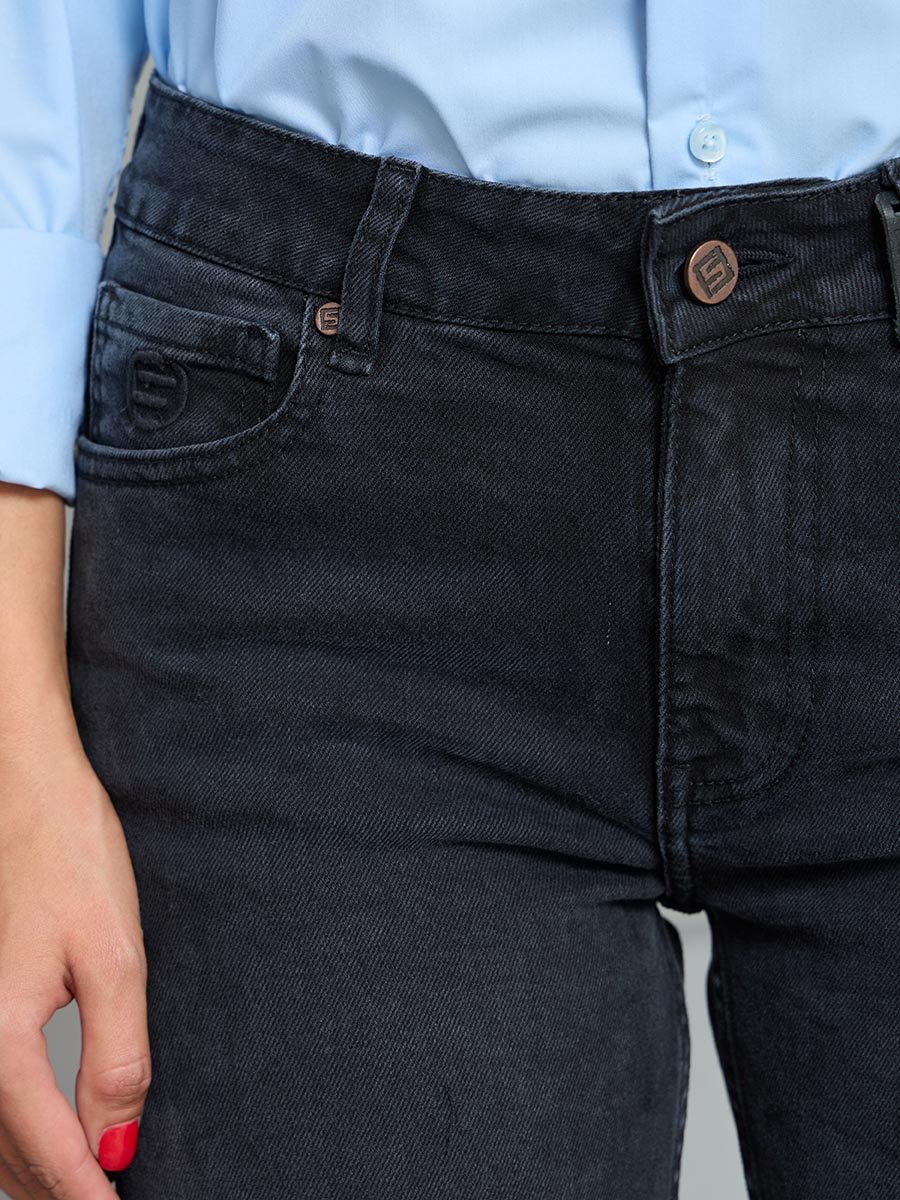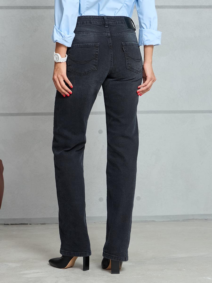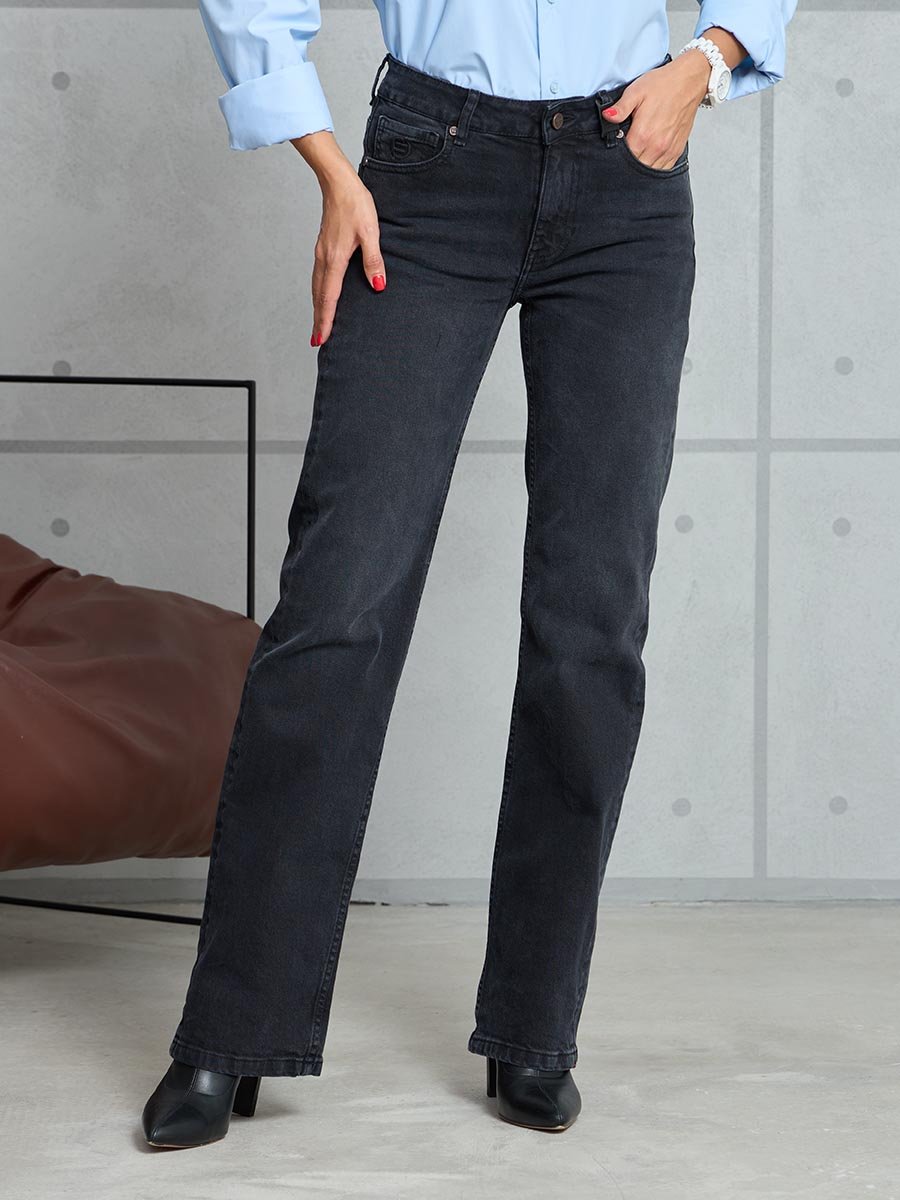 Женские джинсы с пятью карманами. Посадка Regular fit (полуоблегающие по бедру), средняя высота талии спереди и умеренно-высокая сзади, прямые по длине. Для улучшения посадки сделан подкройной пояс из 2-х частей. На часовом кармане вышивка. Застежка на молнии. Выполнены из слабоэластичной ткани denim comfort stretch, цвет ткани Black/Black (лицевая и изнаночная стороны ткани черные). Основной оттенок ткани после стирки черно-серый.Темная стирка с со слабовыраженными потёртостями и "усами" спереди и потёртостями сзади.