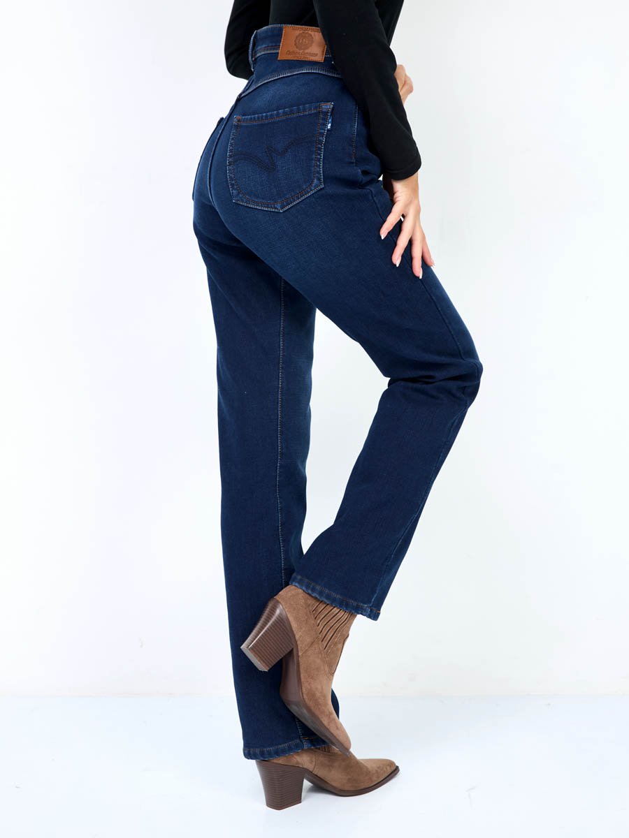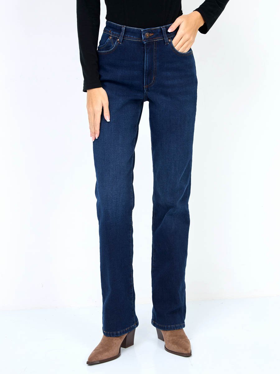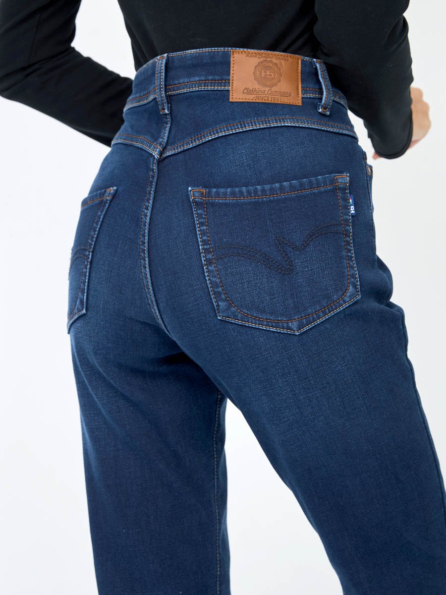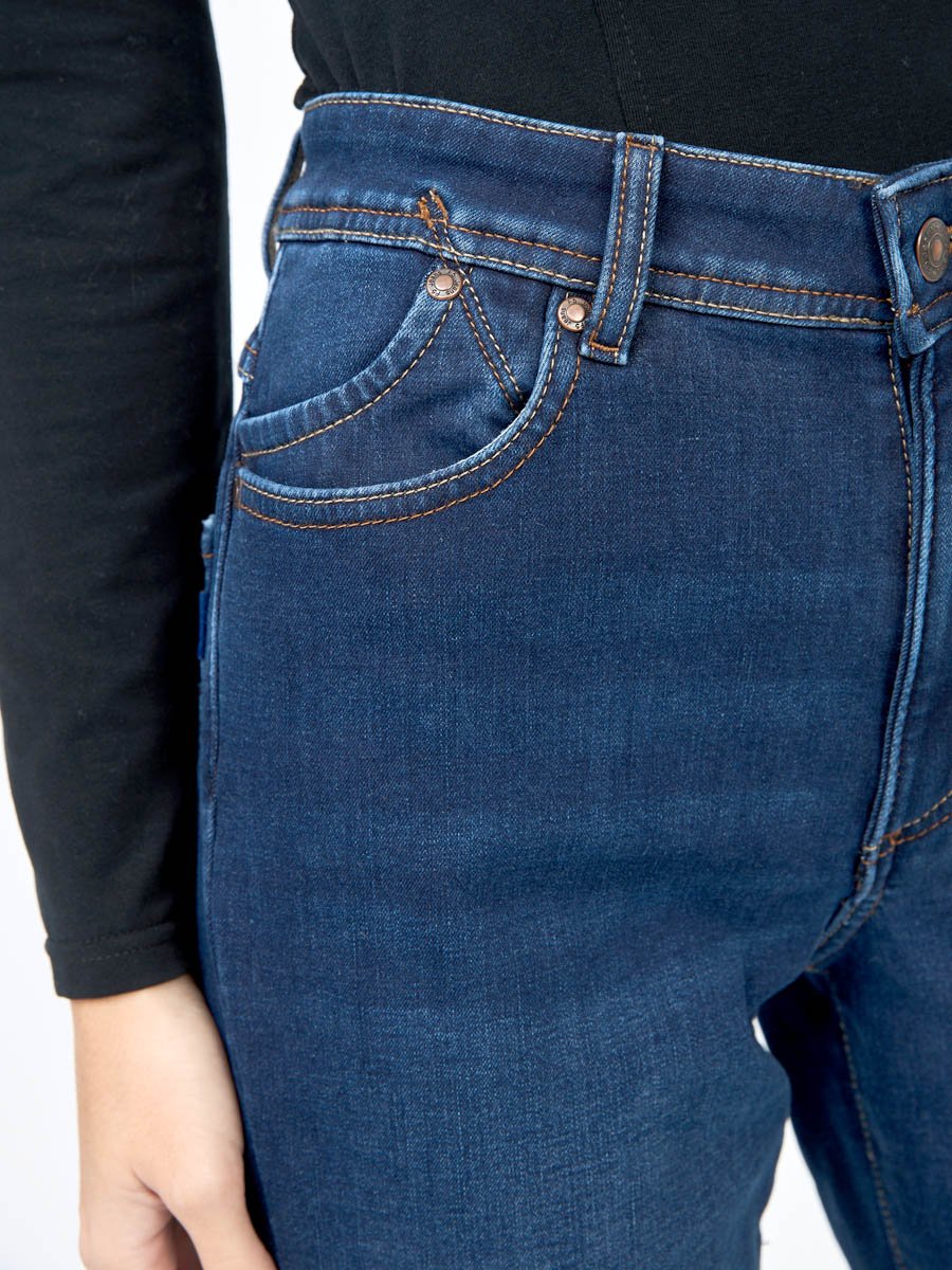 Женские классические джинсы с посадкой Regular fit (полуоблегающие по бедру), прямые к низу от колена. Высокая талия. Для улучшения посадки по талии сделан подкройной пояс из 2-х частей. Выполнены из утепленной слабоэластичной ткани Blue denim comfort stretch, к изнаночной ткани прикреплена дополнительная трикотажная ткань (флис) с мягким, шелковистым и приятным на ощупь ворсом. Темная стирка с потёртостями спереди и сзади.