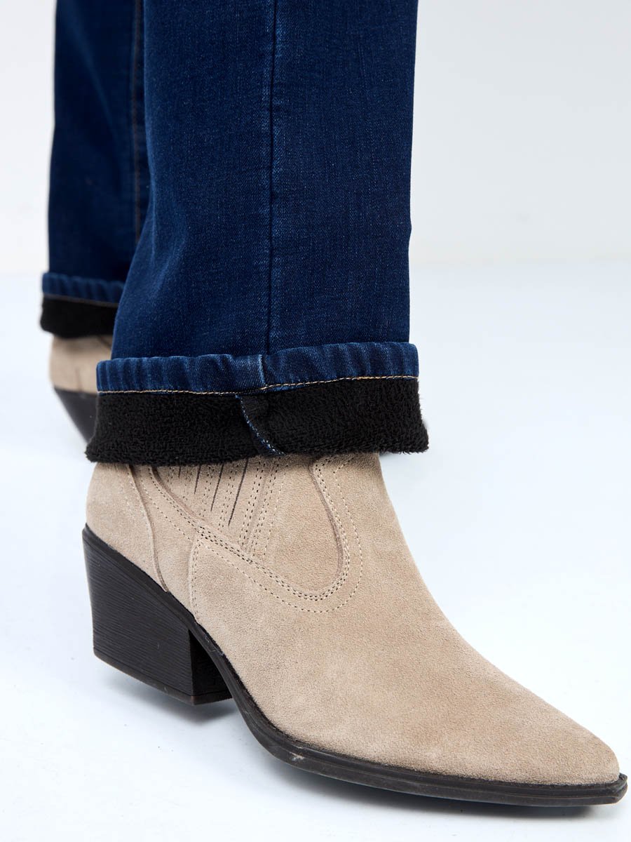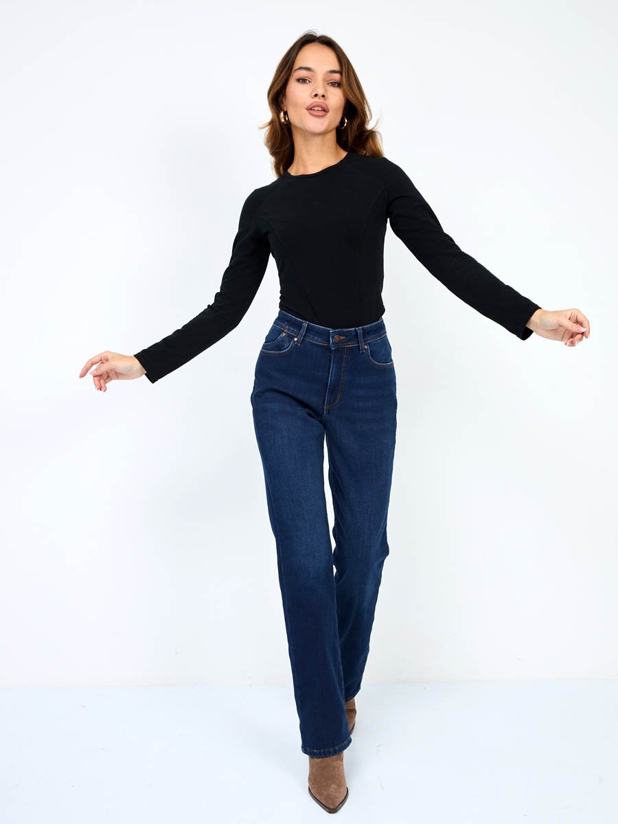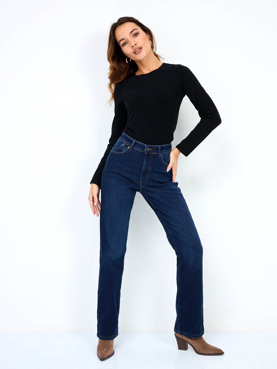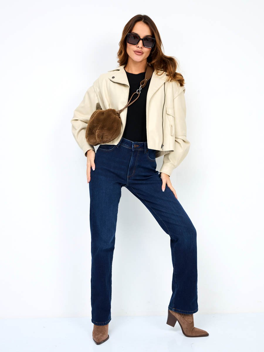 Женские классические джинсы с посадкой Regular fit (полуоблегающие по бедру), прямые к низу от колена. Высокая талия. Для улучшения посадки по талии сделан подкройной пояс из 2-х частей. Выполнены из утепленной слабоэластичной ткани Blue denim comfort stretch, к изнаночной ткани прикреплена дополнительная трикотажная ткань (флис) с мягким, шелковистым и приятным на ощупь ворсом. Темная стирка с потёртостями спереди и сзади.