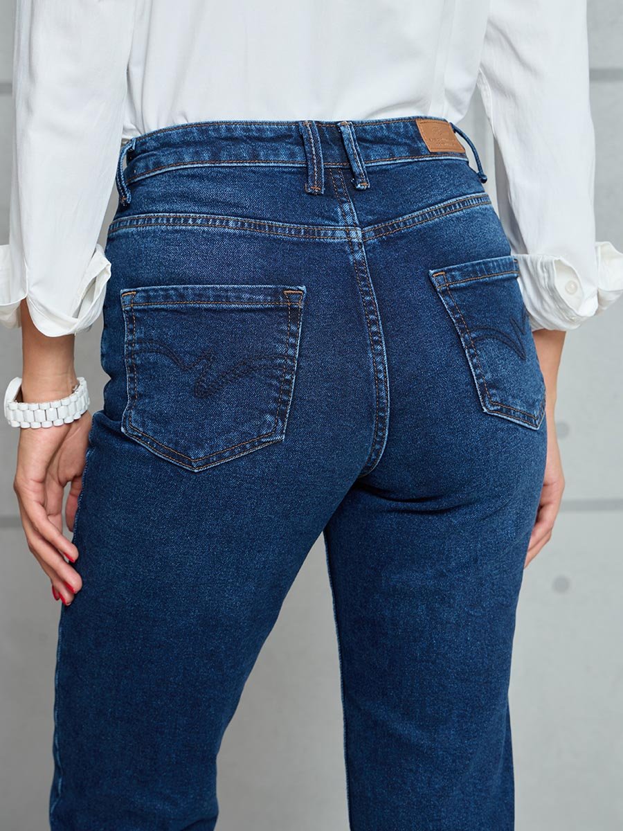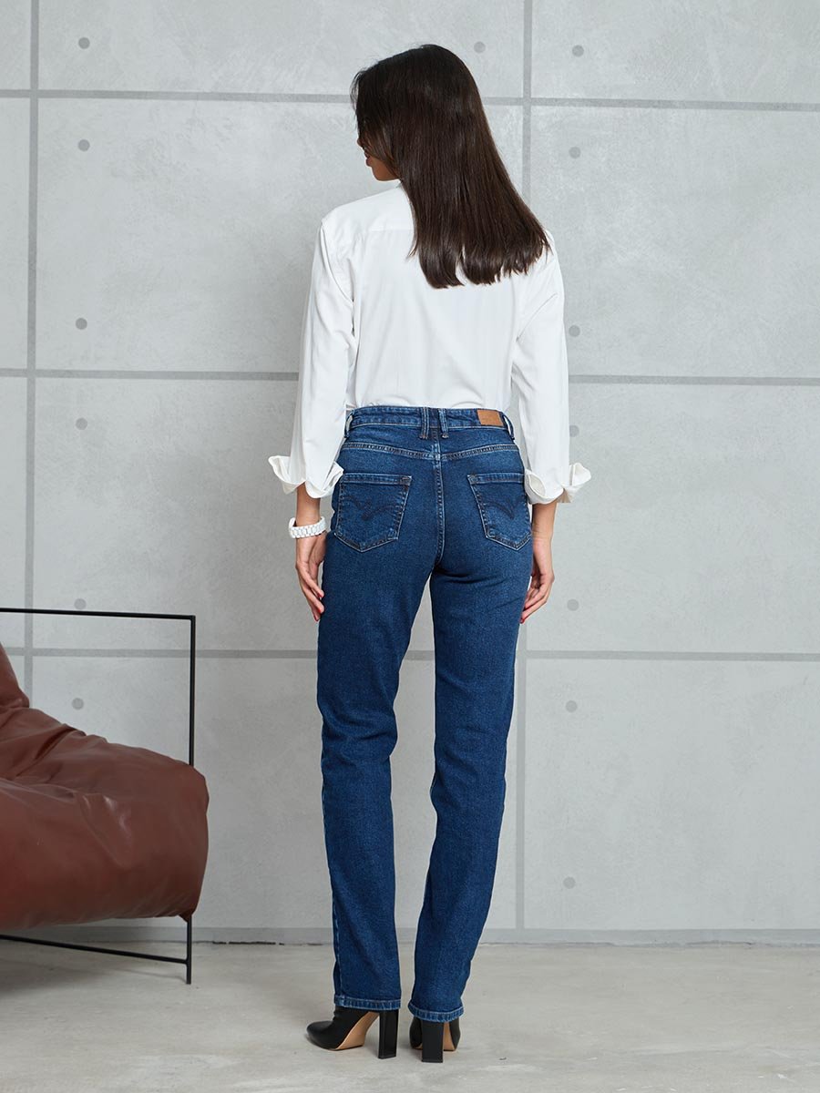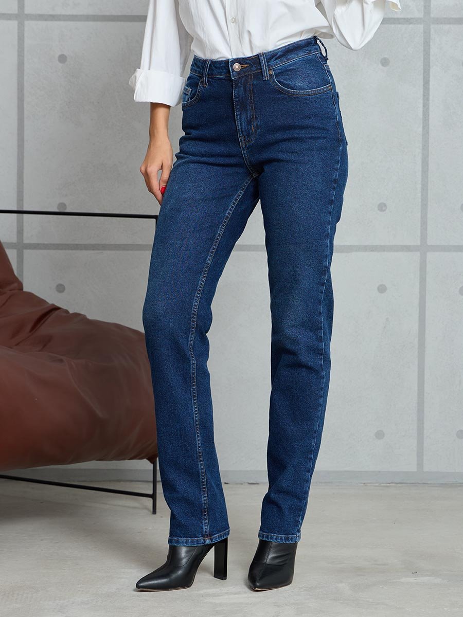 Женские классические джинсы с пятью карманами. Посадка Comfort fit (свободные по бедру). Специально завышенная талия. Для улучшения посадки по талии сделан подкройной пояс из 2-х частей. Застежка на молнии. Зауженные к низу. Выполнены из слабоэластичной ткани denim stretch. Темная стирка "stone wash" со слабовыраженными потертостями спереди и сзади.