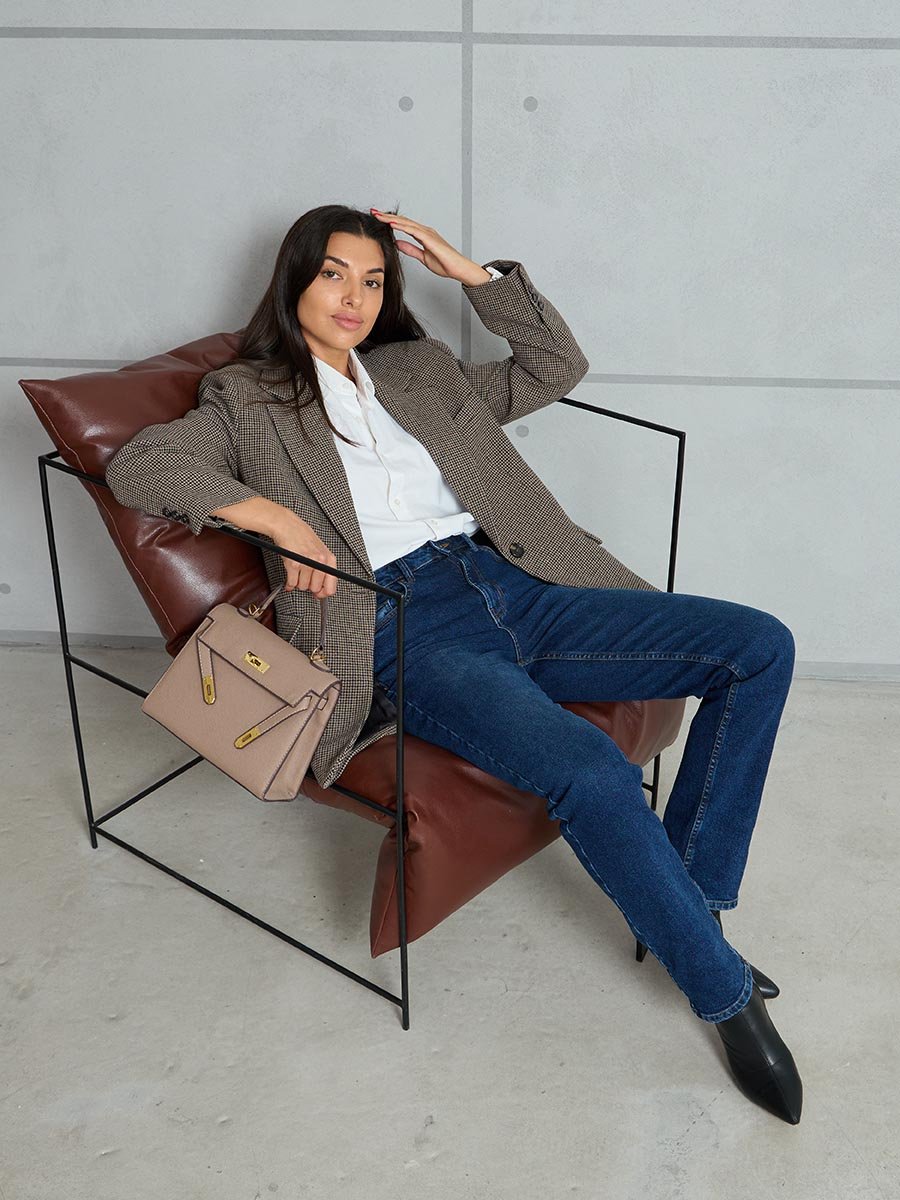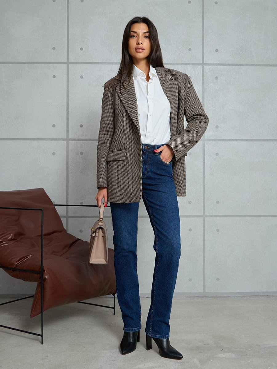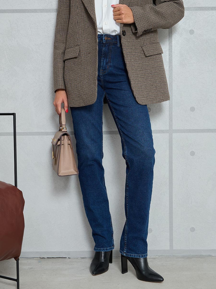 Женские классические джинсы с пятью карманами. Посадка Comfort fit (свободные по бедру). Специально завышенная талия. Для улучшения посадки по талии сделан подкройной пояс из 2-х частей. Застежка на молнии. Зауженные к низу. Выполнены из слабоэластичной ткани denim stretch. Темная стирка "stone wash" со слабовыраженными потертостями спереди и сзади.