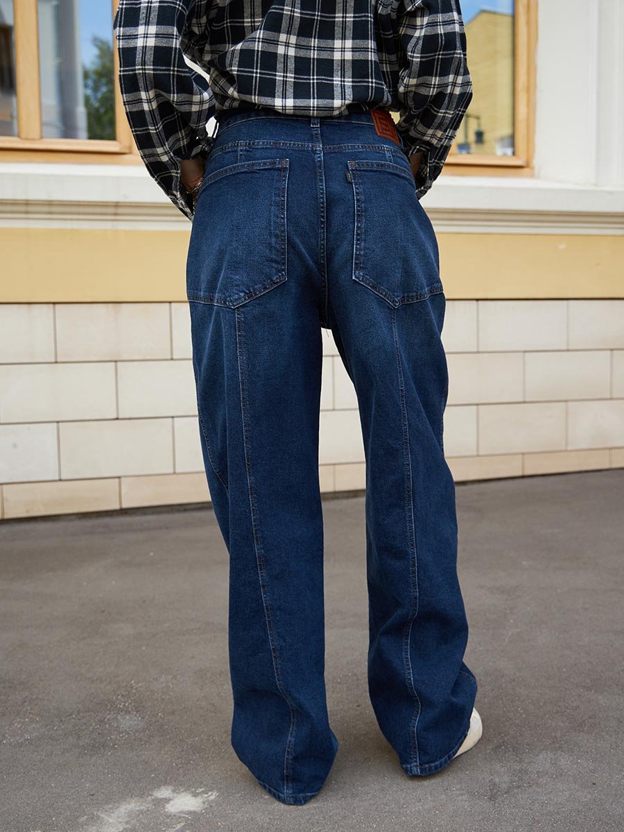 Нестандартный силуэт с смещенным вперед боковым швом и дополнительными швами сзади создают необычный, но узнаваемый мешковатый стиль. Суперширокие задние карманы визуально добавляют объема бедрам, подчеркивая дерзкий силуэт модели.