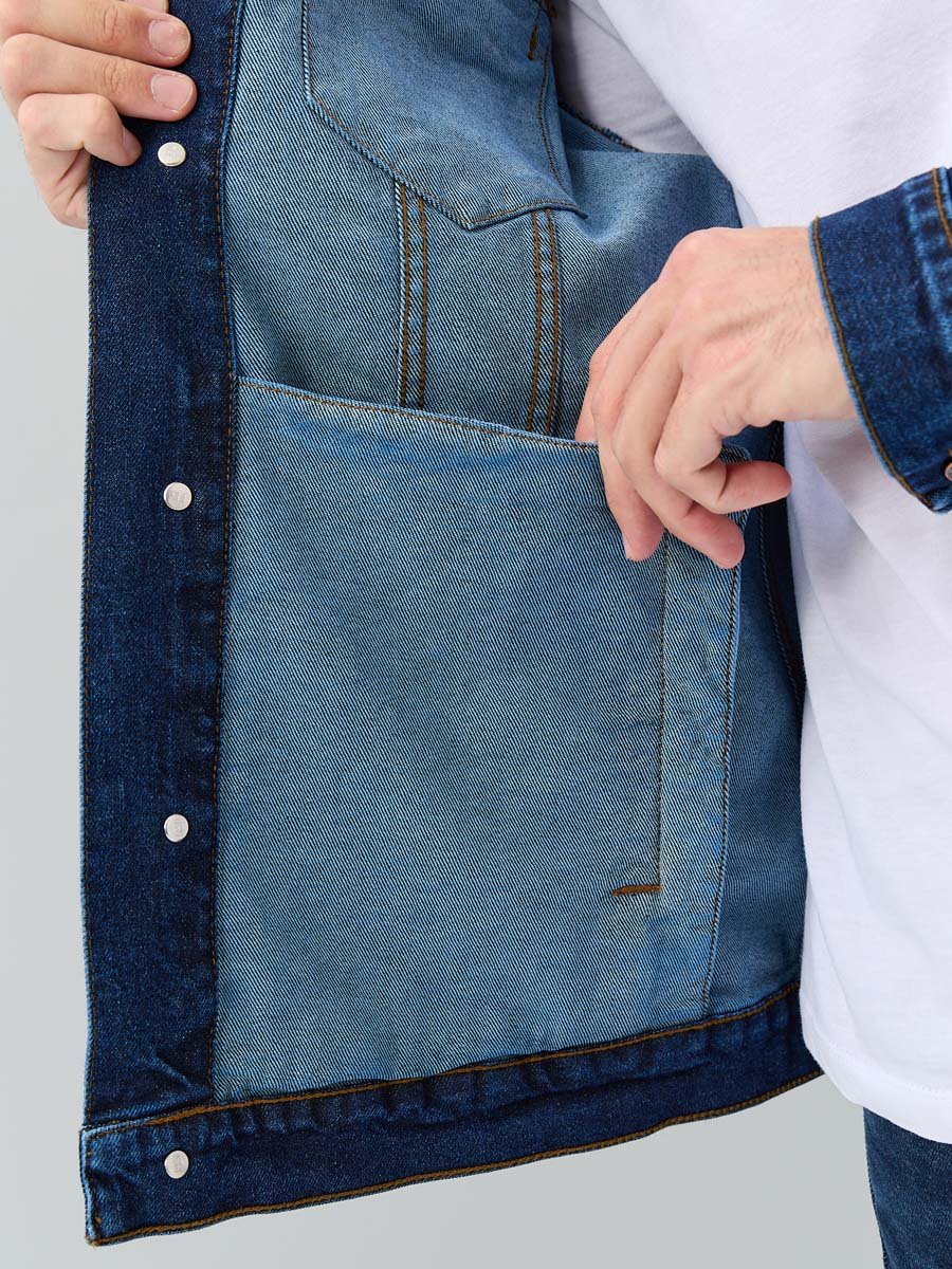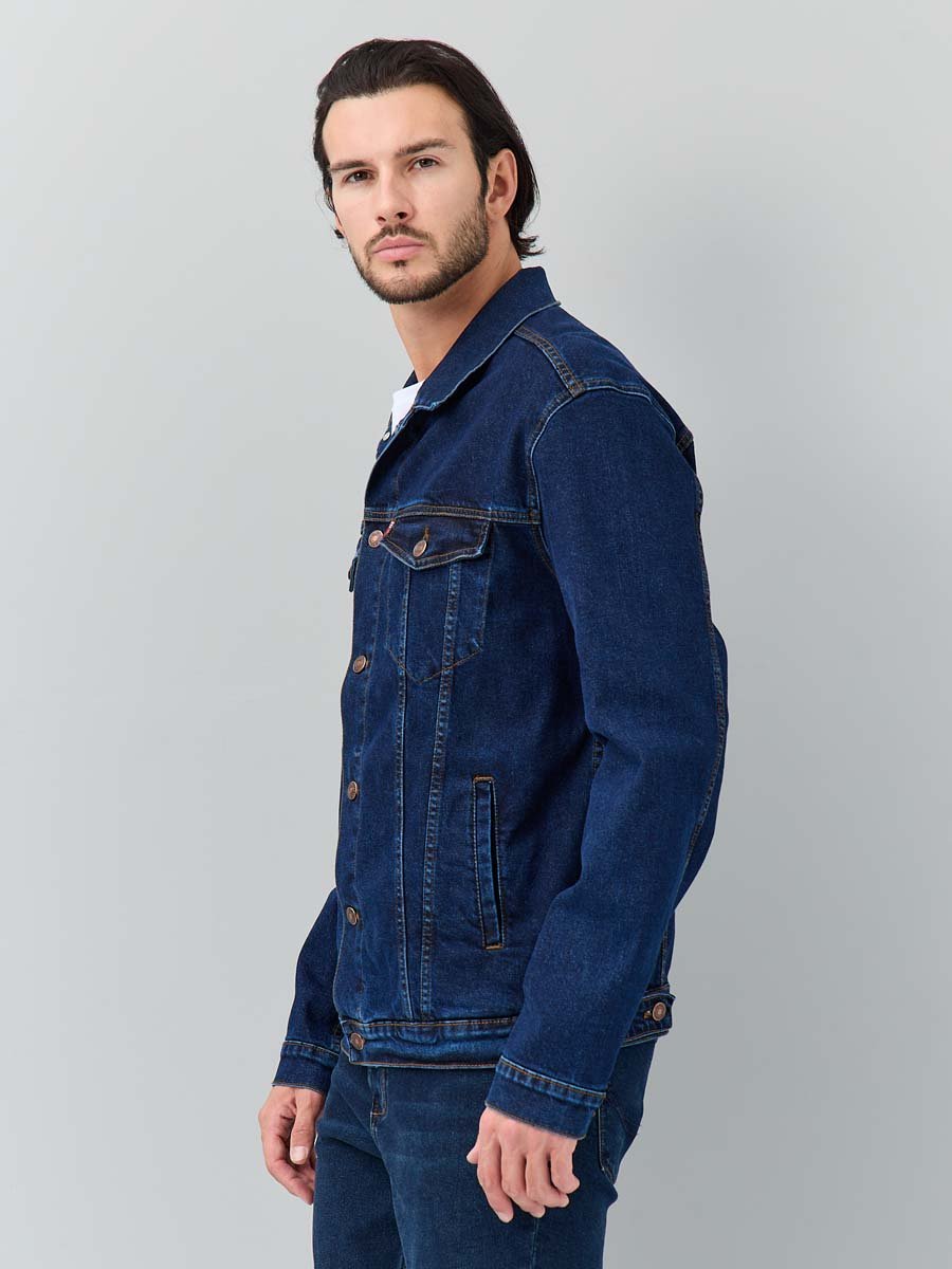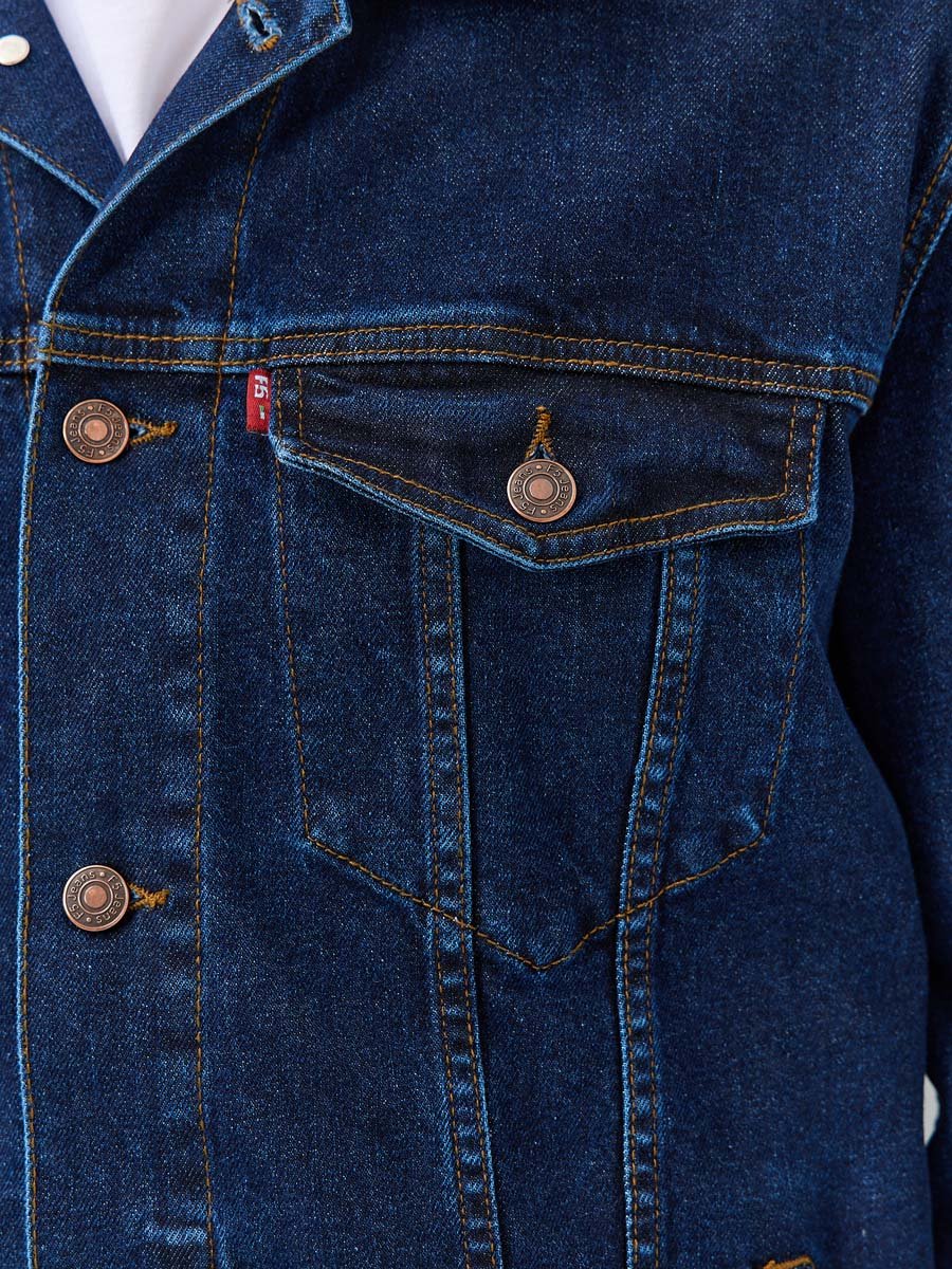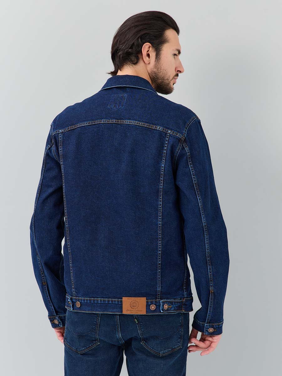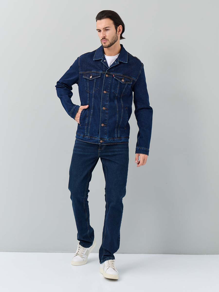 Классическая универсальная джинсовая куртка. Прямой силуэт, пройма и рукава обеспечивают комфорт и не сковывают движения, по низу рукавов манжеты, застегивающиеся на пуговицу; небольшой воротник; на груди карманы с клапаном, также застегивающимся на пуговицу; функциональные боковые прорезные карманы "в листочку"; на поясе по бокам куртки хлястик и две пуговицы, которые позволяют регулировать длину обхвата по поясу. Выполнена из слабоэластичной плотной ткани denim. Классическая темная стирка с потертостями спереди и сзади, а также по швам.
