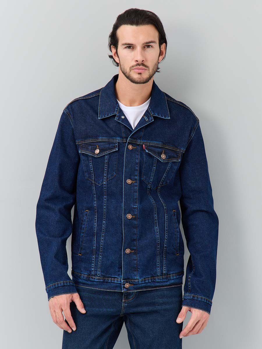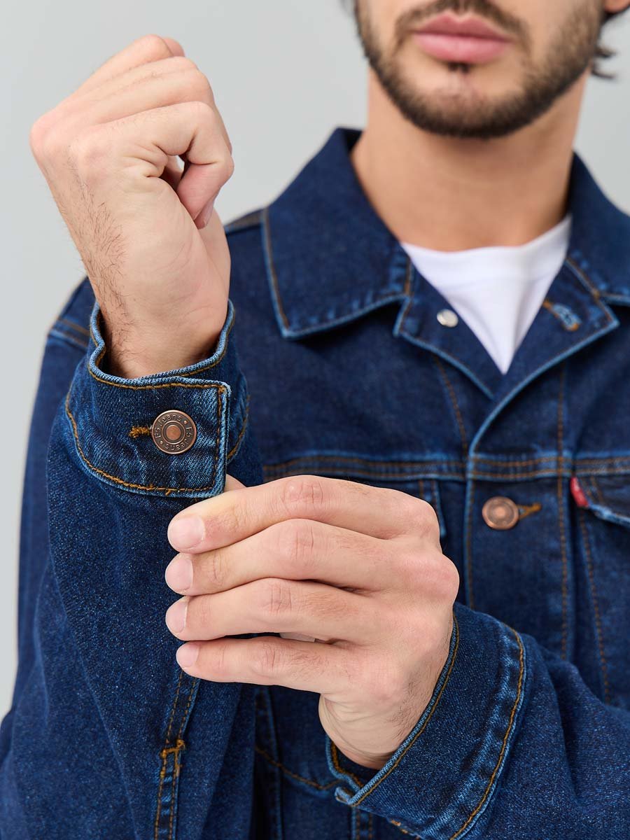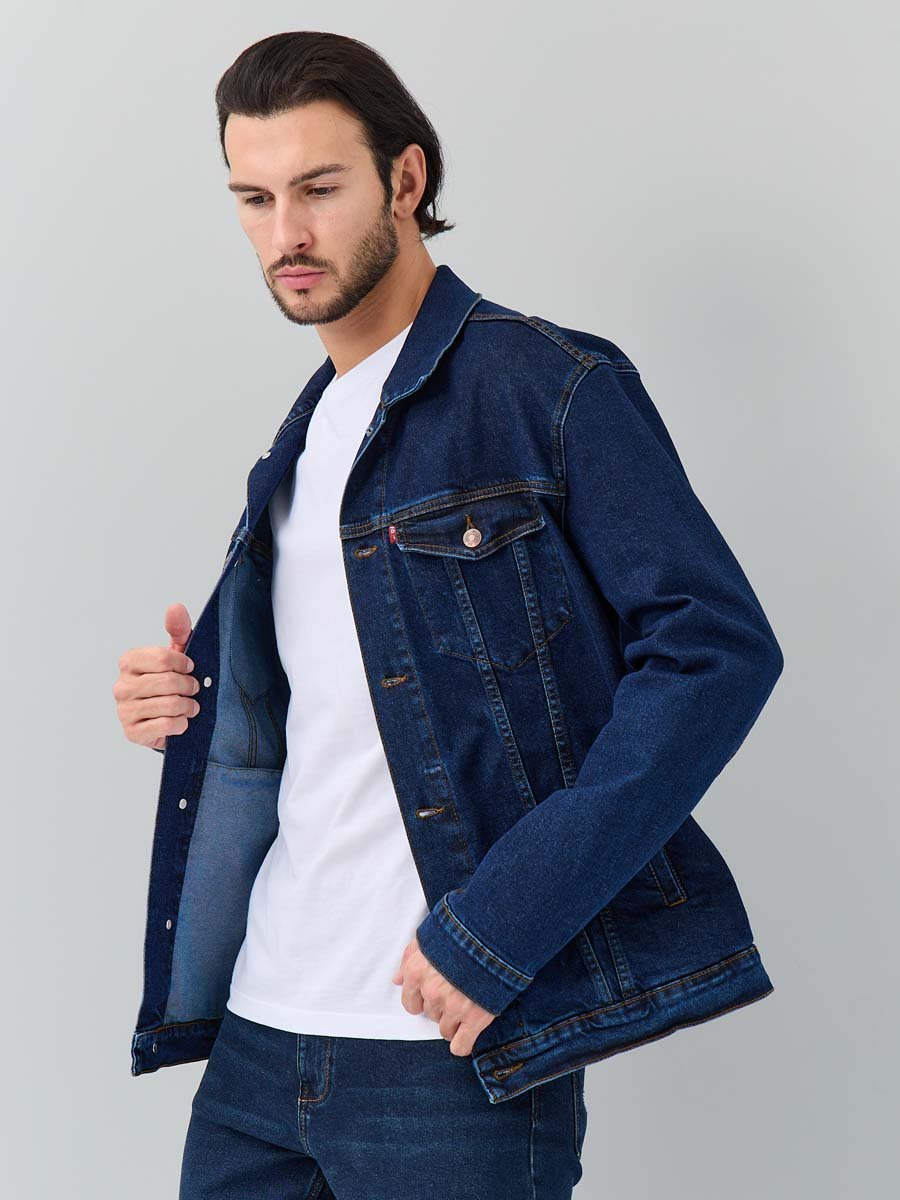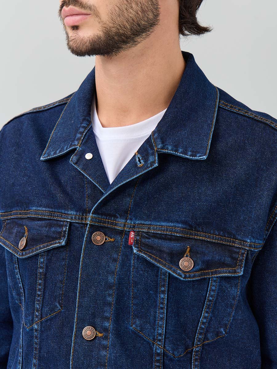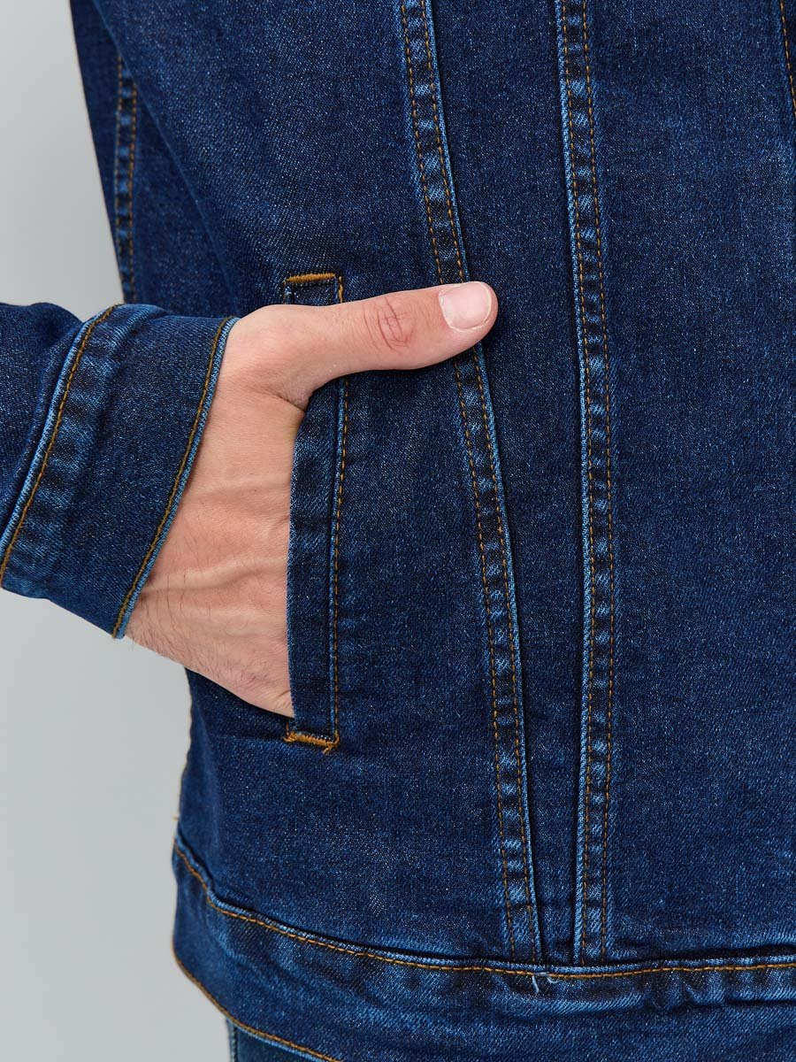 Классическая универсальная джинсовая куртка. Прямой силуэт, пройма и рукава обеспечивают комфорт и не сковывают движения, по низу рукавов манжеты, застегивающиеся на пуговицу; небольшой воротник; на груди карманы с клапаном, также застегивающимся на пуговицу; функциональные боковые прорезные карманы "в листочку"; на поясе по бокам куртки хлястик и две пуговицы, которые позволяют регулировать длину обхвата по поясу. Выполнена из слабоэластичной плотной ткани denim. Классическая темная стирка с потертостями спереди и сзади, а также по швам.