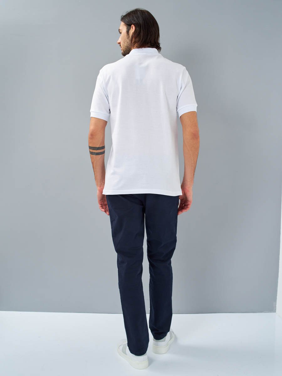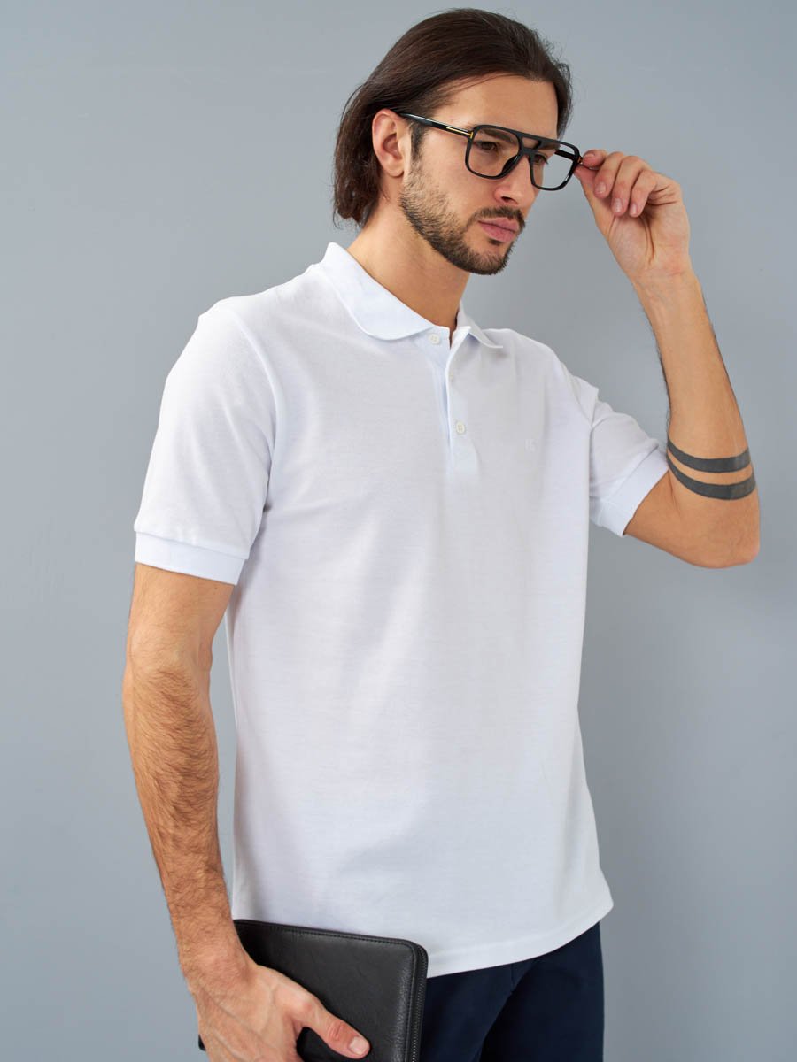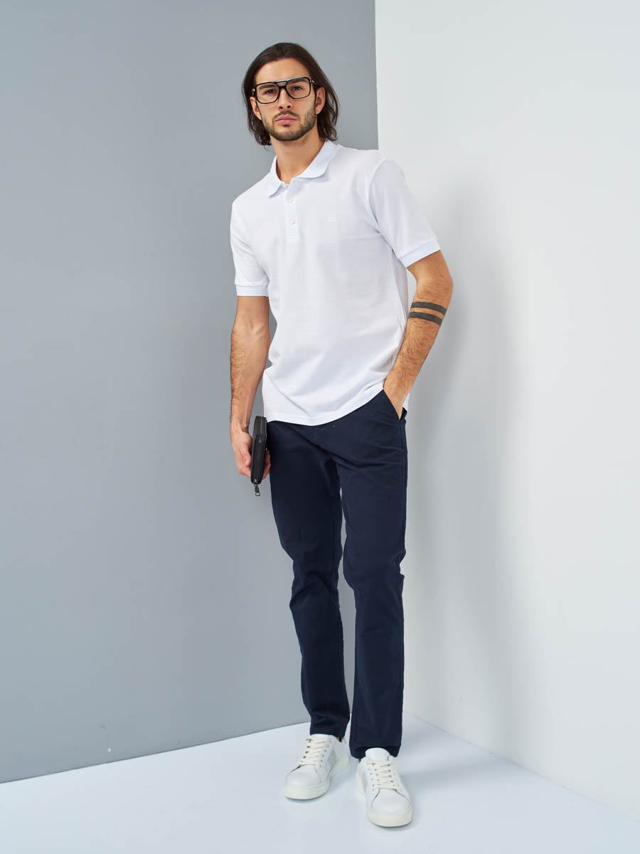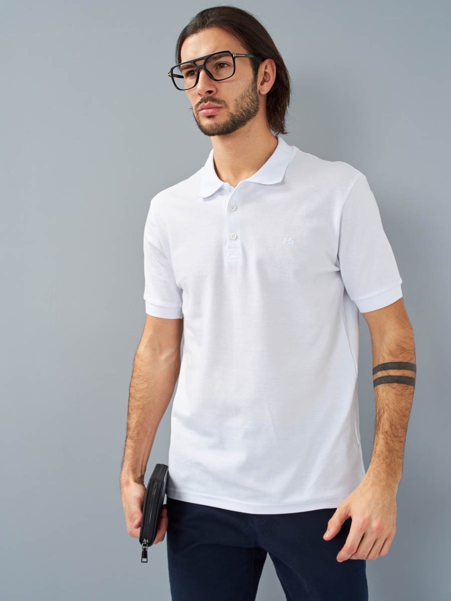 Классическая мужская футболка поло F5, Regular fit (полуприлегающий силуэт), с вышивкой-фирменным логотипом. Выполнена из трикотажного полотна пике (pique). С отложным воротником и короткими рукавами. Застежка-планка обработана пике контрастного цвета, застегивается на 3 пуговицы.