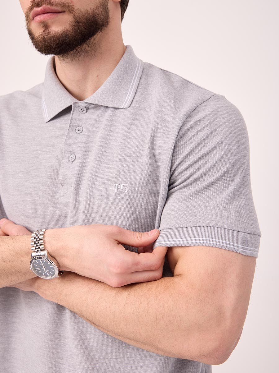 Классическая мужская футболка поло F5, Regular fit (полуприлегающий силуэт), с вышивкой-фирменным логотипом. Выполнена из трикотажного полотна пике (pique). С отложным воротником и короткими рукавами. Застежка-планка застегивается на 3 пуговицы.