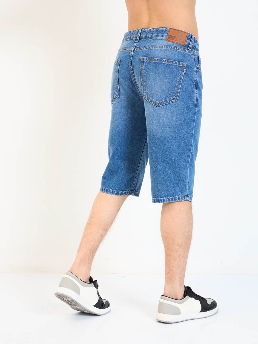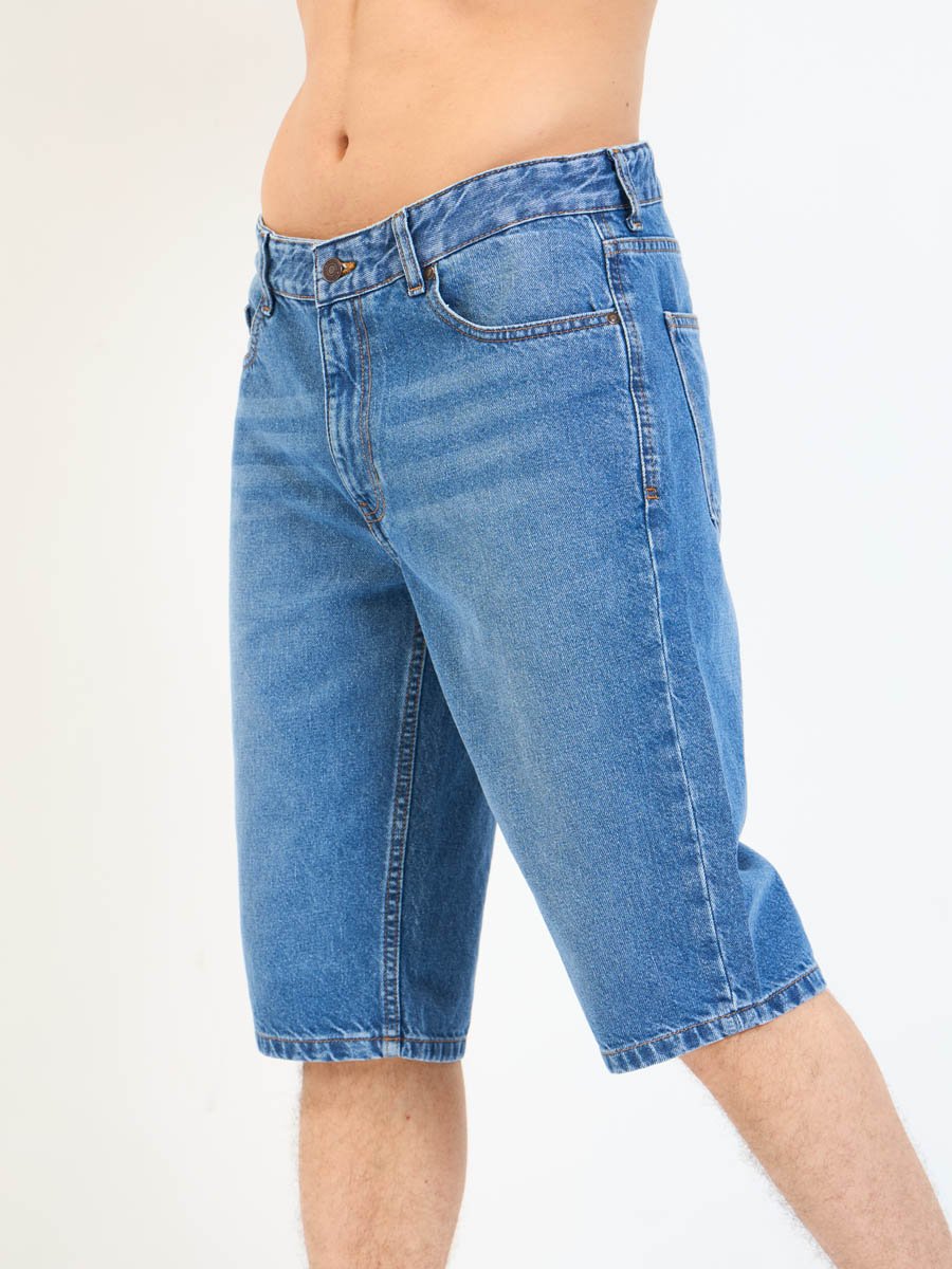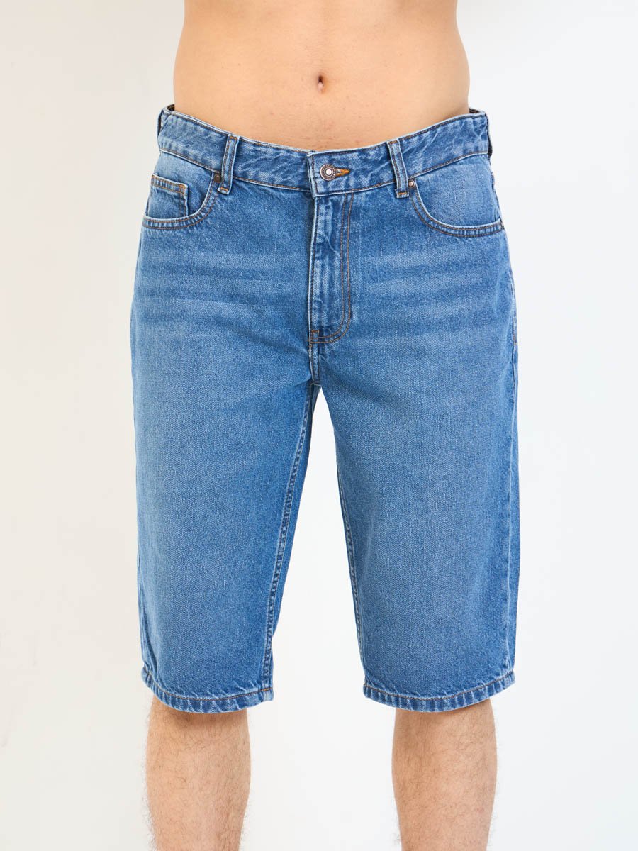 Мужские классические джинсовые шорты с пятью карманами. Посадка Regular fit (полуоблегающие по бедру), Средняя талия спереди и высокая сзади, немного зауженные к низу.Застежка на молнии. Выполнены из традиционной хлопковой ткани denim. Средняя стирка с потёртостями и "усами" спереди и потёртостями сзади.