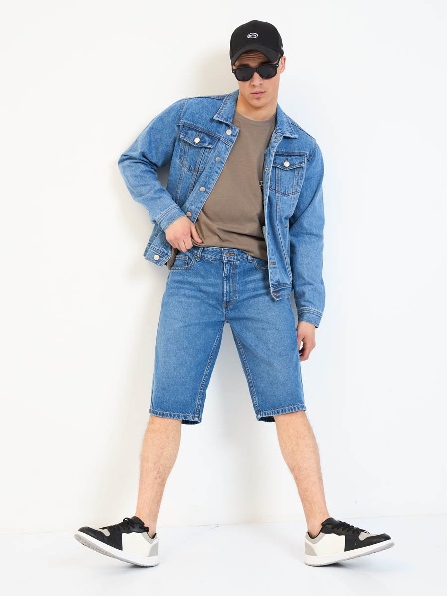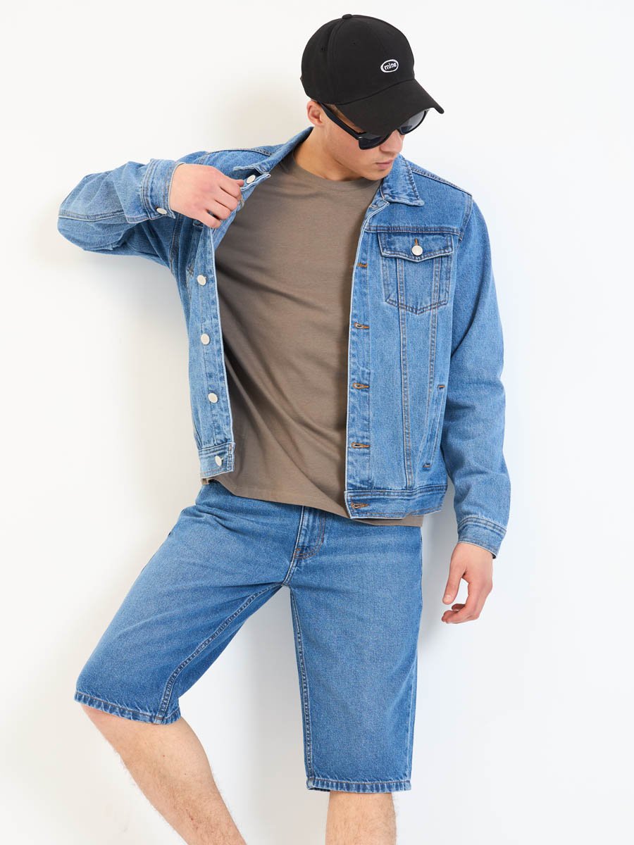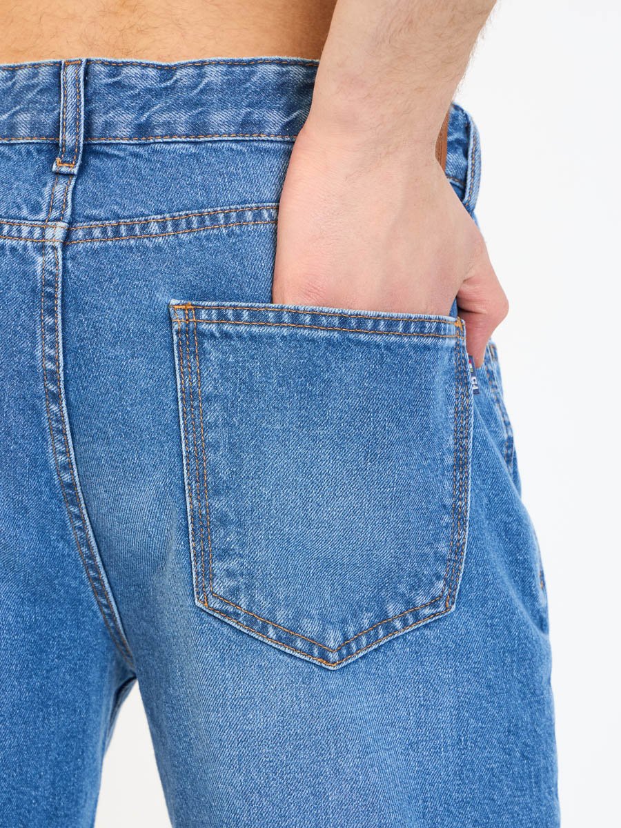 Мужские классические джинсовые шорты с пятью карманами. Посадка Regular fit (полуоблегающие по бедру), Средняя талия спереди и высокая сзади, немного зауженные к низу.Застежка на молнии. Выполнены из традиционной хлопковой ткани denim. Средняя стирка с потёртостями и "усами" спереди и потёртостями сзади.