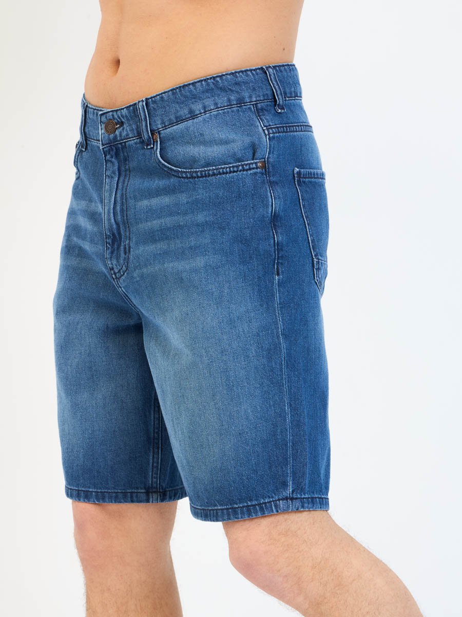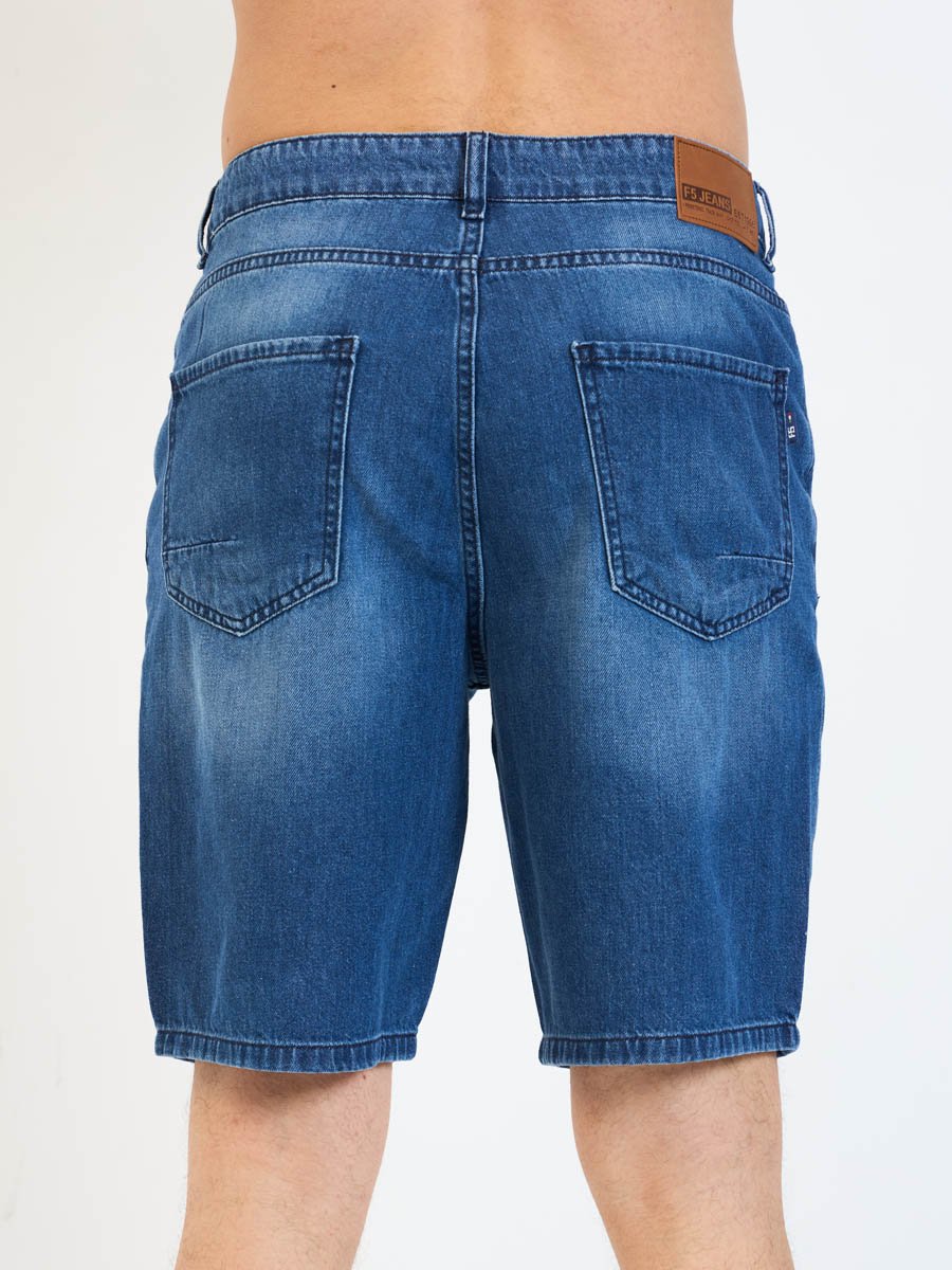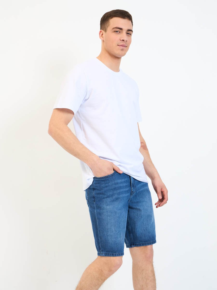 Мужские джинсовые шорты с пятью карманами. Посадка Regular fit (полуоблегающие по бедру), Высокая талия спереди и сзади.Застежка на молнии. Выполнены из облегченной хлопковой ткани denim. Средняя стирка с потёртостями и "усами" спереди и потёртостями сзади.