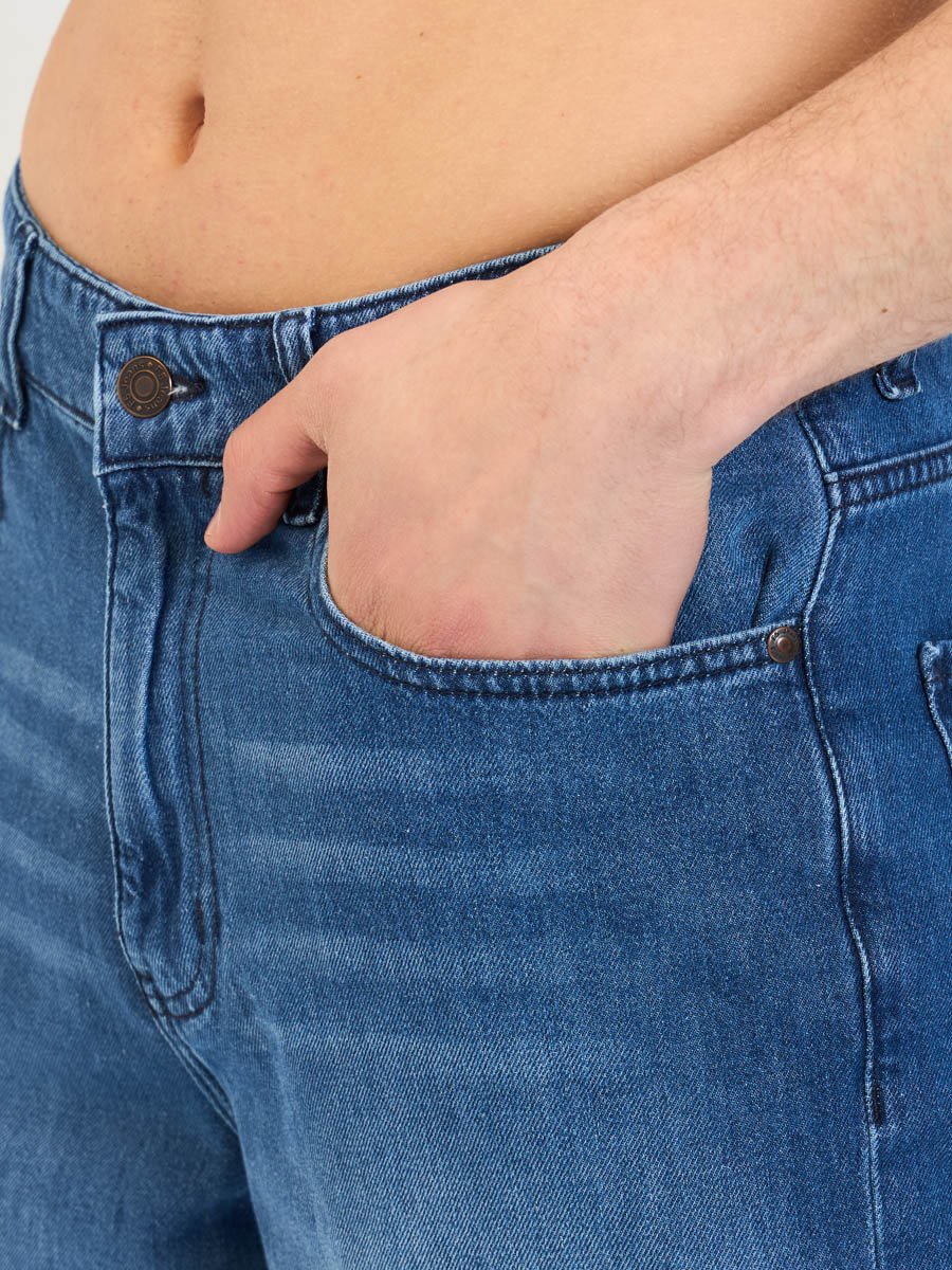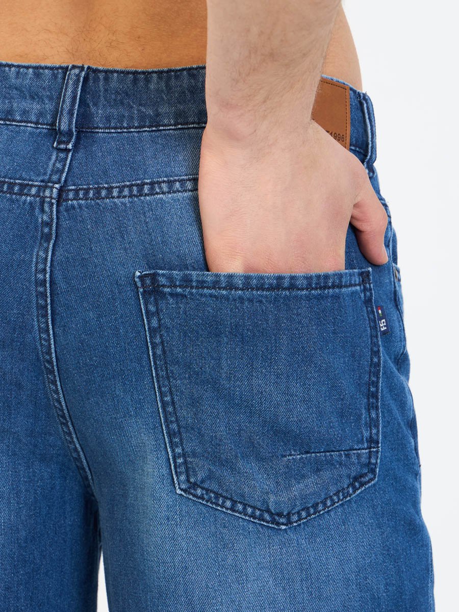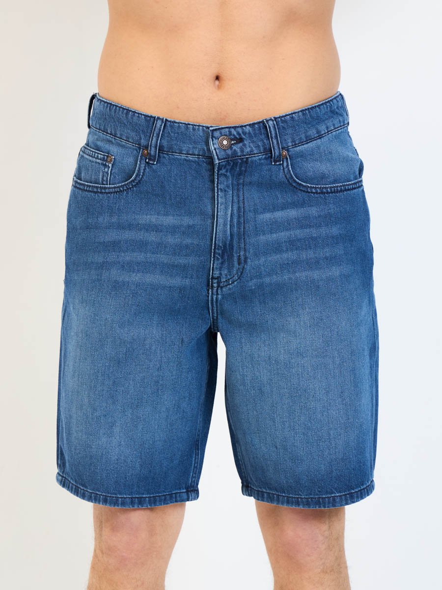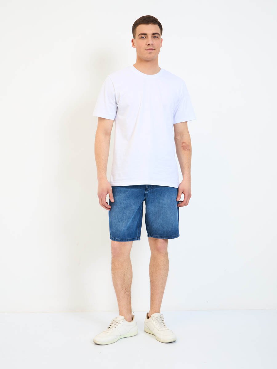 Мужские джинсовые шорты с пятью карманами. Посадка Regular fit (полуоблегающие по бедру), Высокая талия спереди и сзади.Застежка на молнии. Выполнены из облегченной хлопковой ткани denim. Средняя стирка с потёртостями и "усами" спереди и потёртостями сзади.