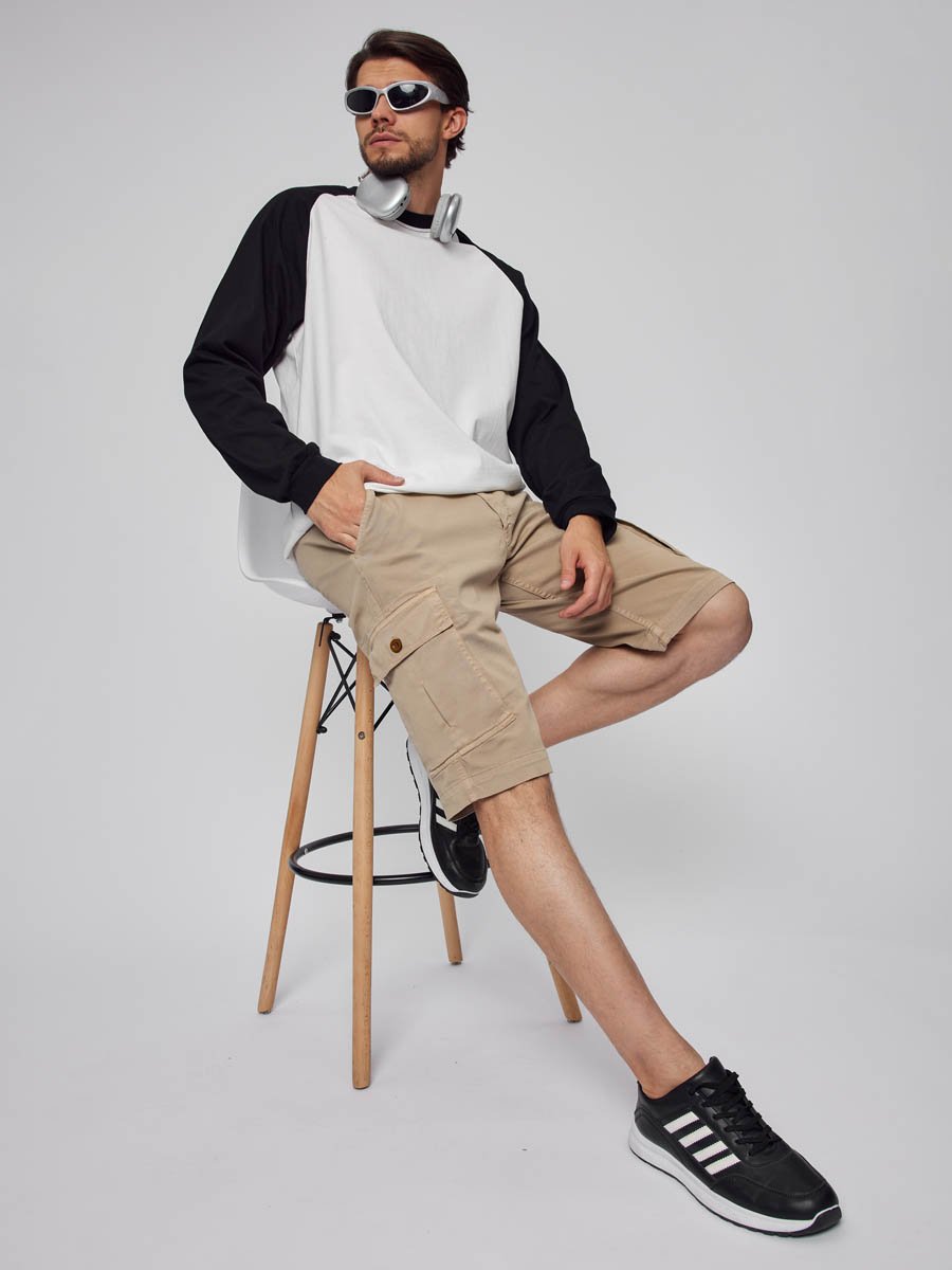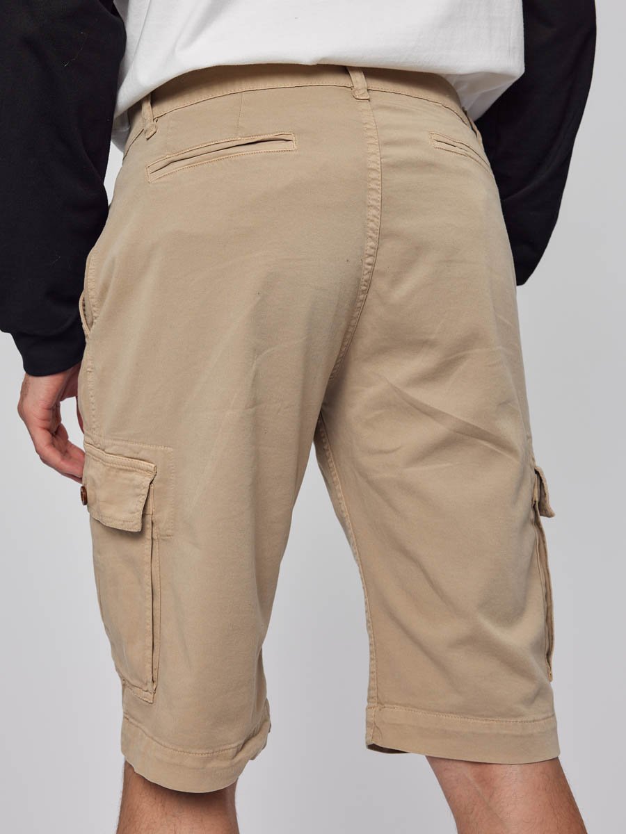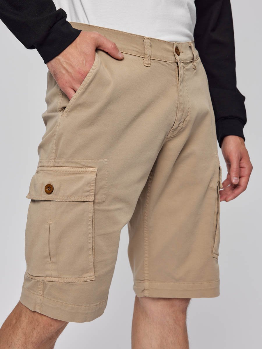 Мужские шорты-карго. Посадка Comfort fit (свободные по бедру), средняя посадка по талии спереди и высокая сзади, прямые к низу. Застежка на молнии. Шорты имеют боковые косые карманы, по бокам накладные карманы с клапаном застегивающиеся на пуговицу, сзади имитация прорезных карманов. Выполнены из слабоэластичной плотной ткани gabardine stretch. Крашение Garment dayed, т.е. покрашены в готовом виде после пошива.