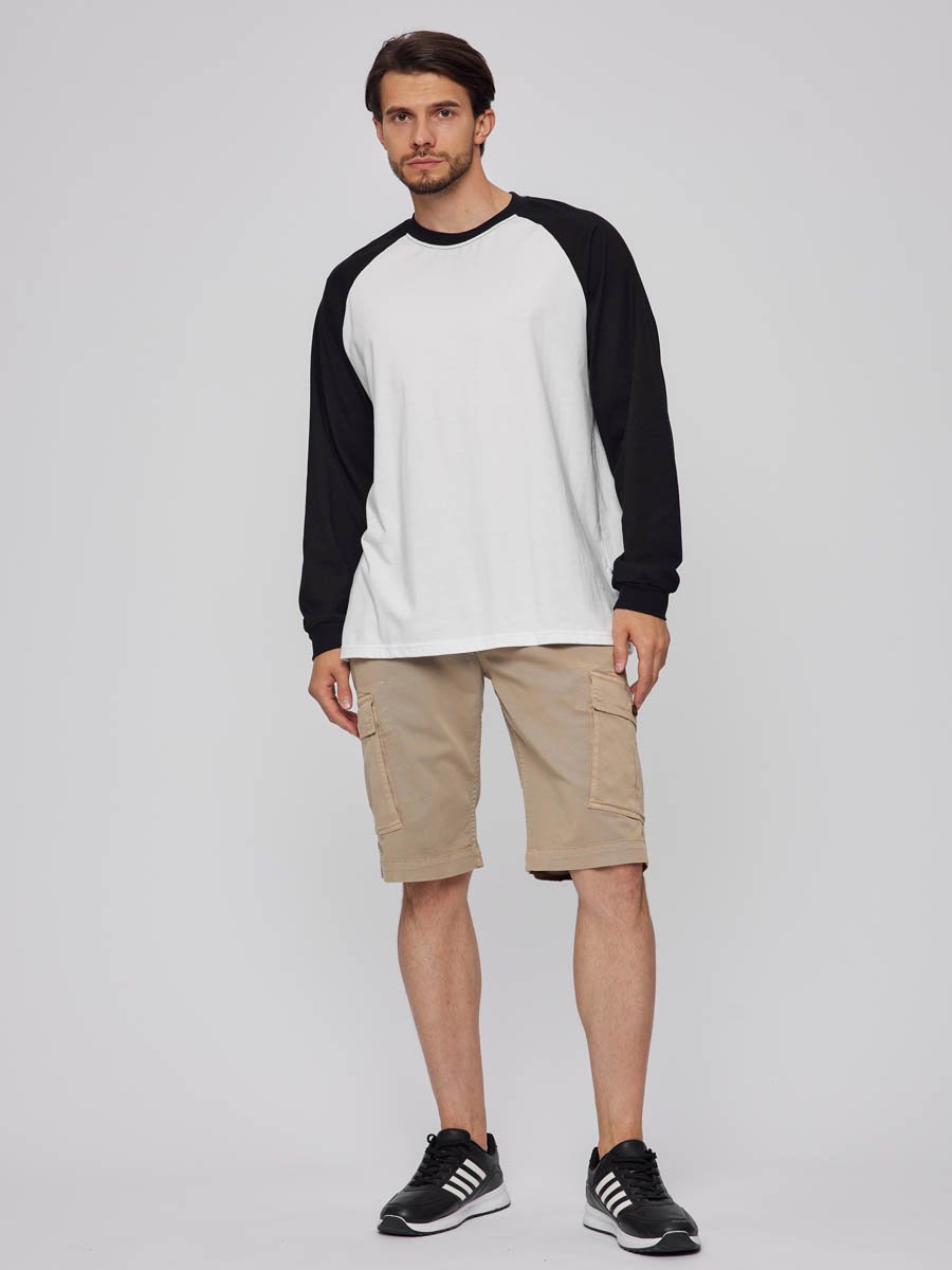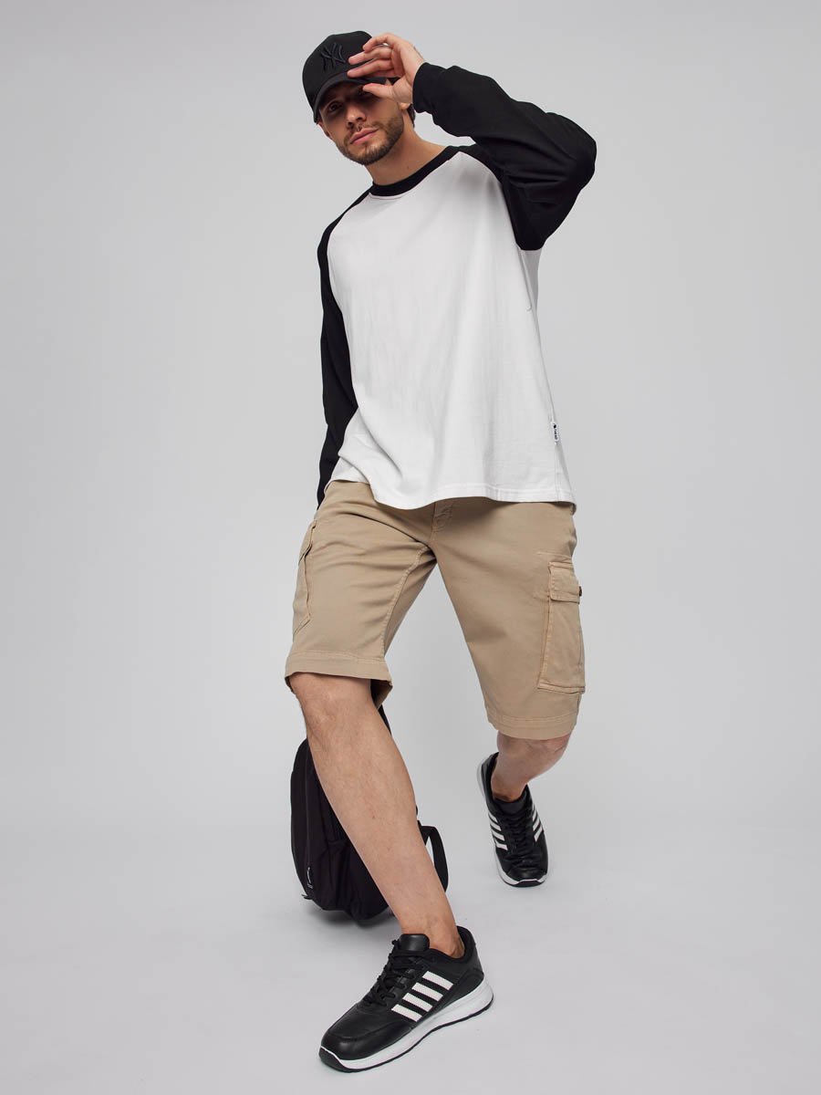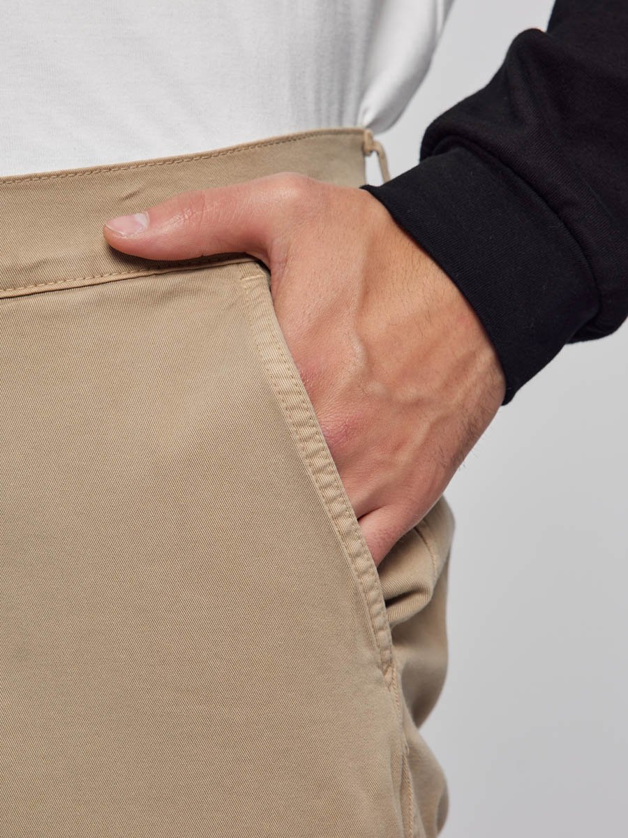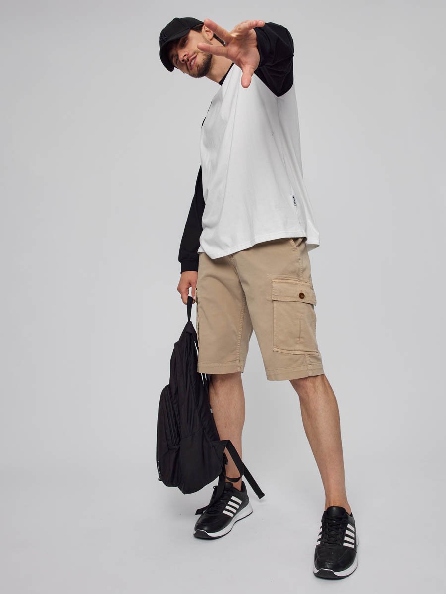 Мужские шорты-карго. Посадка Comfort fit (свободные по бедру), средняя посадка по талии спереди и высокая сзади, прямые к низу. Застежка на молнии. Шорты имеют боковые косые карманы, по бокам накладные карманы с клапаном застегивающиеся на пуговицу, сзади имитация прорезных карманов. Выполнены из слабоэластичной плотной ткани gabardine stretch. Крашение Garment dayed, т.е. покрашены в готовом виде после пошива.