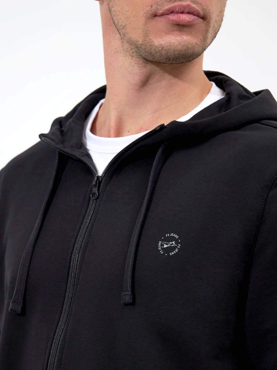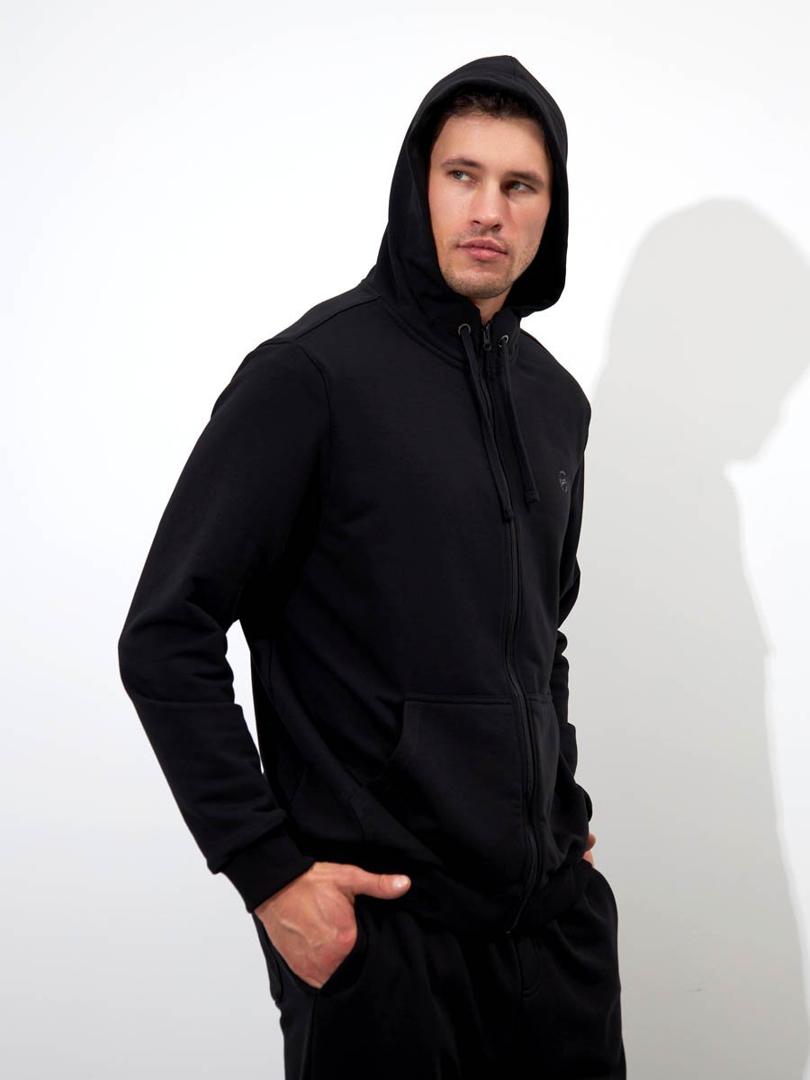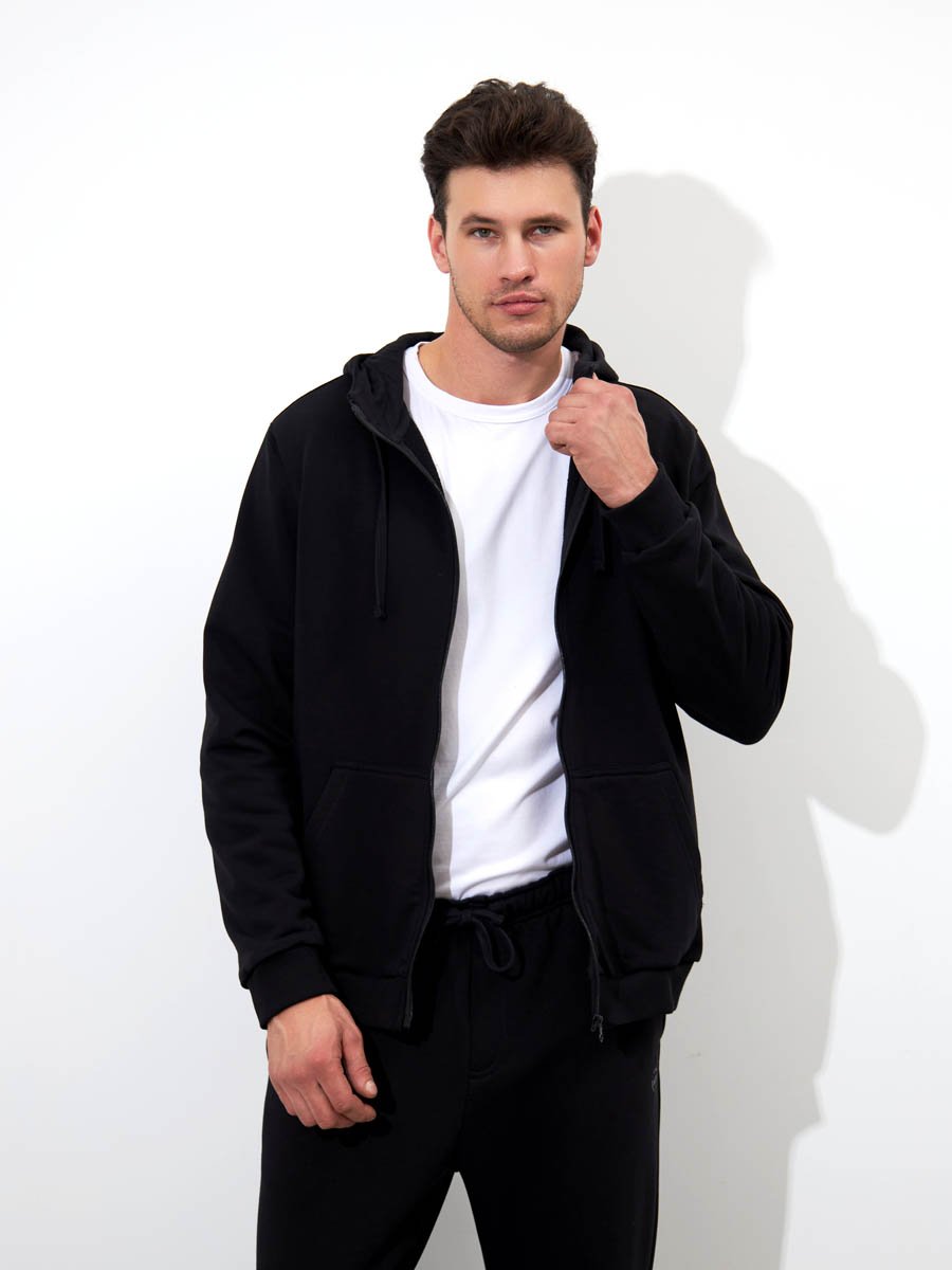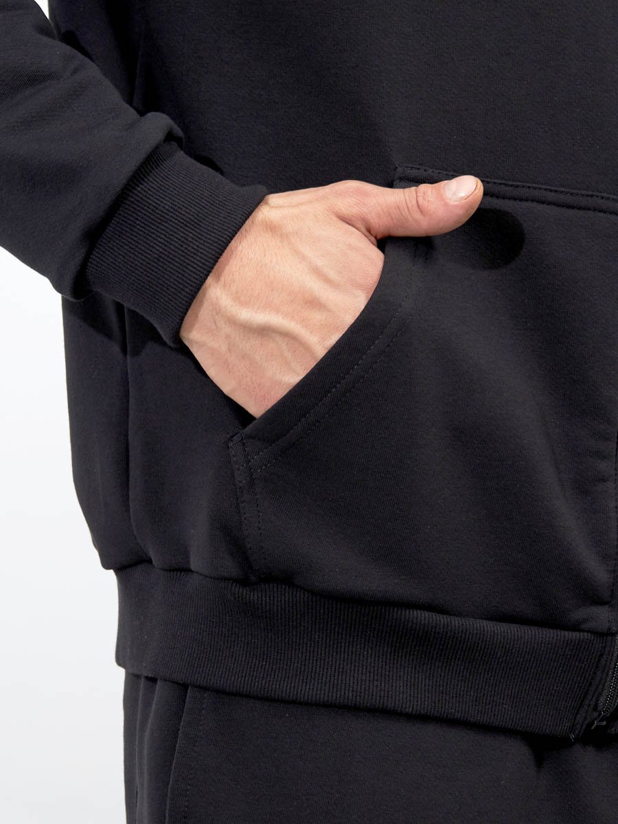 Классическая толстовка на молнии, выполнена из хлопкового полотна с добавлением полиэстера. Мягкая и приятная на ощупь, обладает хорошей гигроскопичностью, позволяет коже дышать. Модель с капюшоном и длинными рукавами не сковывает движений, обеспечивая комфорт. Объем капюшона регулируется при помощи шнура. Манжеты рукавов и низ толстовки оснащены эластичными резинками. Спереди толстовка дополнена карманом "кенгуру".