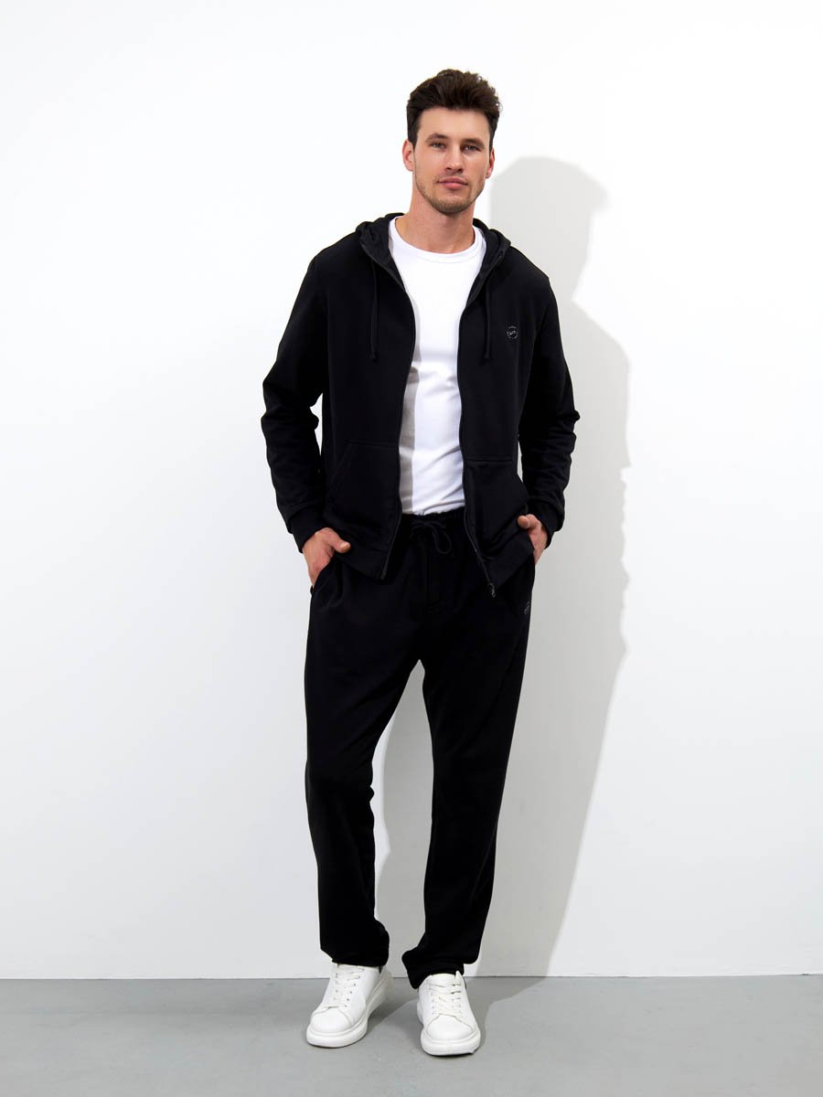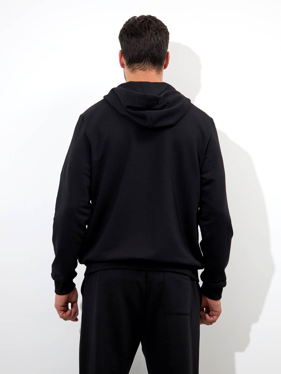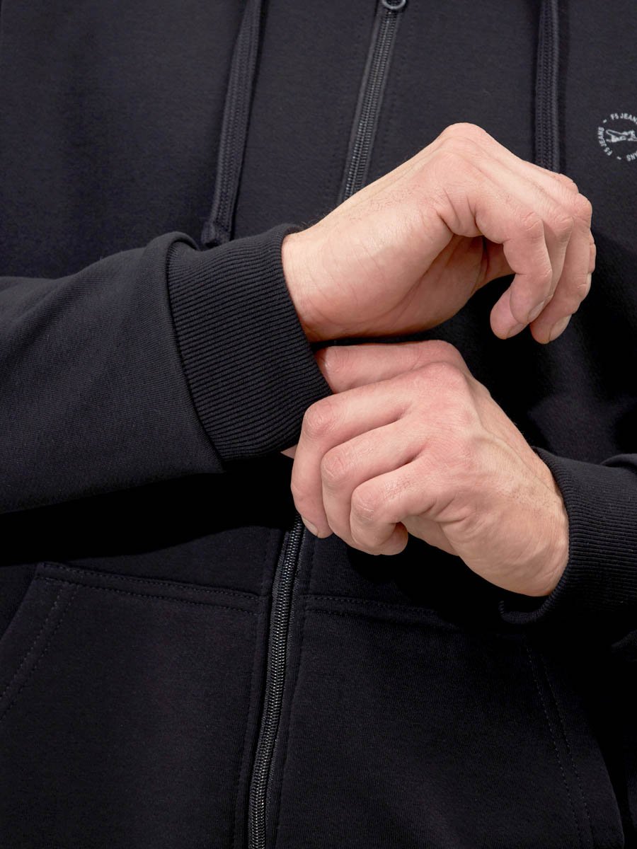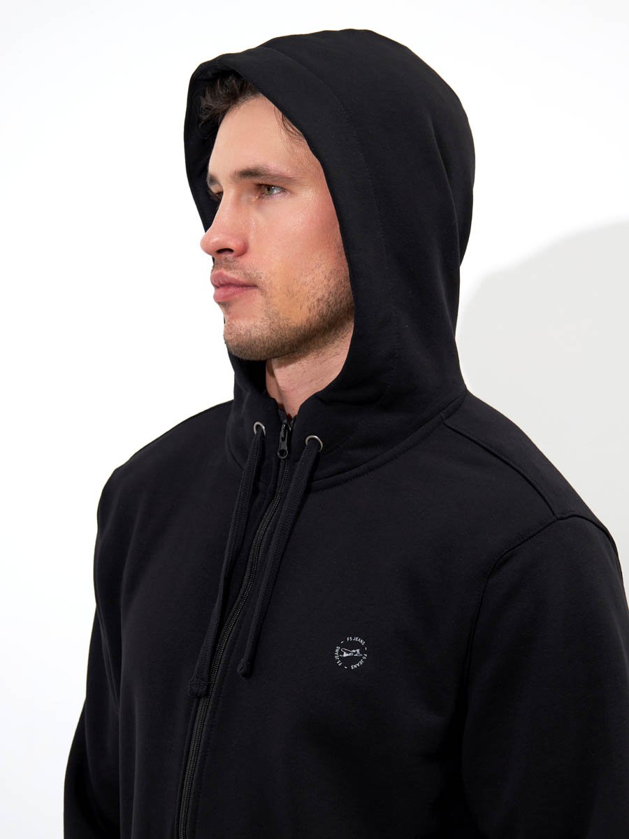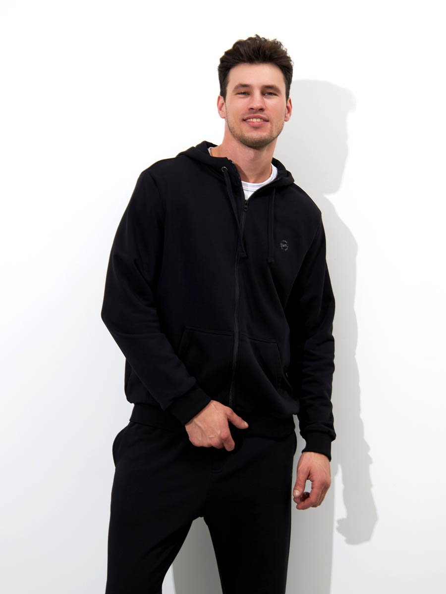 Классическая толстовка на молнии, выполнена из хлопкового полотна с добавлением полиэстера. Мягкая и приятная на ощупь, обладает хорошей гигроскопичностью, позволяет коже дышать. Модель с капюшоном и длинными рукавами не сковывает движений, обеспечивая комфорт. Объем капюшона регулируется при помощи шнура. Манжеты рукавов и низ толстовки оснащены эластичными резинками. Спереди толстовка дополнена карманом "кенгуру".