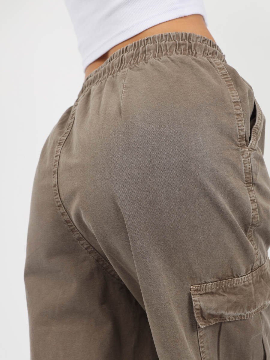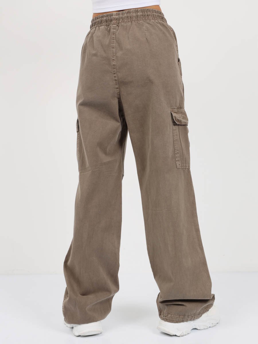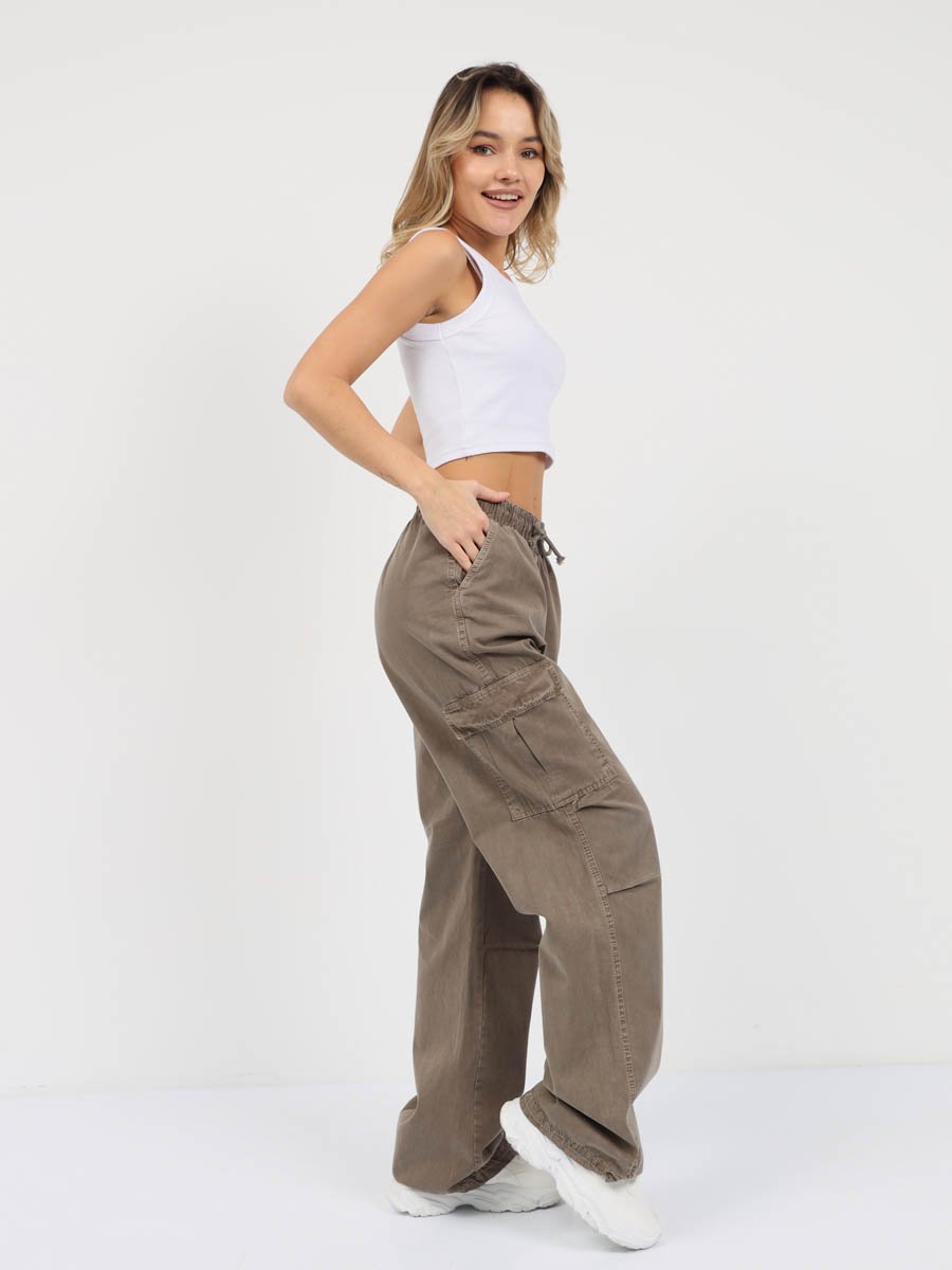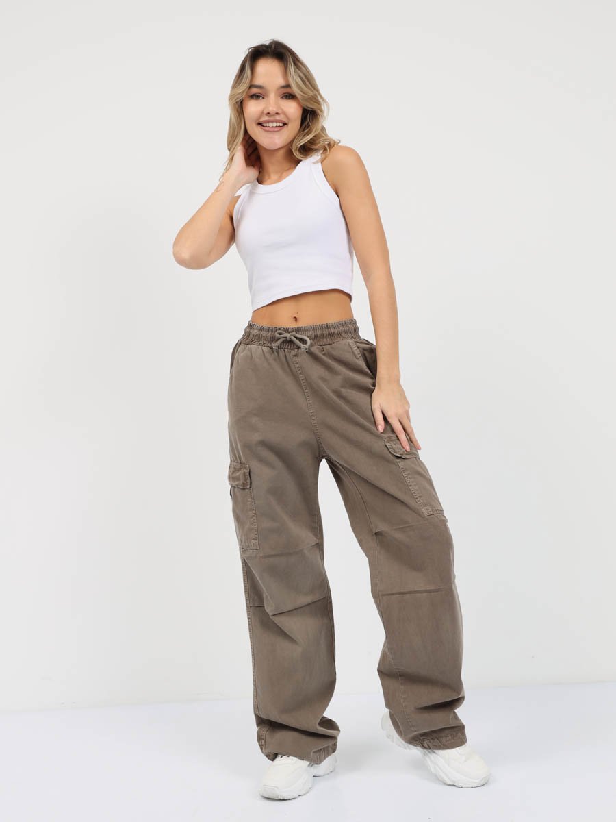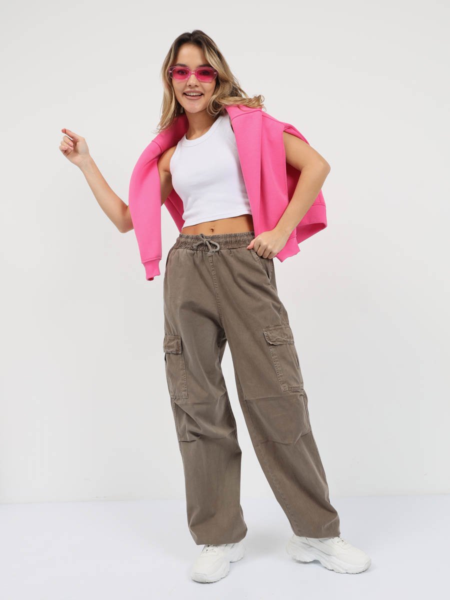 Женские модные брюки карго-парашюты. Посадка Loose fit (широкие по бедру), прямые, широкие штанины по всей длине. Для получения дополнительного объема спереди в области колена сделаны две складки. Высокая посадка по талии, пояс на эластичной резинке со шнуром. Без застежки по гульфику. Брюки имеют боковые косые карманы, по бокам накладные карманы с клапаном. По низу штанин вставлена круглая шляпная резинка, которую с помощью фиксатора можно затянуть и получить стиль брюк "парашюты". Выполнены из мягкой ткани gabardine. Крашение Garment dayed , т.е. брюки покрашены в готовом виде после пошива. Параметры указаны для размера S. Длина шагового шва - 81,0 см.