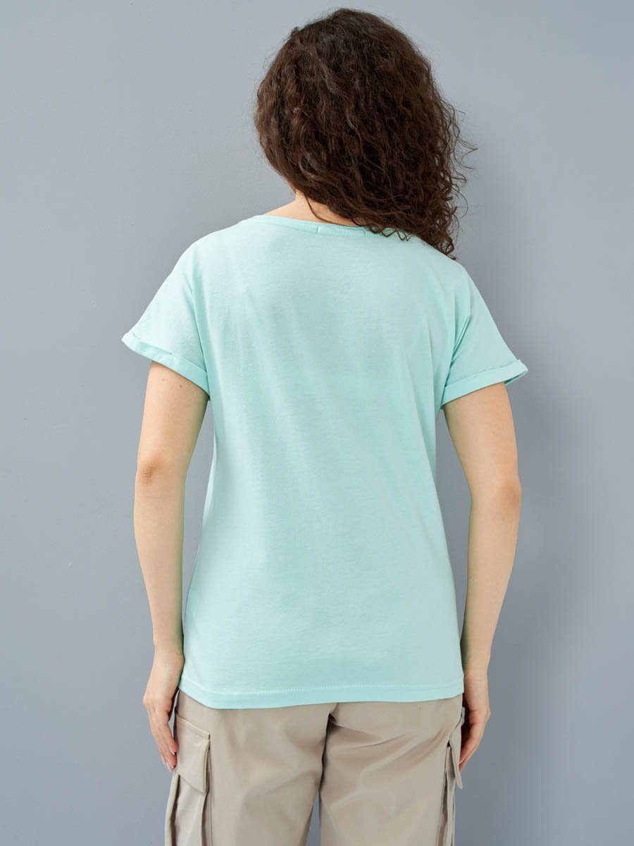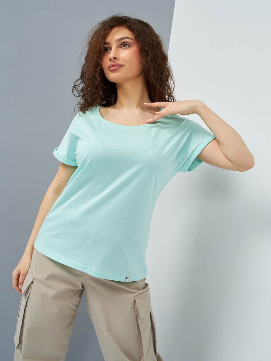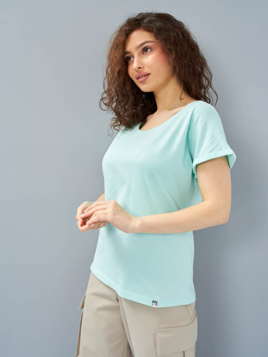 Женская футболка F5, Comfort fit (свободный силуэт), круглый вырез горловины, короткий цельнокроеный рукав с отворотами. Выполнена из классического трикотажного полотна.
