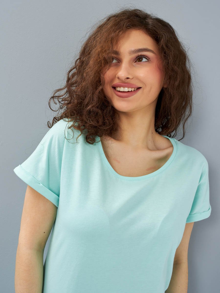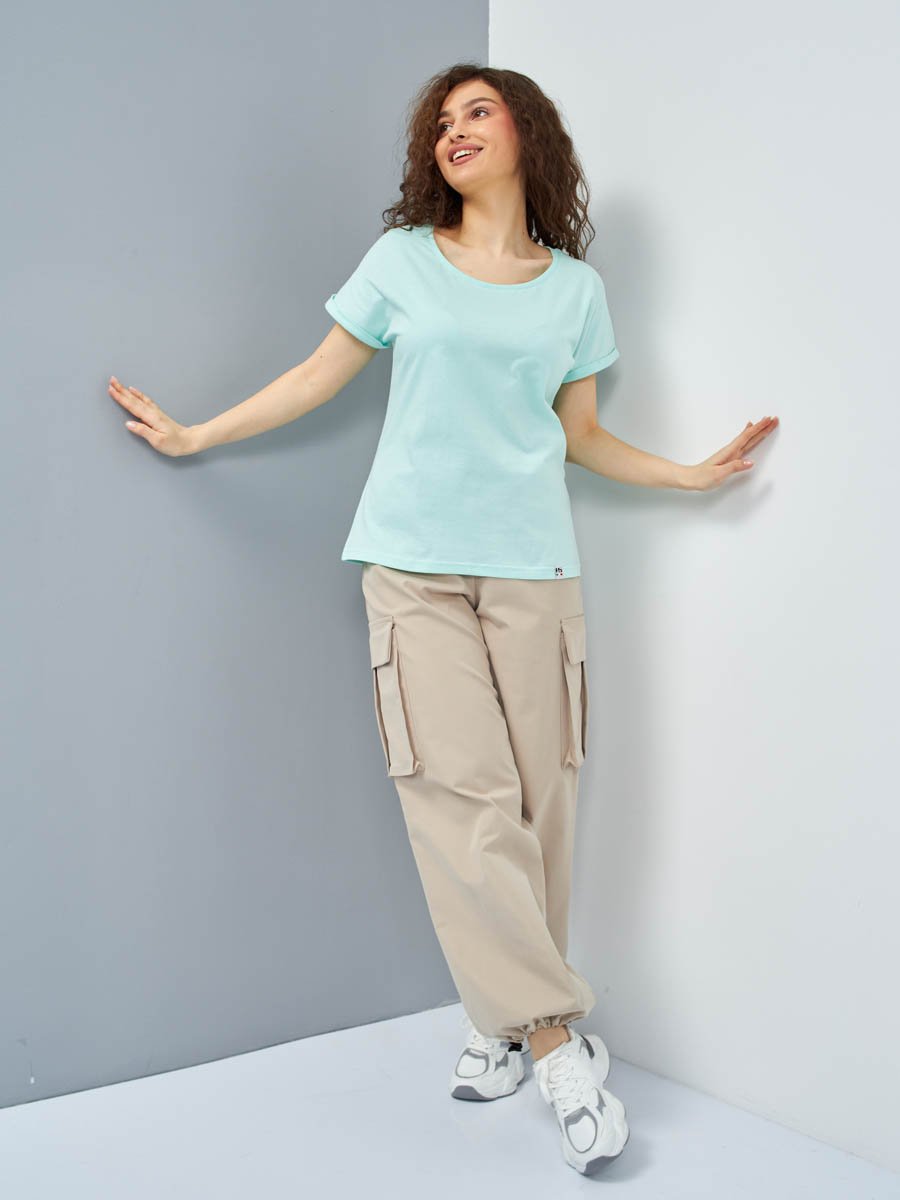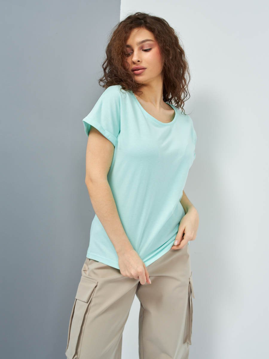 Женская футболка F5, Comfort fit (свободный силуэт), круглый вырез горловины, короткий цельнокроеный рукав с отворотами. Выполнена из классического трикотажного полотна.