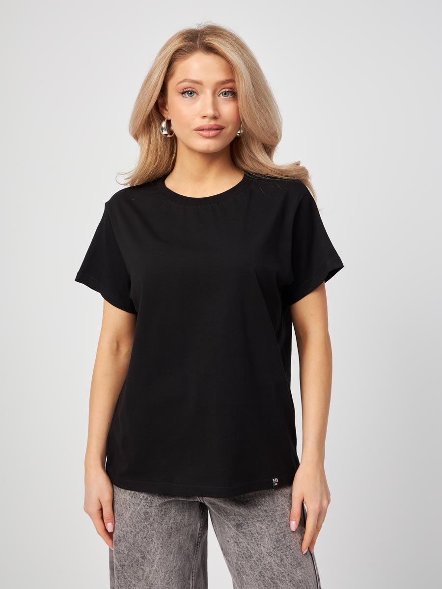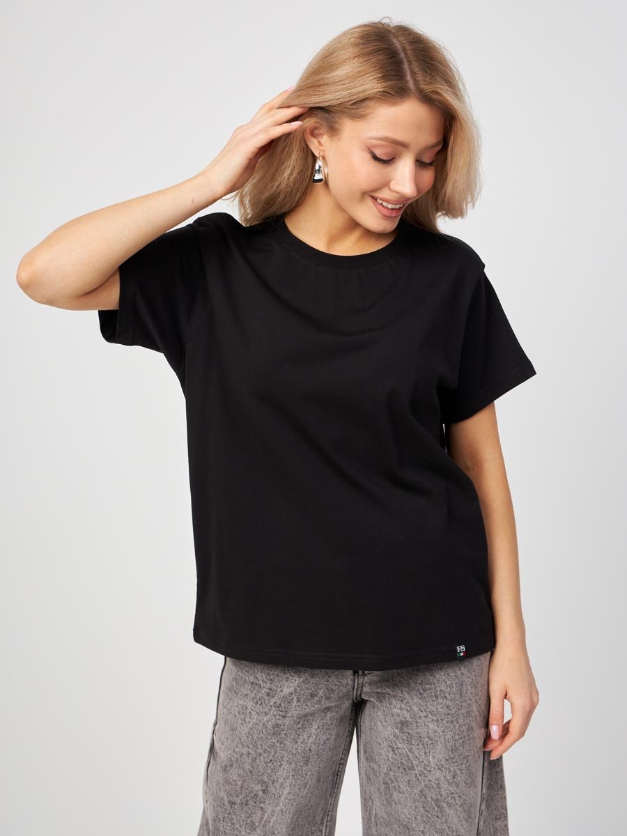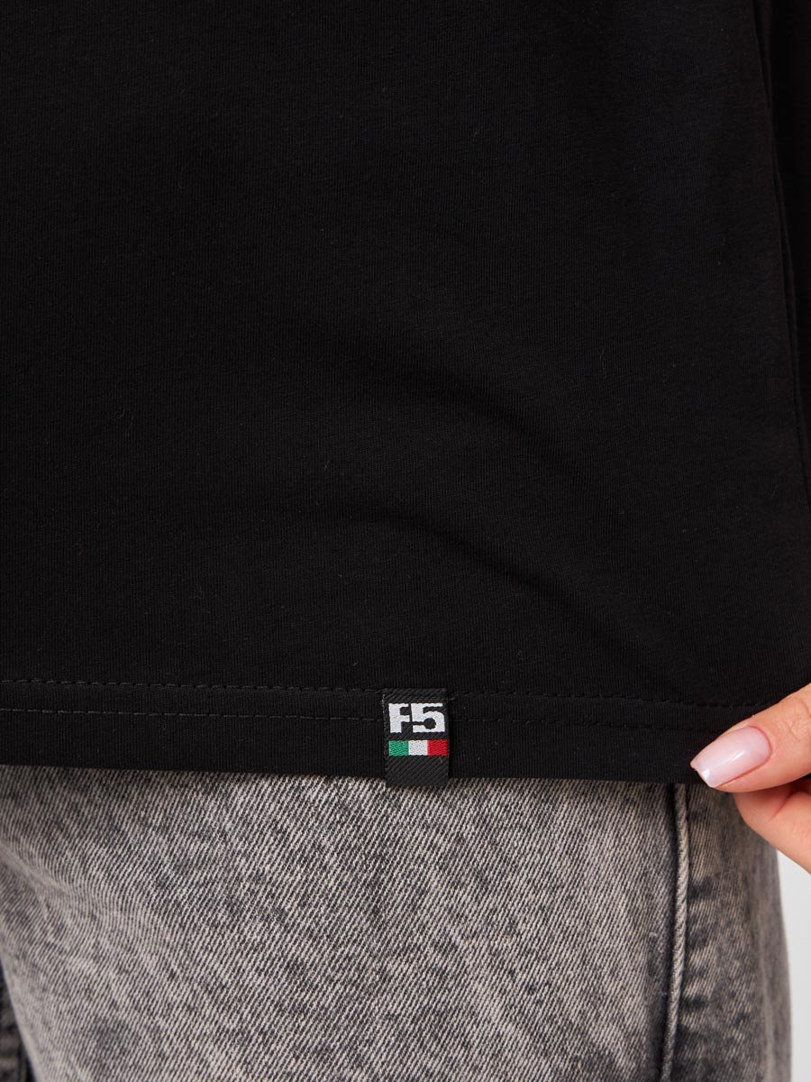 Женская футболка F5, Oversize fit (свободный силуэт), круглый вырез горловины, короткий цельнокроеный рукав. Выполнена из классического трикотажного полотна.
