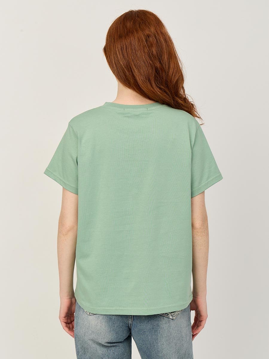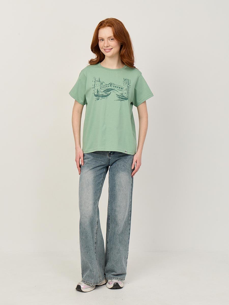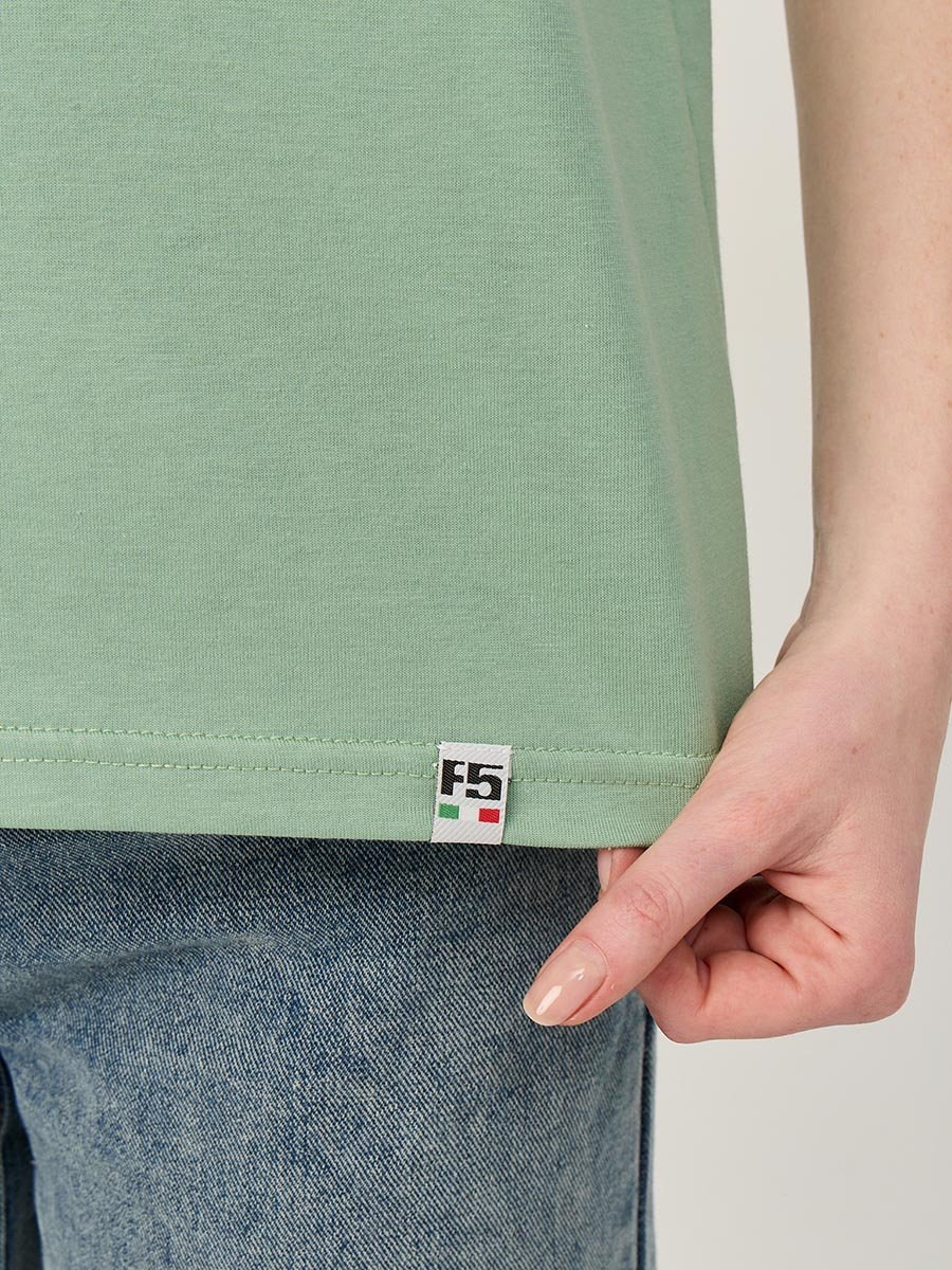 Женская футболка F5, Oversize fit (свободный силуэт), круглый вырез горловины, короткий цельнокроеный рукав. Выполнена из классического трикотажного полотна.