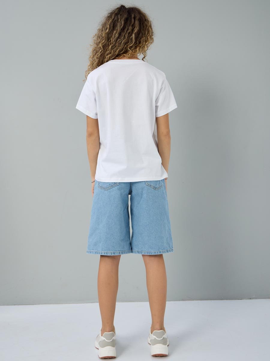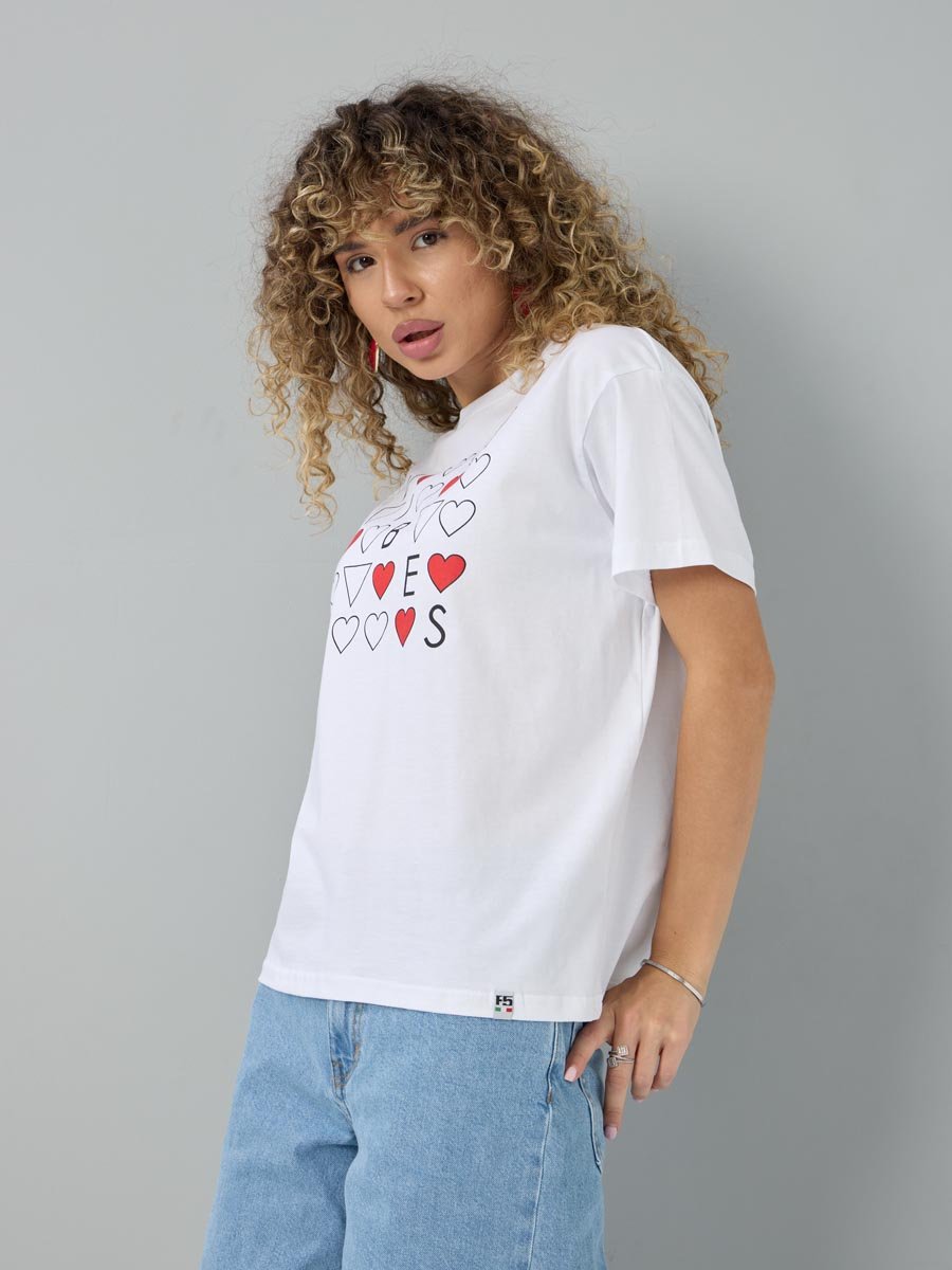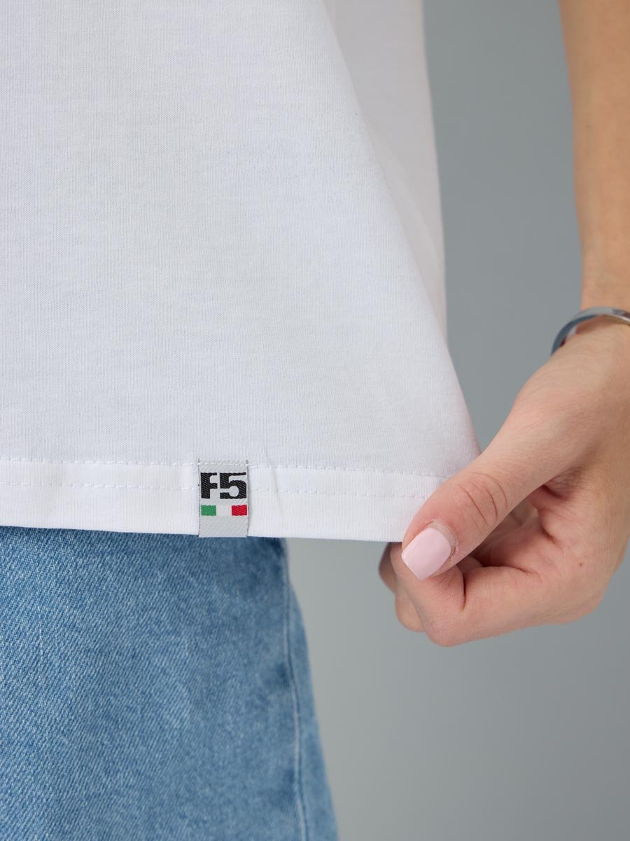 Женская футболка F5, Oversize fit (свободный силуэт), круглый вырез горловины, короткий цельнокроеный рукав. Выполнена из классического трикотажного полотна.