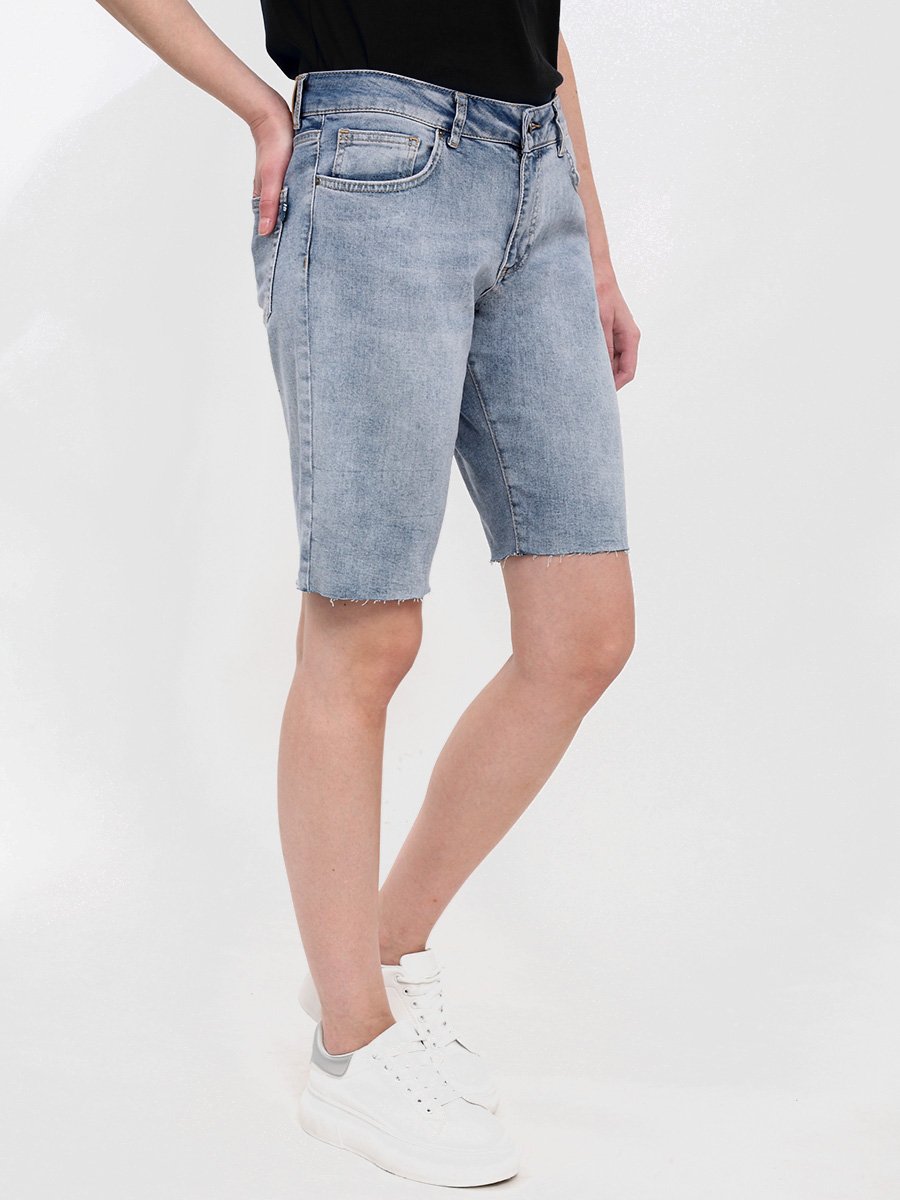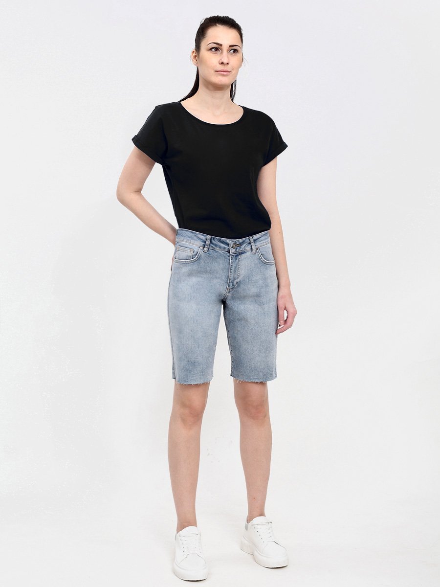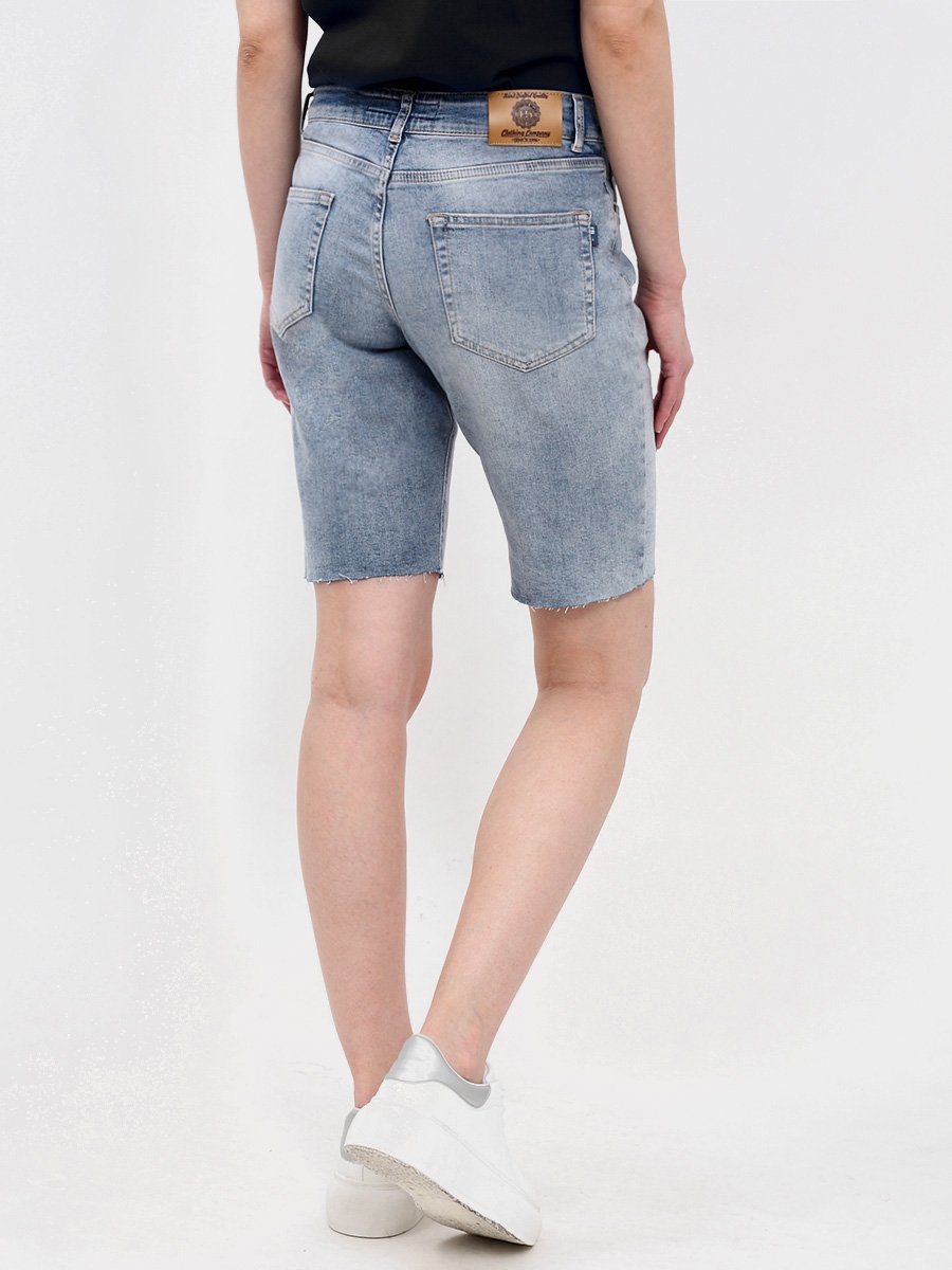 Женские удлиненные шорты с пятью карманами. Посадка Comfort fit (свободные по бедру), зауженные к низу, высокая талия спереди и сзади. Застежка на молнии. Выполнены из облегченной слабоэластичной ткани denim comfort stretch с потертостями и слабовыраженными «усами» спереди и потертостями сзади. Параметры указаны для размера 28.