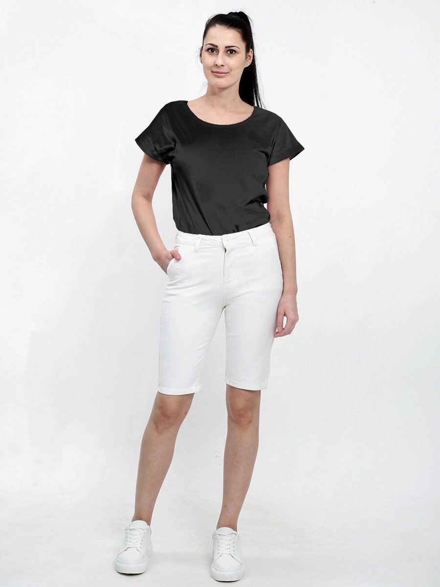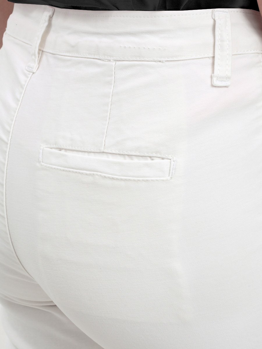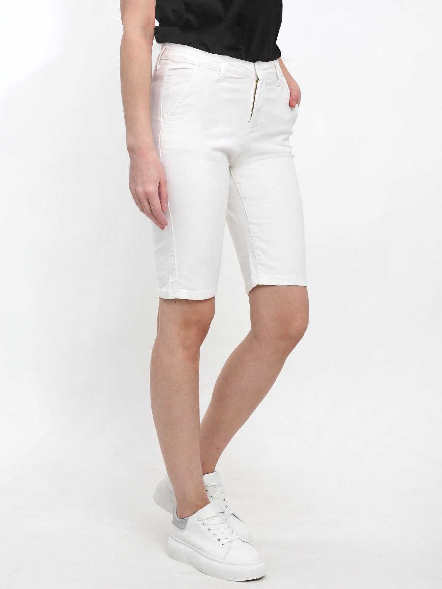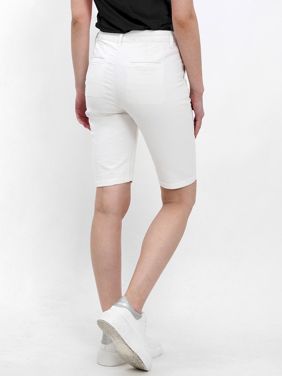 Женские классические шорты Chinos. Посадка Regular fit (полуоблегающие по бедру), заужены к низу. Высокая талия. Застежка на молнии. Сзади прорезные карманы "в листочку". Выполнены из отбеленной эластичной мягкой ткани gabardine stretch. Изделие постирано в готовом виде после пошива. Параметры указаны для размера 28. Длина внутреннего шва для всех размеров - 28,0 см.