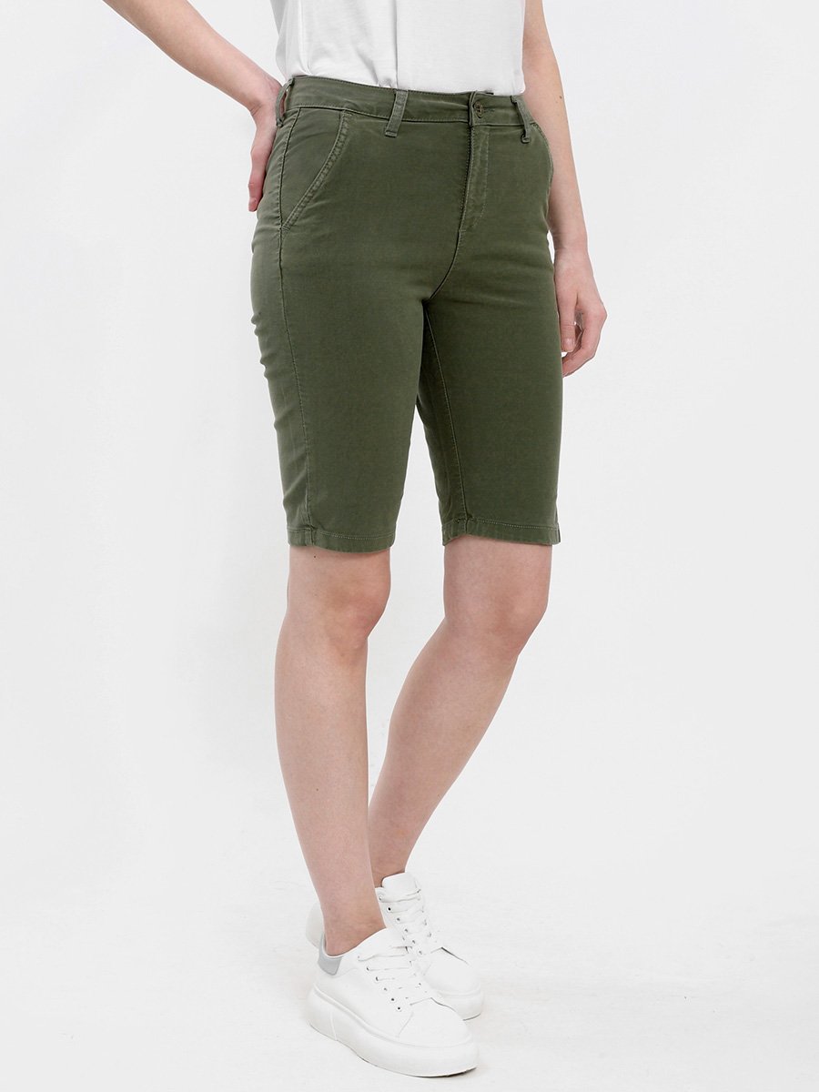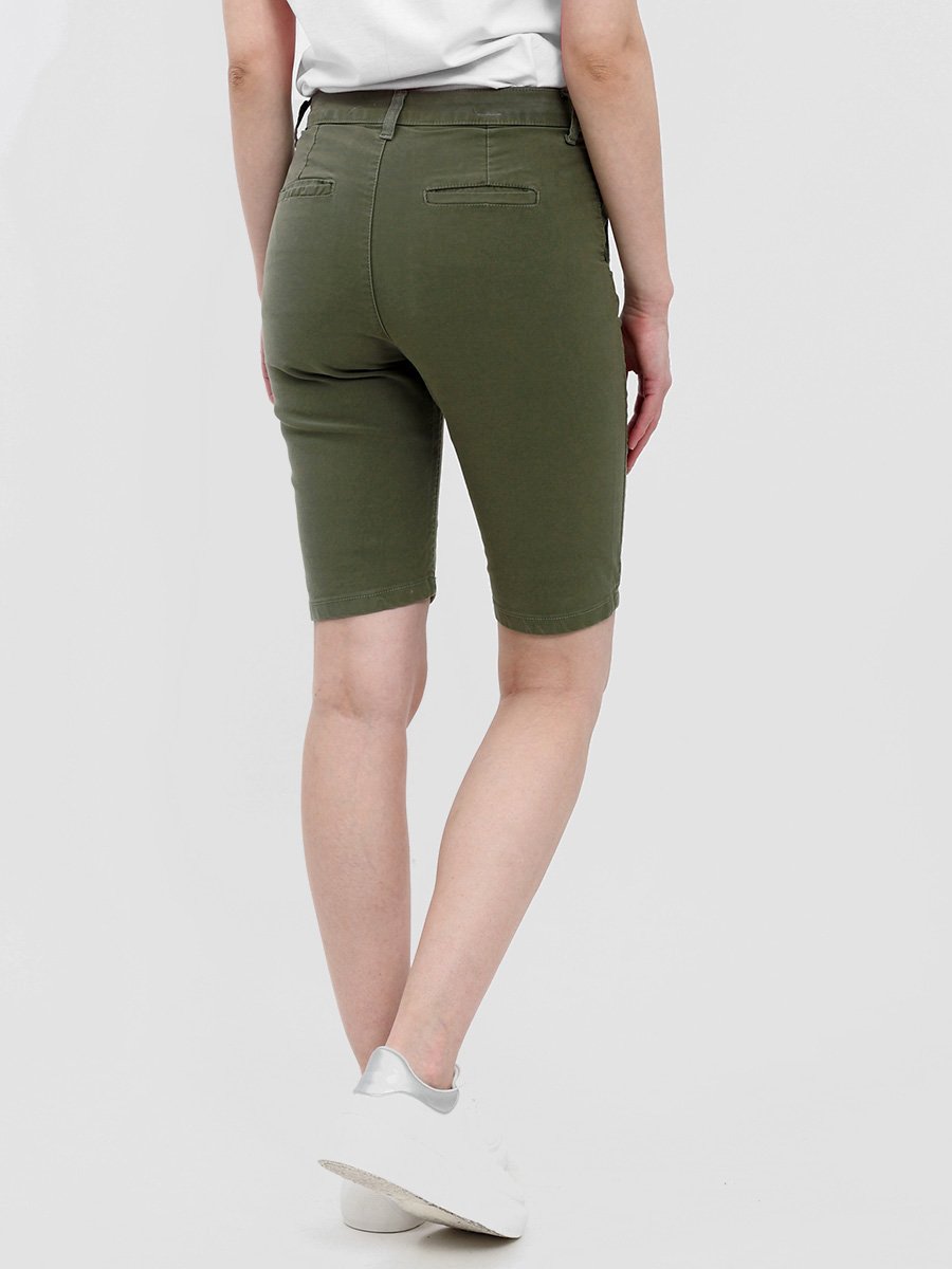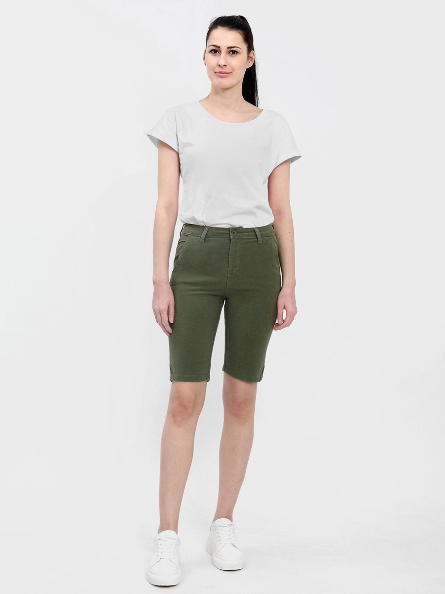 Женские классические шорты Chinos. Посадка Regular fit (полуоблегающие по бедру), заужены к низу. Высокая талия. Застежка на молнии. Сзади прорезные карманы "в листочку". Выполнены из отбеленной эластичной мягкой ткани gabardine stretch. Изделие постирано в готовом виде после пошива. Параметры указаны для размера 28. Длина внутреннего шва для всех размеров - 28,0 см.