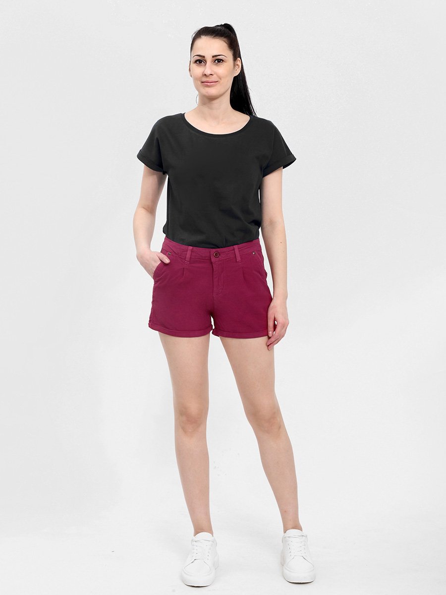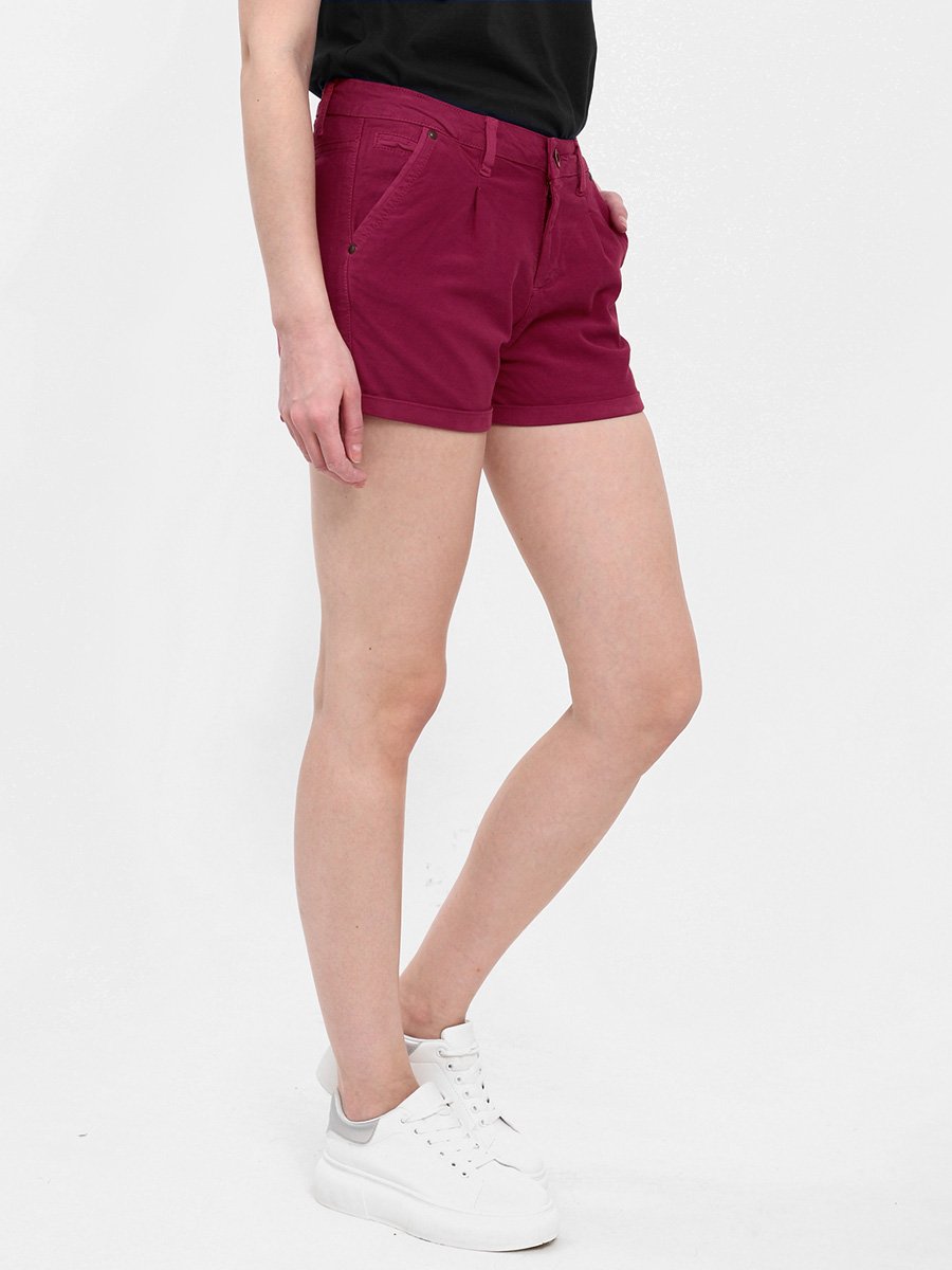 Женские шорты в стиле casual. Посадка Regular fit (полуоблегающие по бедру),  широкие, по низу шорт манжеты. Высокая  талия. Застежка на молнии. Спреди для  свободы движения две скдадки. Сзади  ложные карманы  "в рамку". Выполнены из отбеленной эластичной мягкой ткани gabardine stretch. Изделие постирано в готовом виде после пошива. Параметры указаны для размера 28. Длина внутреннего шва для размеров 25-29 - 10,0 см., для размеров 30-32 - 11,0 см.