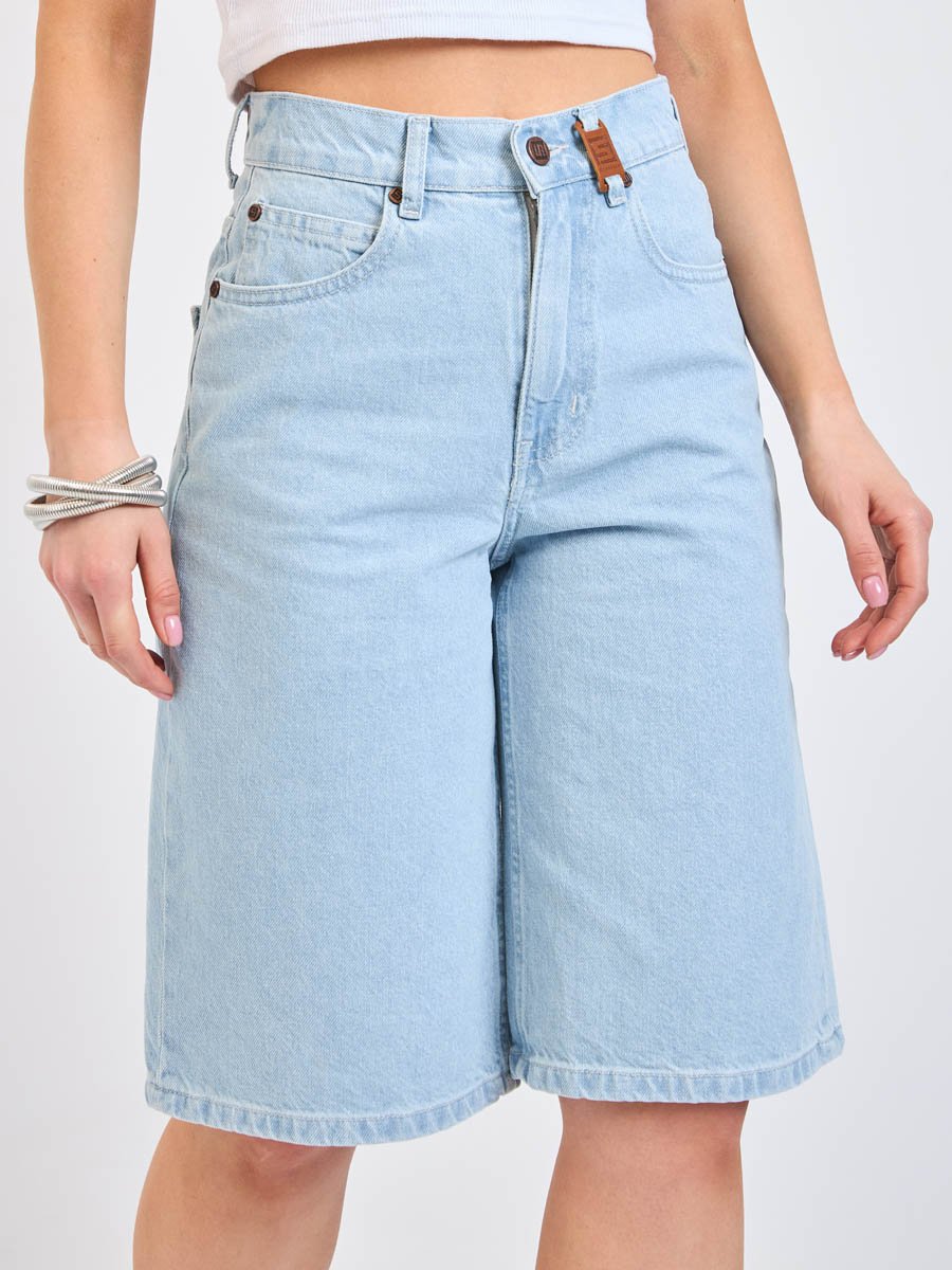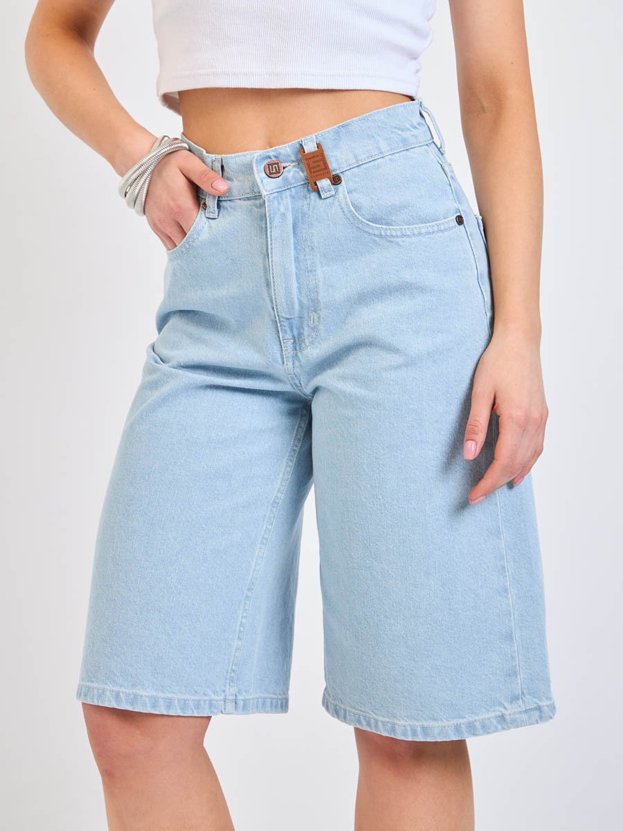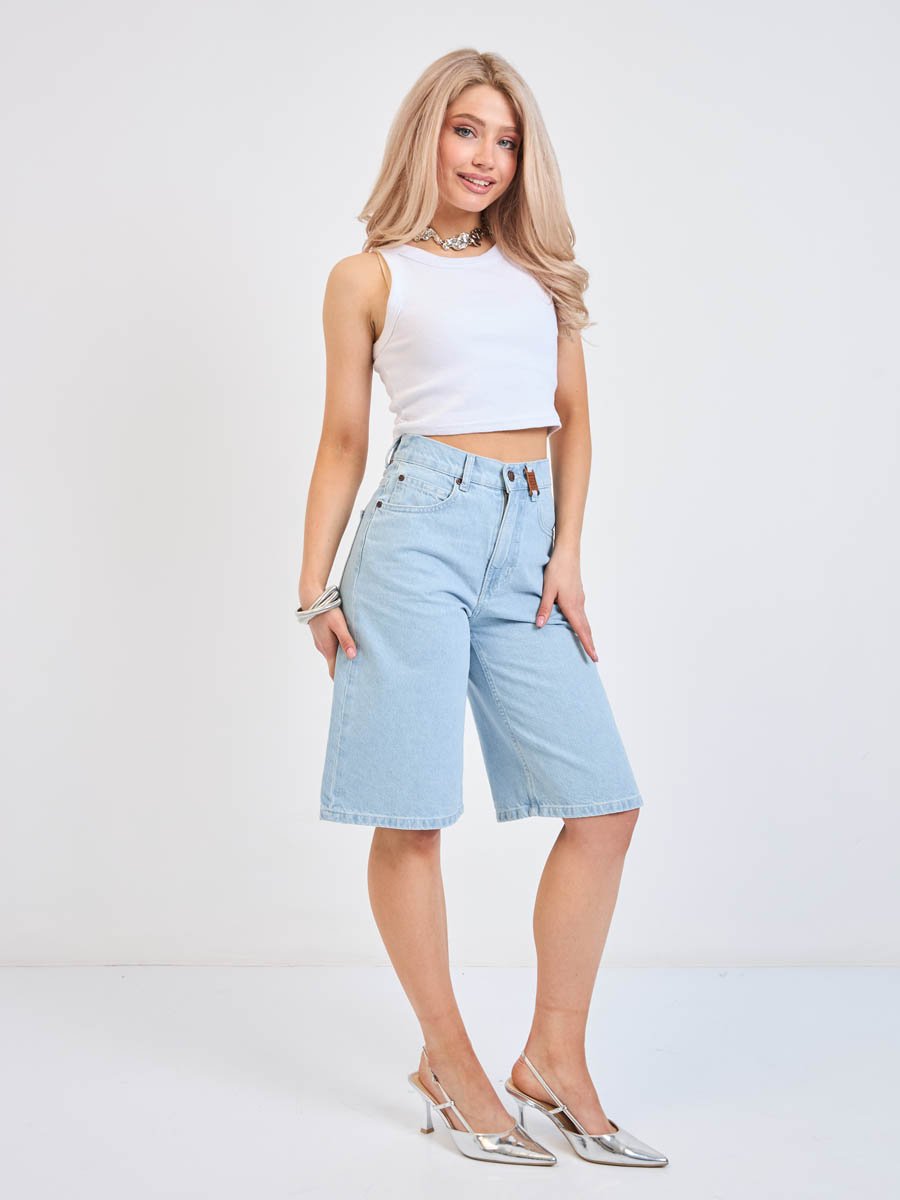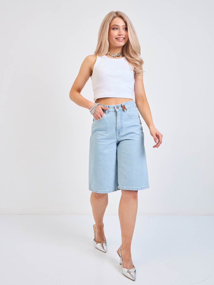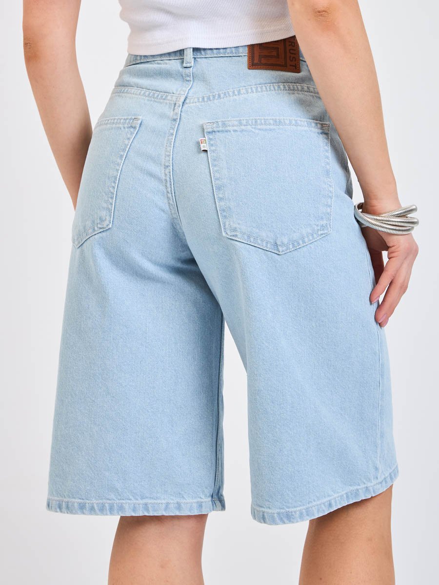 Женские шорты с пятью карманами. Посадка Comfort fit (свободные по бедру), высокая талия спереди и сзади. Свободные по всей длине, широкий низ. Застежка на молнии. Выполнены из x/б ткани denim. Классическая светлая стирка "stone wash"с отбеливателем.
