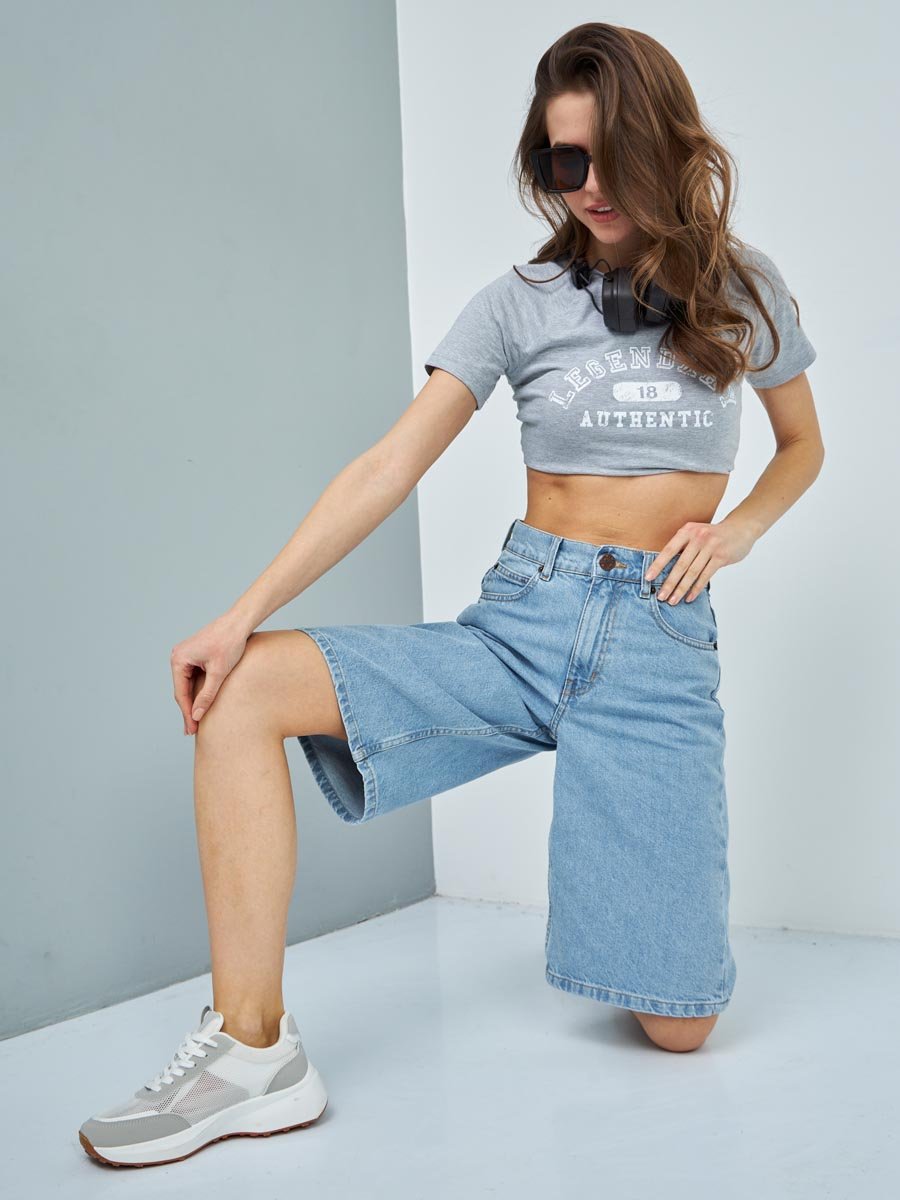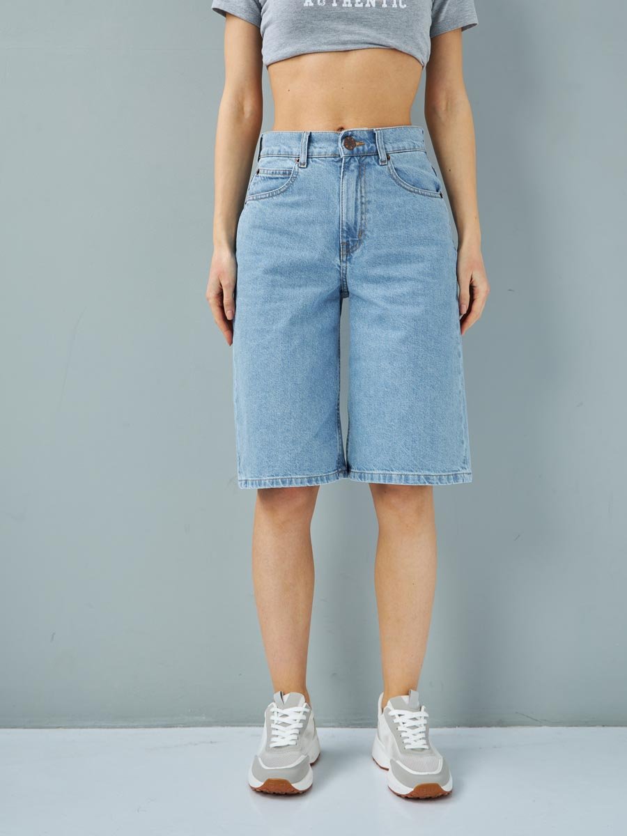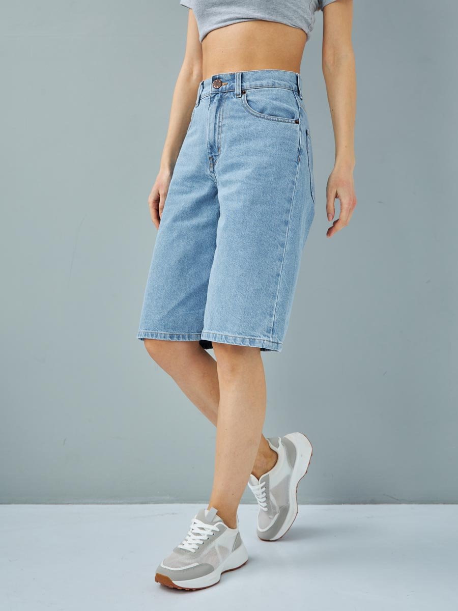 Женские шорты с пятью карманами. Посадка Comfort fit (свободные по бедру), высокая талия спереди и сзади. Свободные по всей длине, широкий низ. Застежка на молнии. Выполнены из x/б ткани denim. Классическая средняя машинная стирка с камнями (stone wash). .