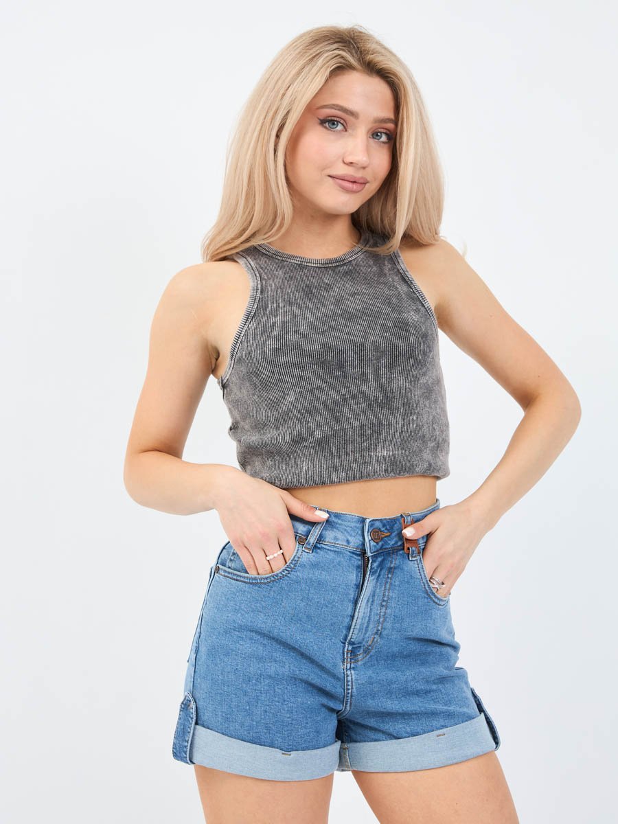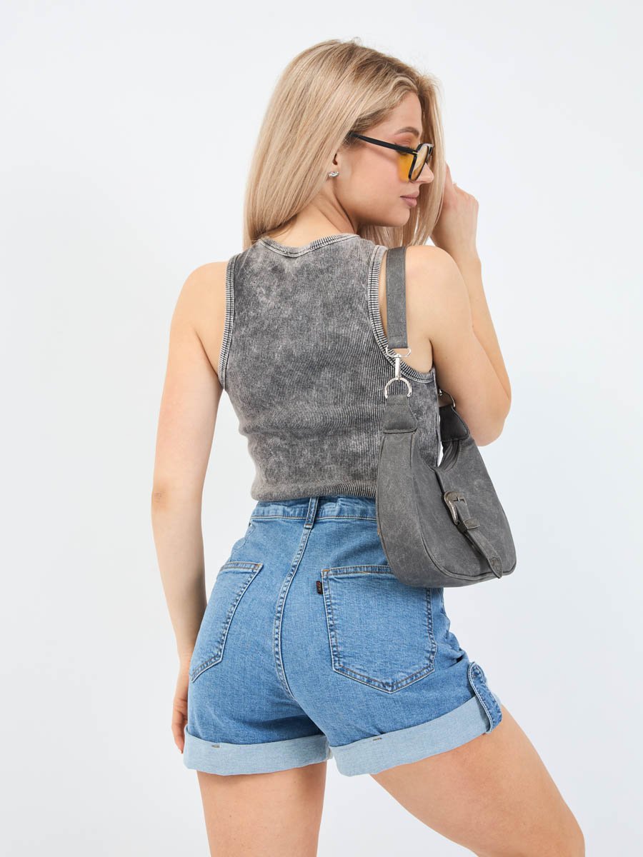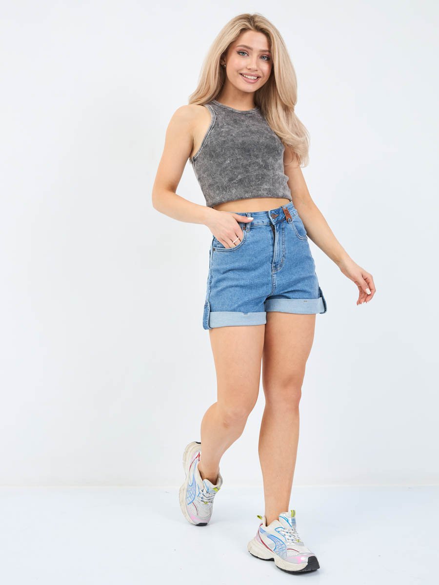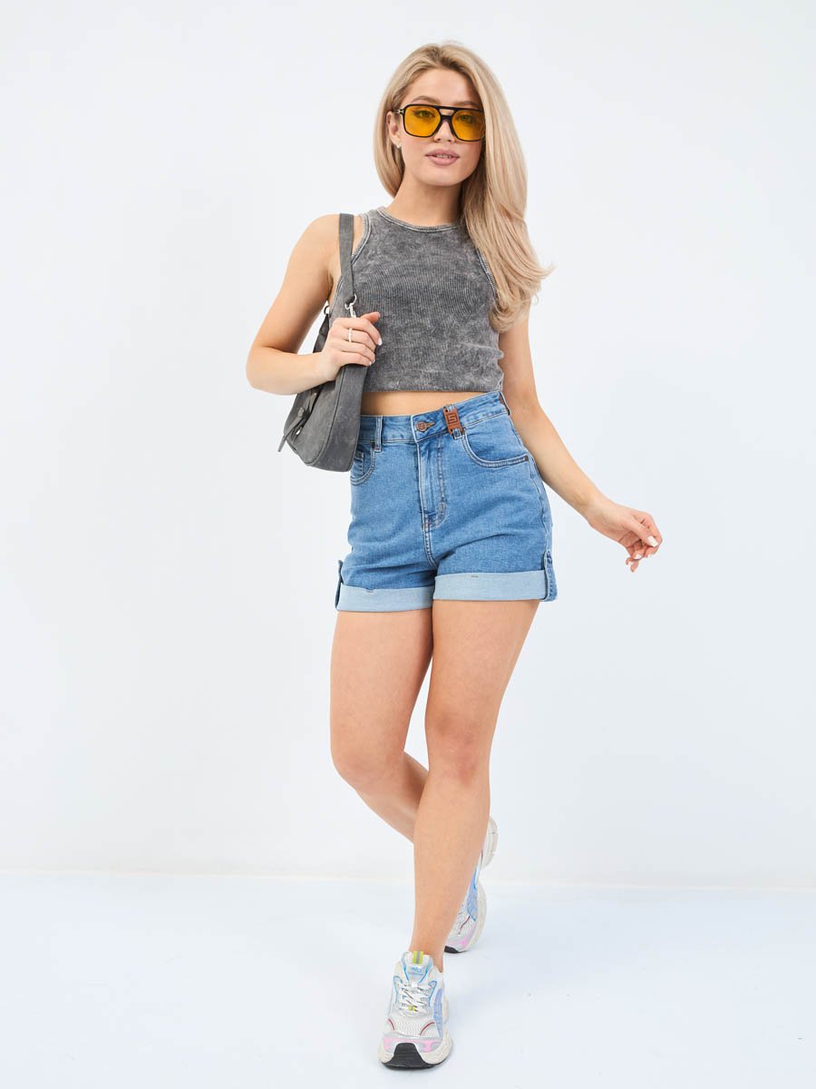 Женские шорты с пятью карманами. Посадка Comfort fit (свободные по бедру), высокая талия спереди и сзади.Для улучшения посадки сзади сделаны две вытачки. Застежка на молнии. Низ шорт подогнут изнаночной стороной ткани " на лицо". Выполнены из слабоэластичной ткани denim comfort stretch. Классическая средняя машинная стирка с камнями (stone wash).